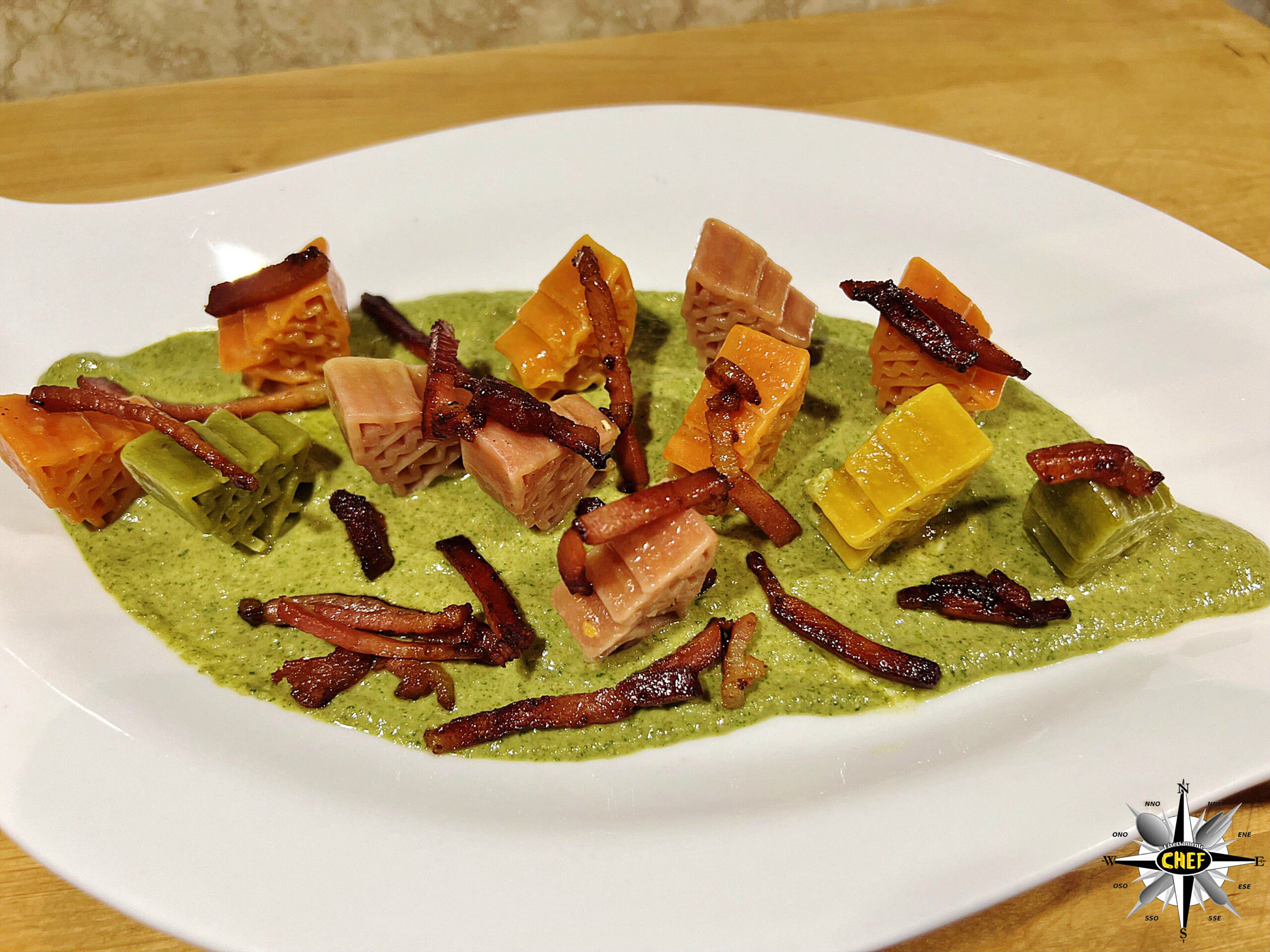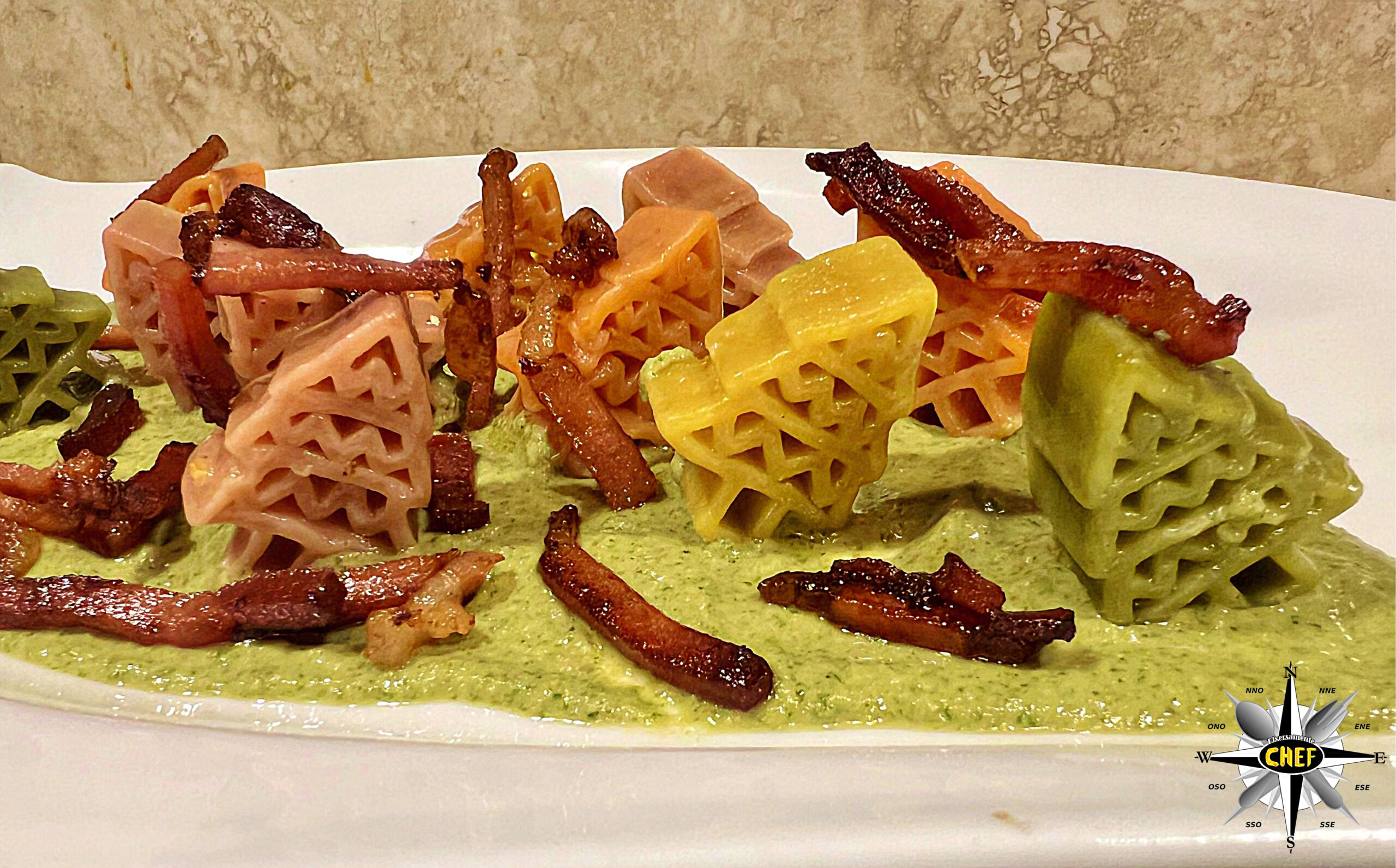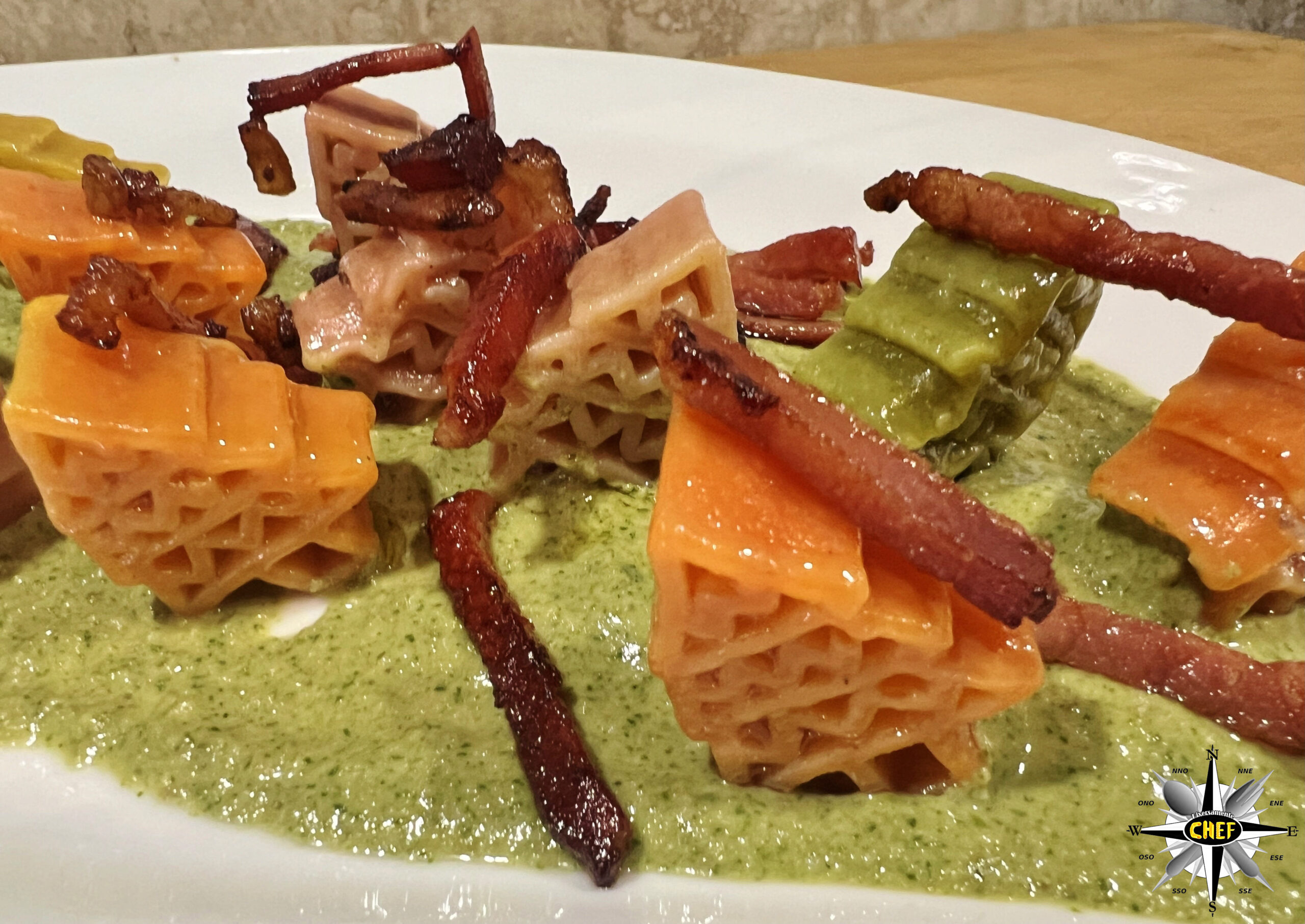 Gli “Alberelli con pesto di capperi di Linosa e fiammiferi di Culatello di Zibello” propongono inoltre un insolito formato di pasta a forma di albero.