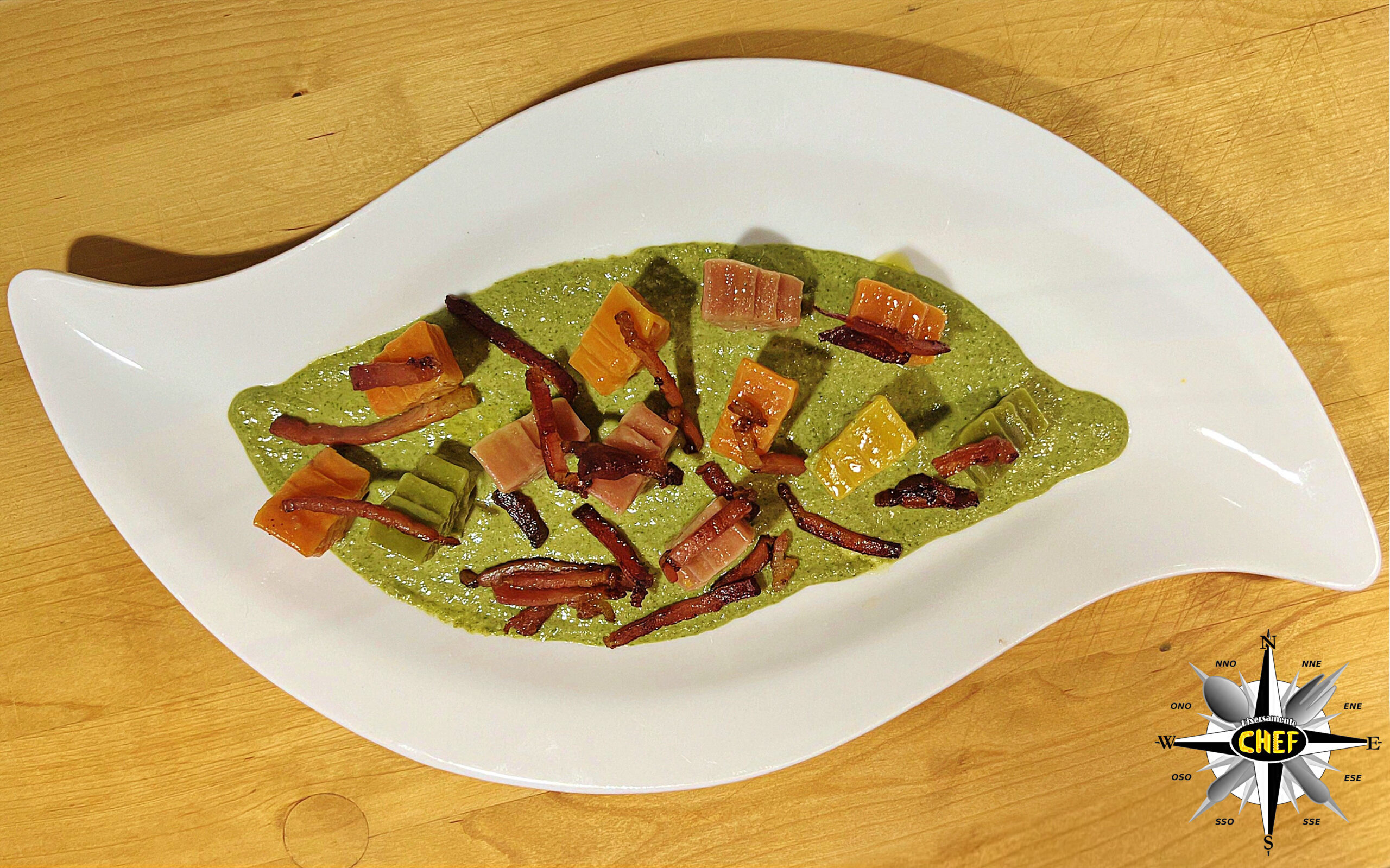Riempire il fondo di un piatto bianco (a forma di foglia) con uno strato di pesto, dallo spessore di circa mezzo centimetro.
