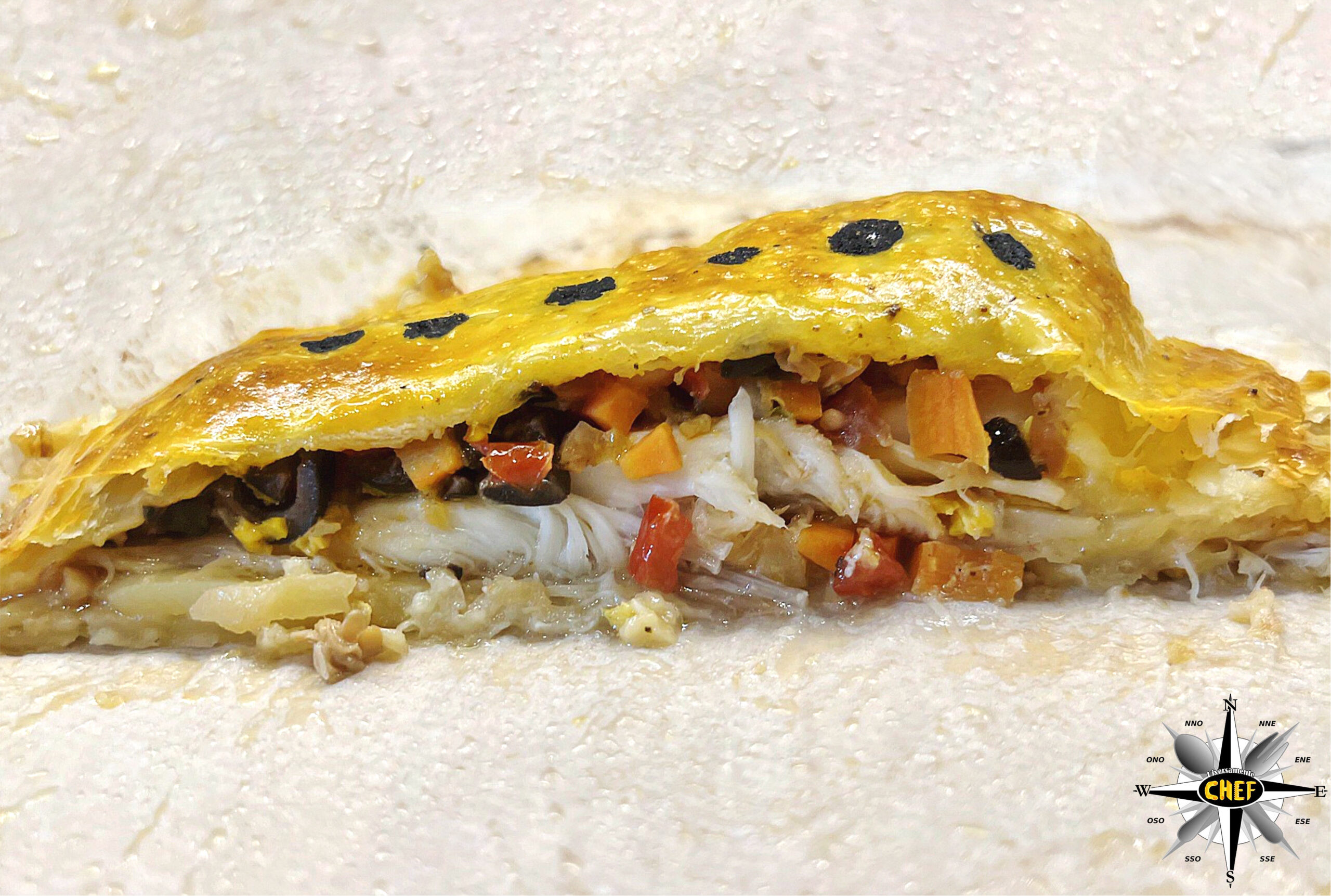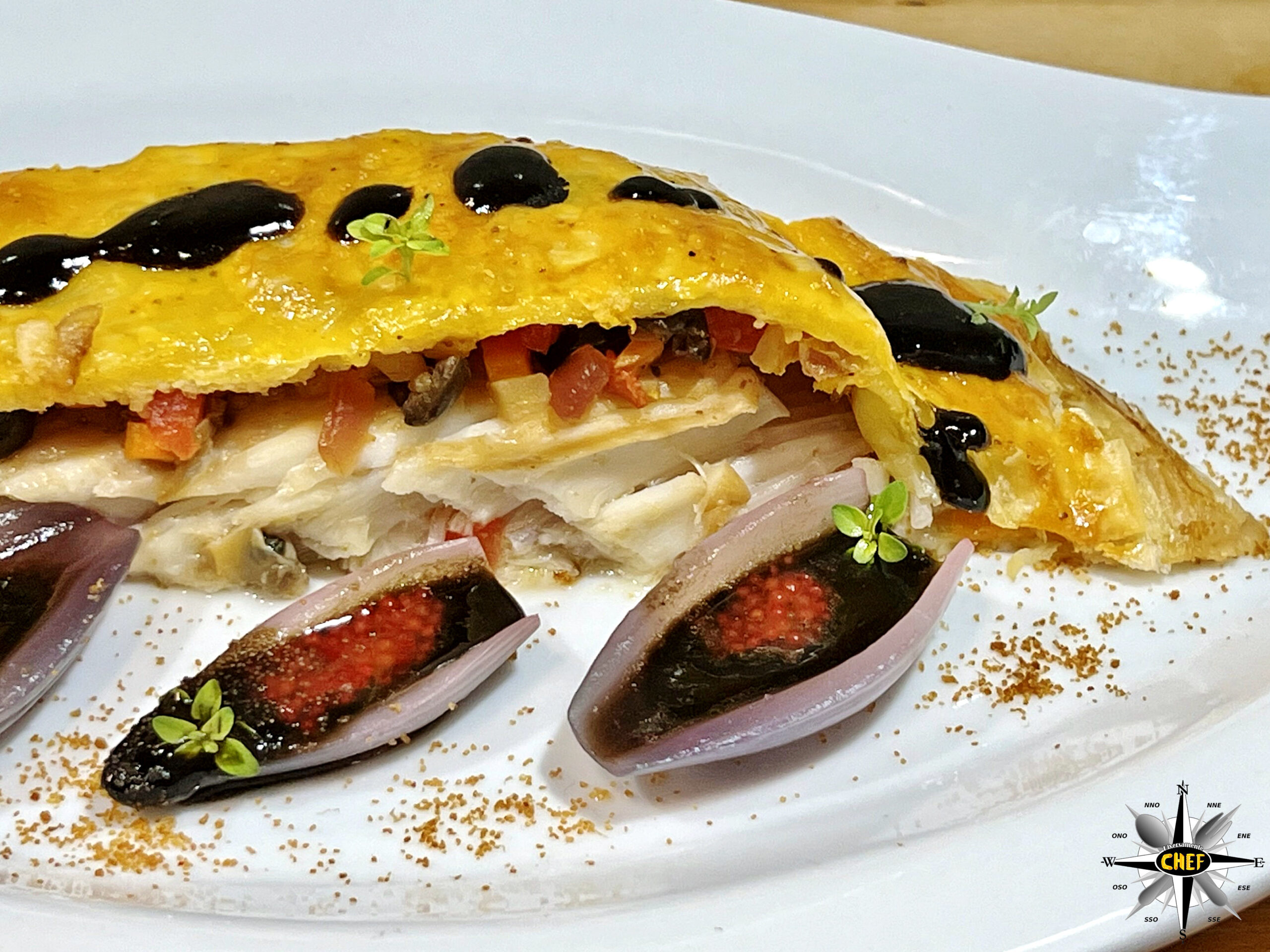 Nelle nostre “Ali di razza in crosta di pasta brisée, con brunoise di verdure, uova di capelin, bottarga di muggine e timo fresco” abbiamo utilizzato la pasta brisée nella classica preparazione del pesce in crosta.
