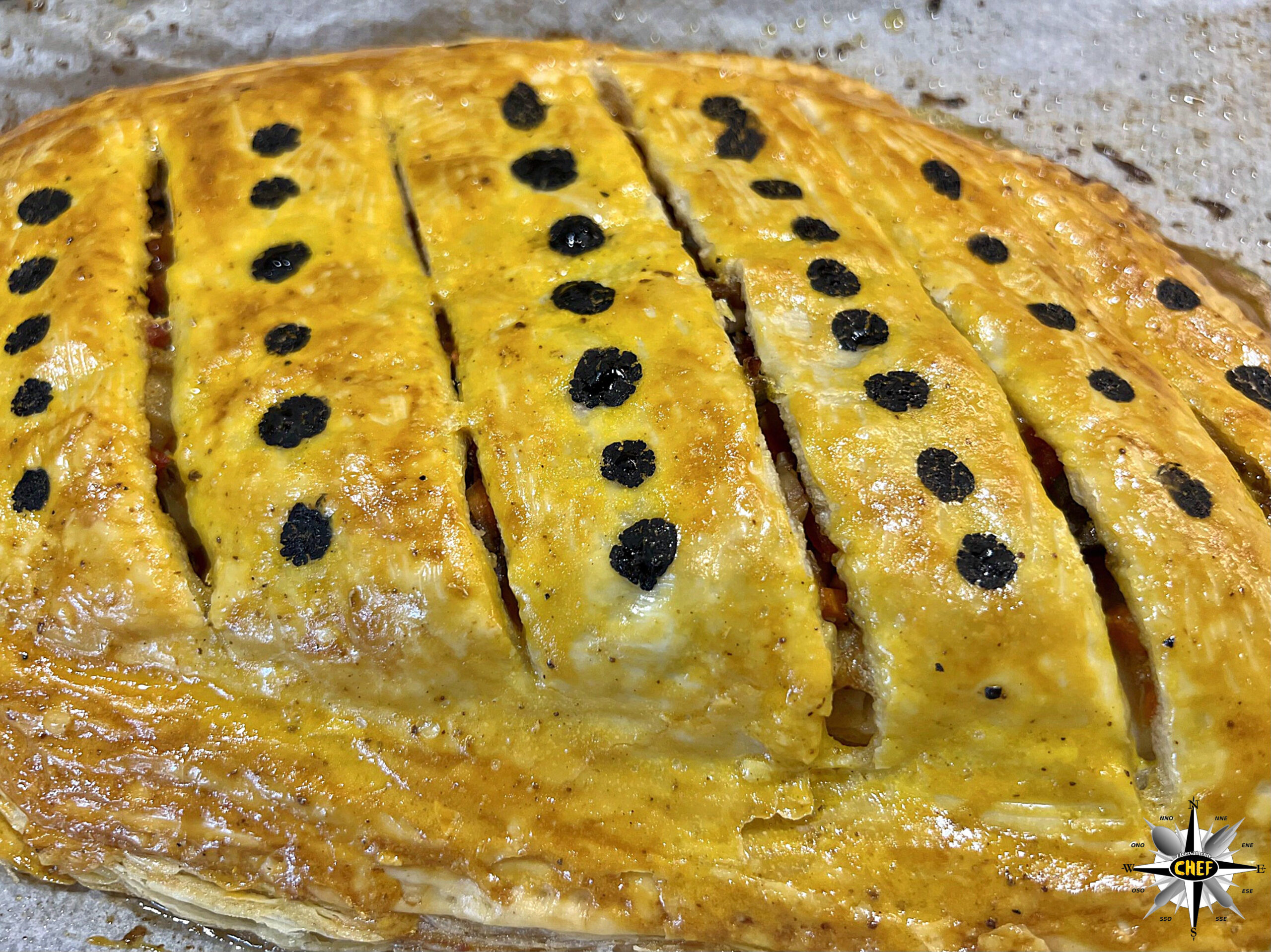 A metà cottura praticare delle incisioni trasversali sulla superficie della sfoglia che, oltre a favorire la fuoriuscita dei vapori dall’interno, risulteranno utili per tagliare le varie porzioni prima di impiattare.