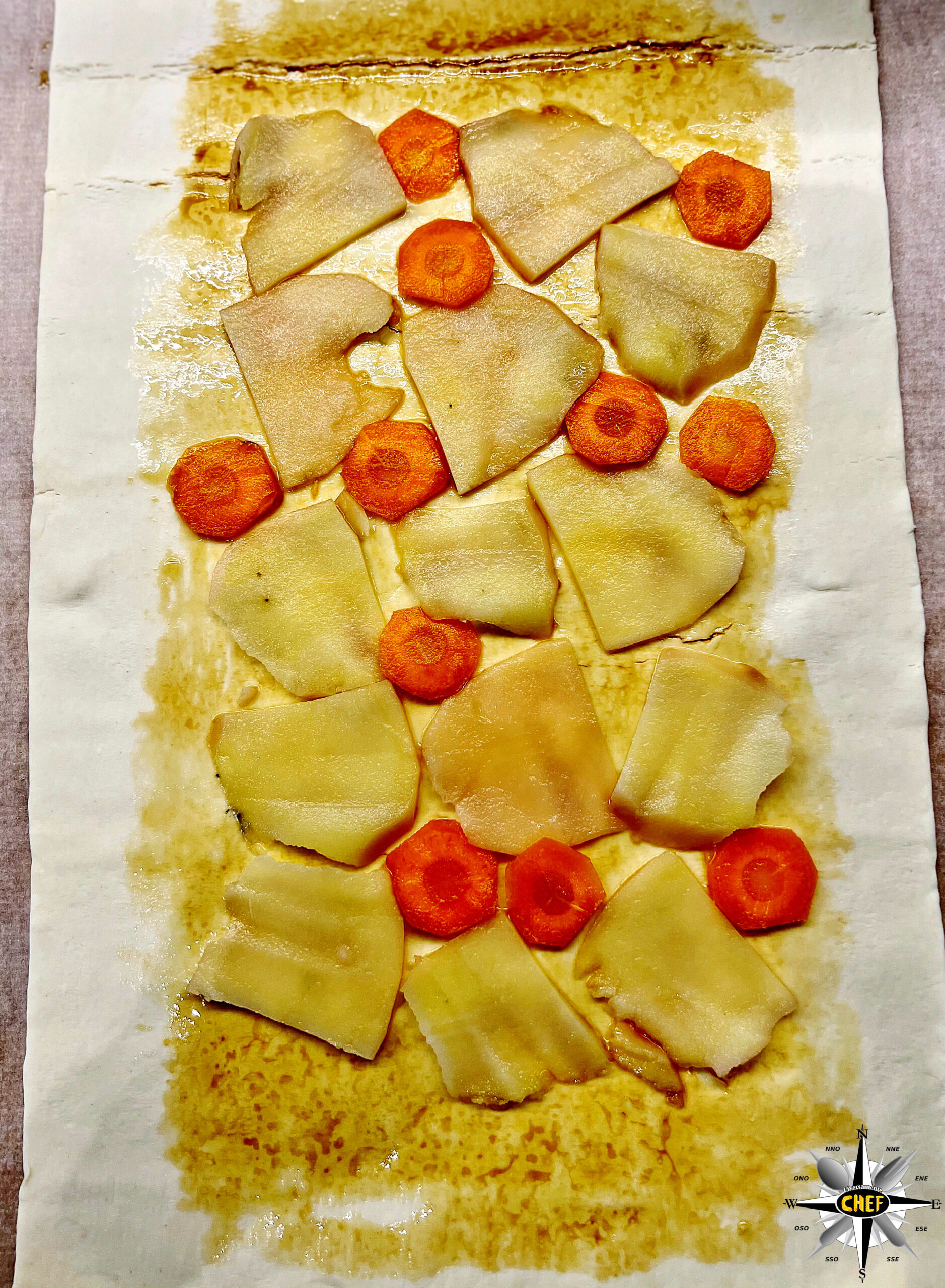 Deporre sopra le patate li ali di razza, ricoperte con la brunoise di verdure e le olive, e coprire i vari ingredienti con una seconda sfoglia di pasta brisée.