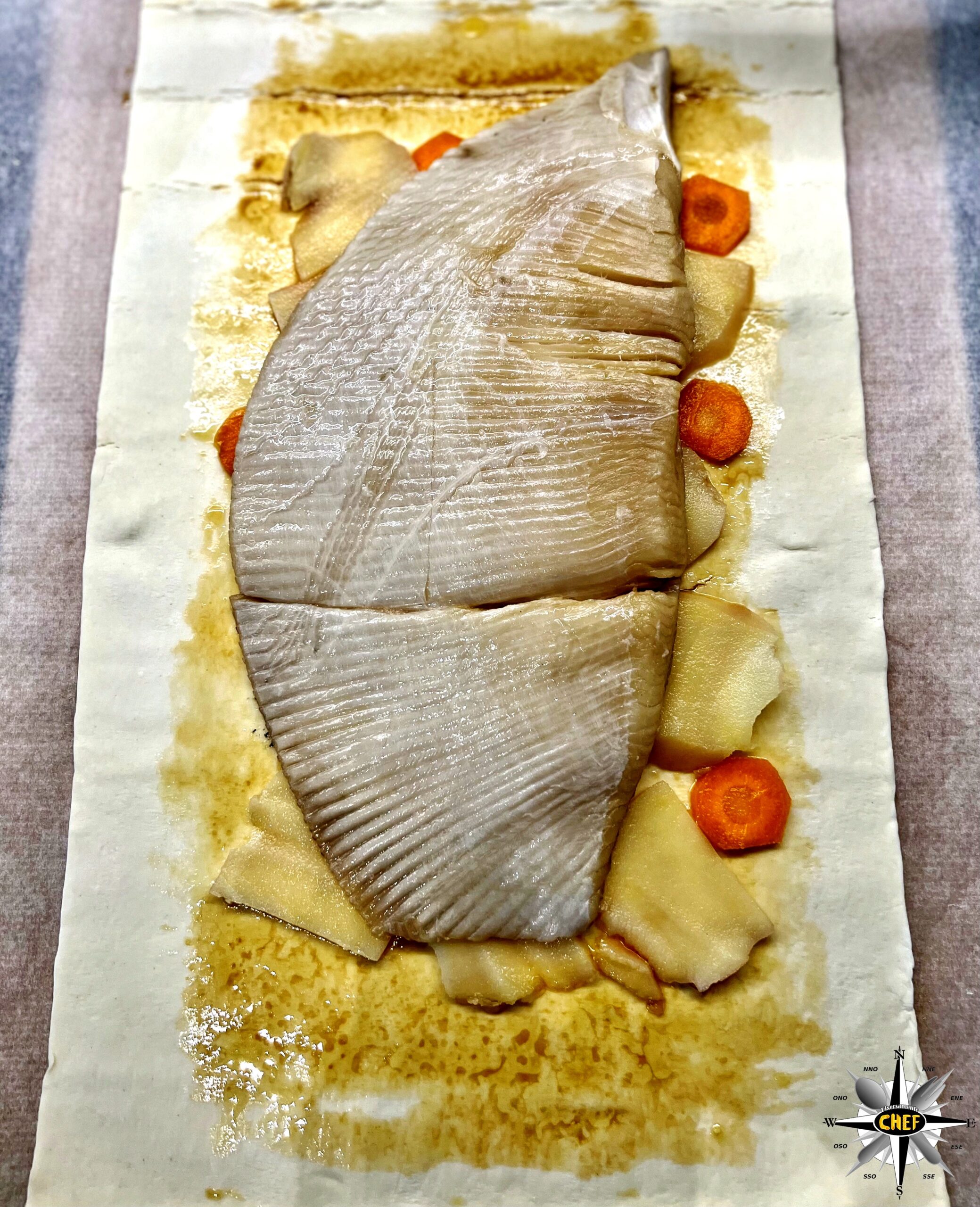 Per le nostre “Ali di razza in crosta di pasta brisée, con brunoise di verdure, uova di capelin, bottarga di muggine e timo fresco” abbiamo utilizzato la pasta brisée nella classica preparazione del pesce in crosta, per realizzare un appetitoso secondo a base di ali di razza.