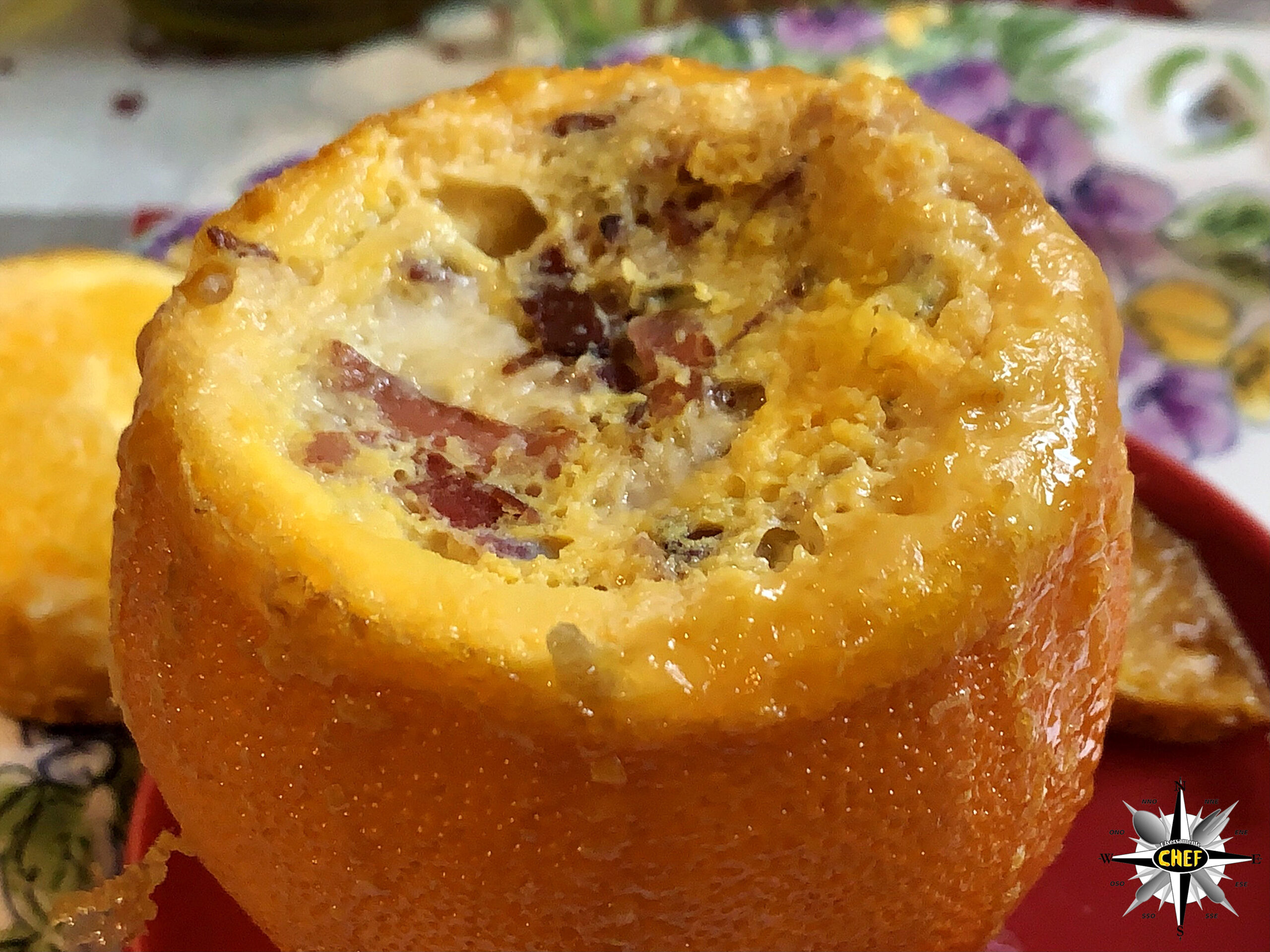 Mentre nel frattempo si mette a bollire (10 minuti) l’uovo da utilizzare sodo. Versare tutto il contenuto all’interno dell’arancia e infornare (180°, 45 minuti, forno statico), senza chiudere la calotta sommitale.