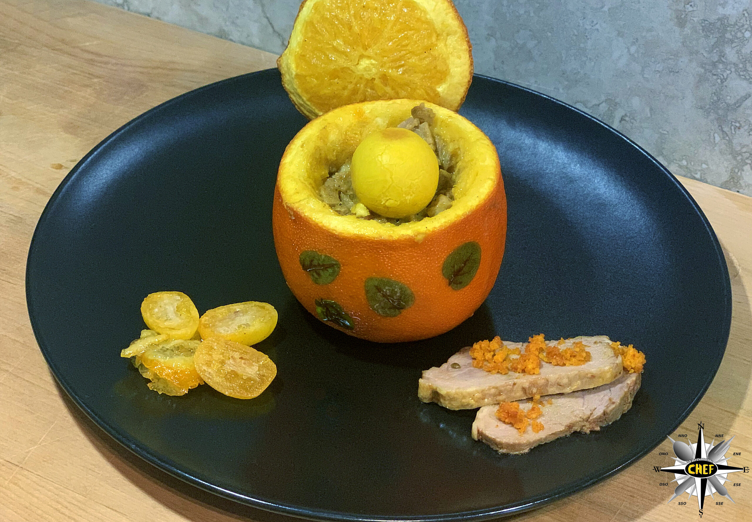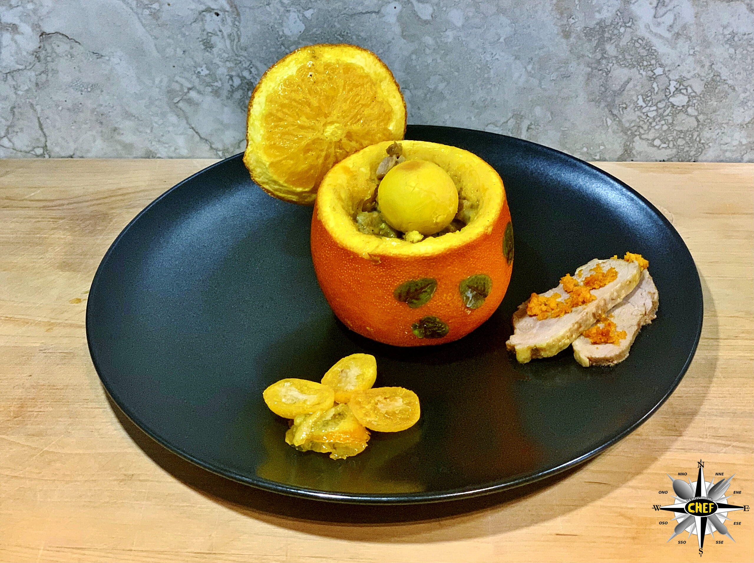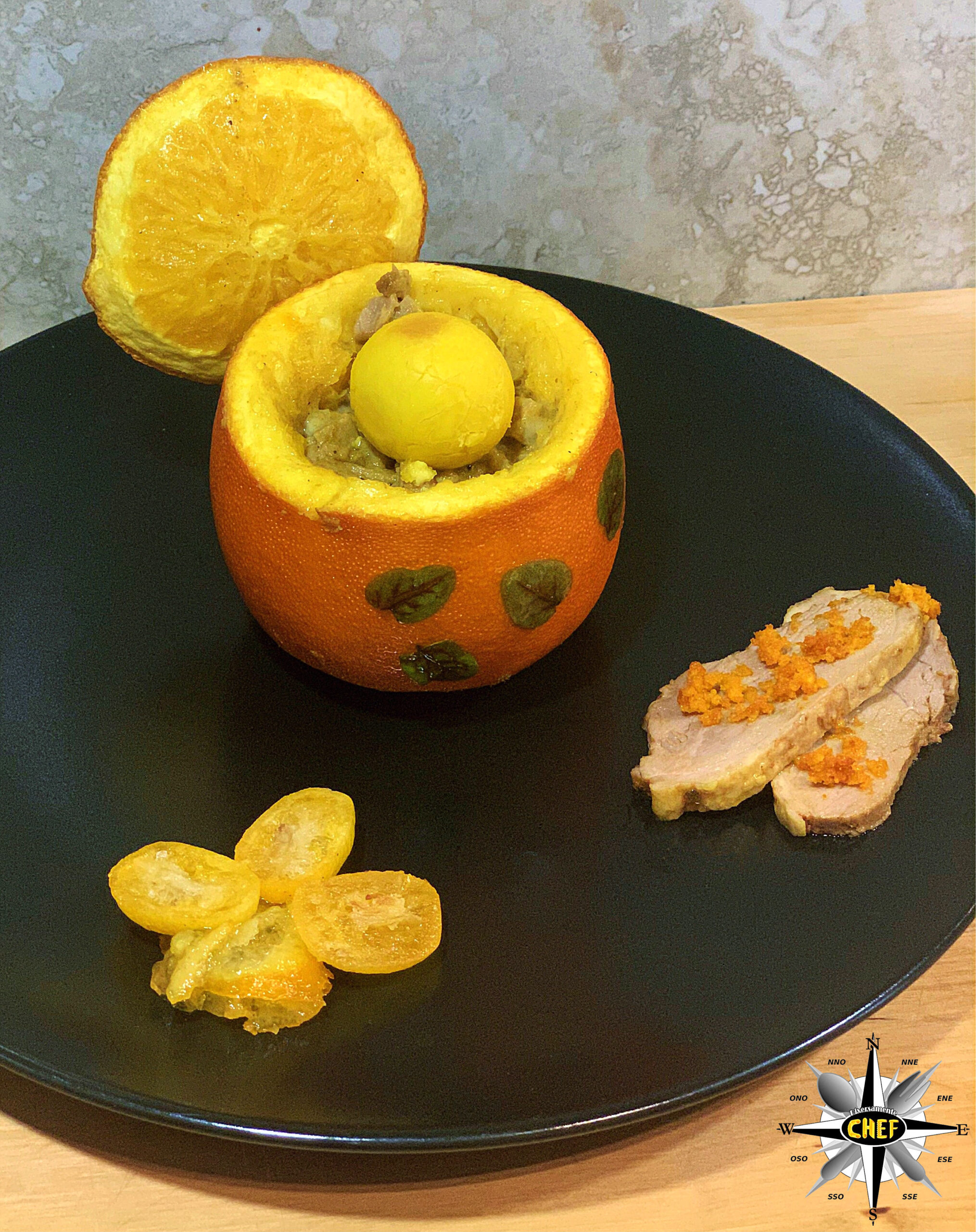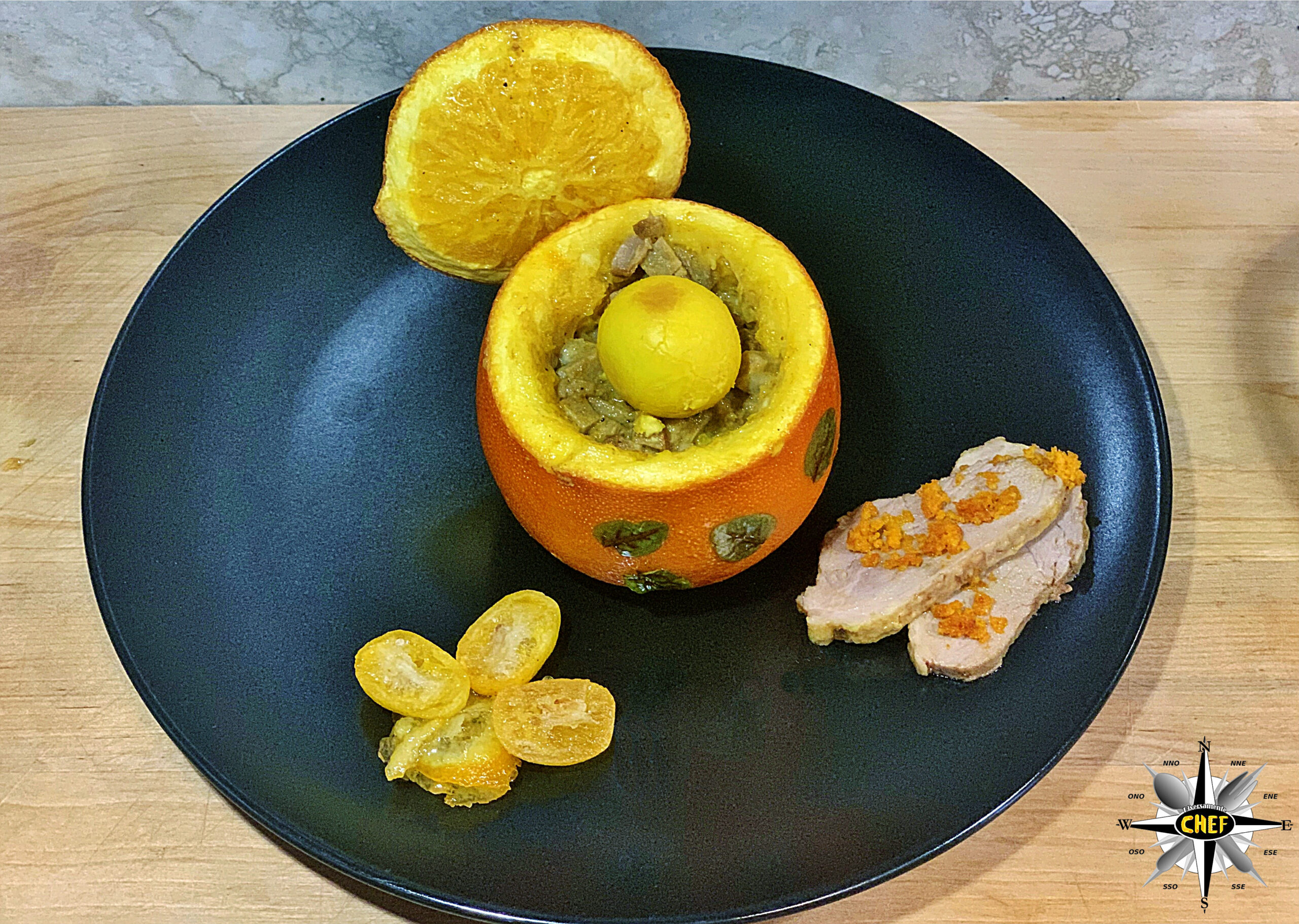 Per la nostra “Anatra all’arancia con kumquat disidratato e Cardenal Mendoza” il gustoso volatile si è trasferito all’interno dell’agrume per trasformarsi in una “Anatra nell’arancia”.