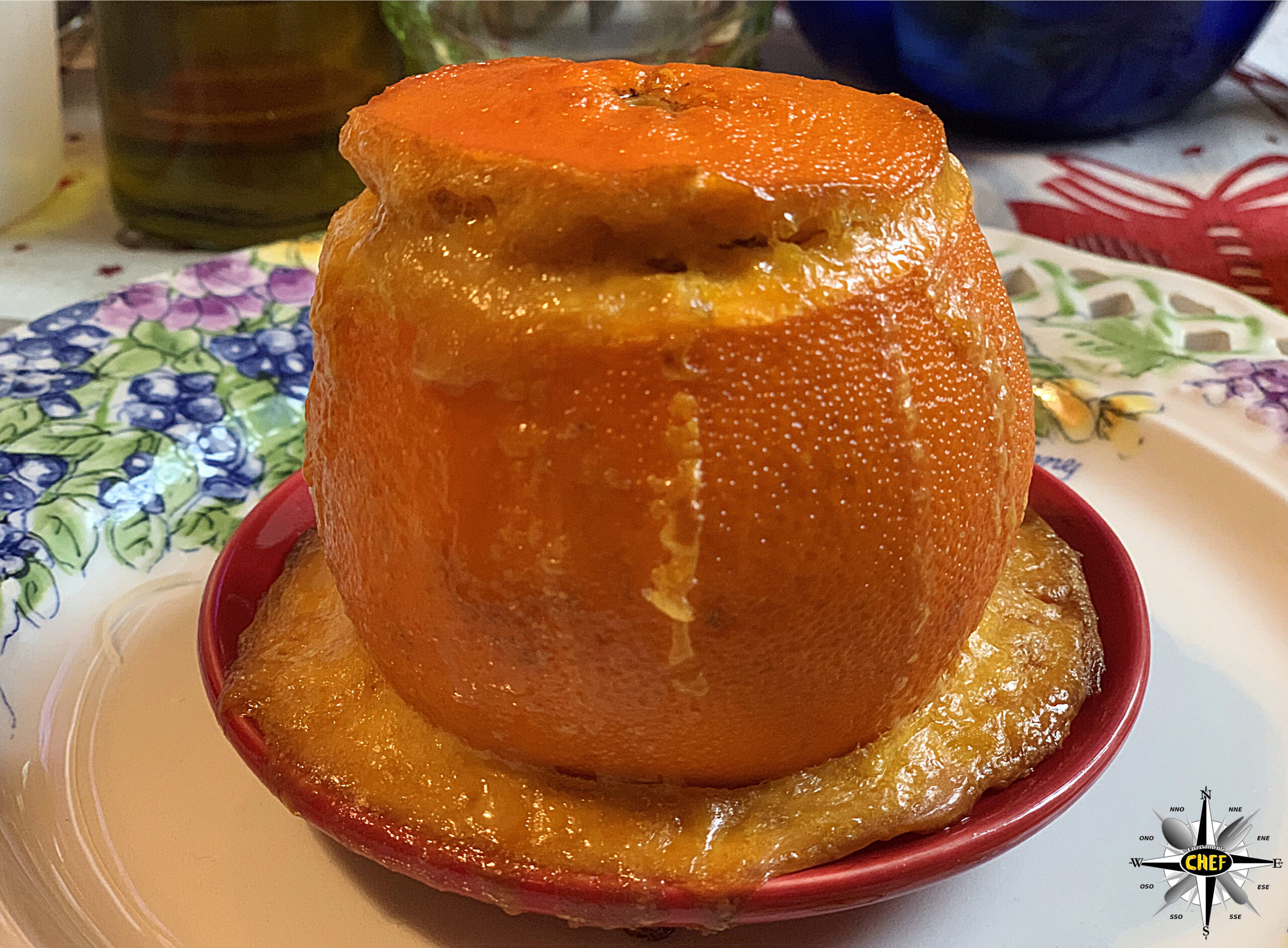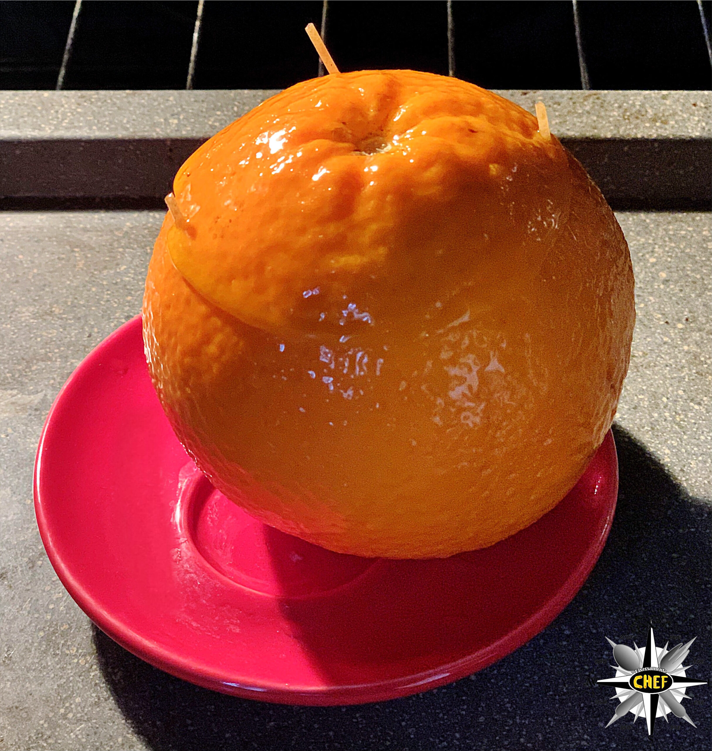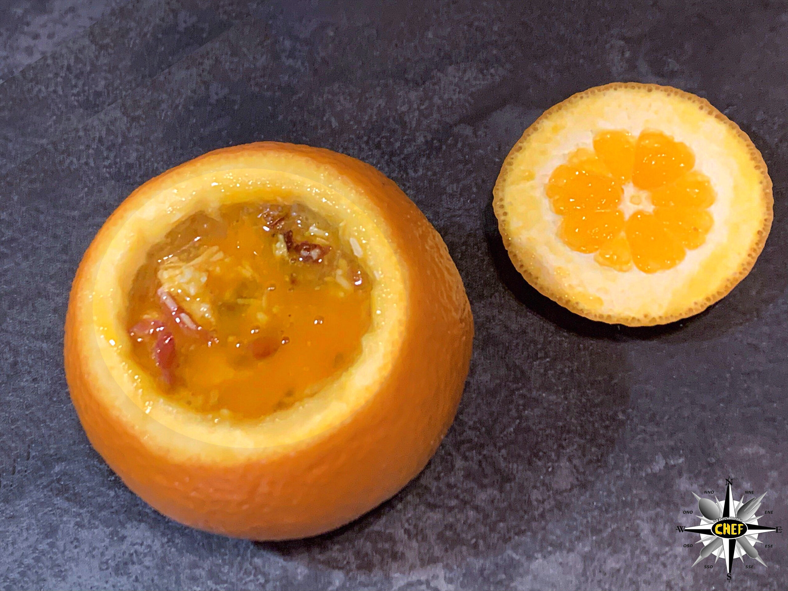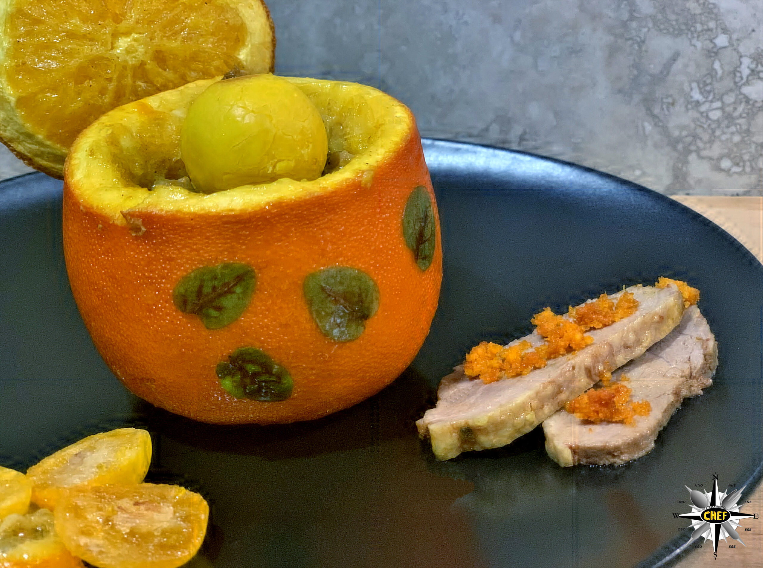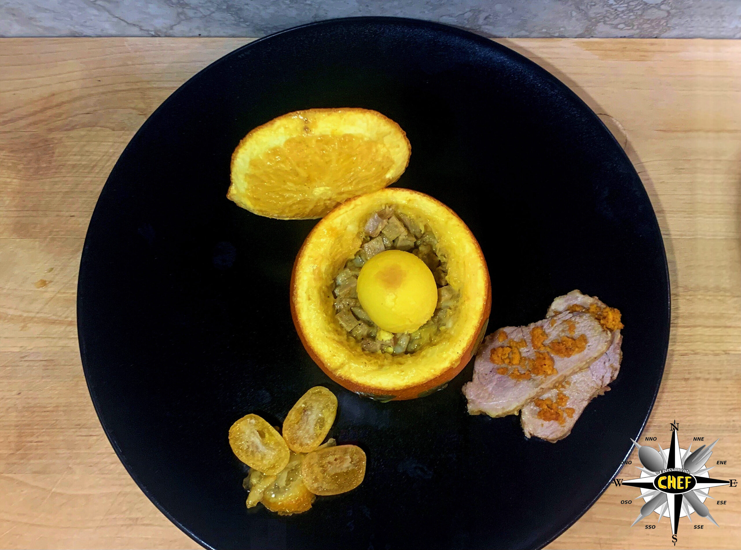 Per la nostra “Anatra all’arancia con kumquat disidratato e Cardenal Mendoza” il gustoso volatile si è trasferito all’interno dell’agrume per trasformarsi in una “Anatra nell’arancia”.