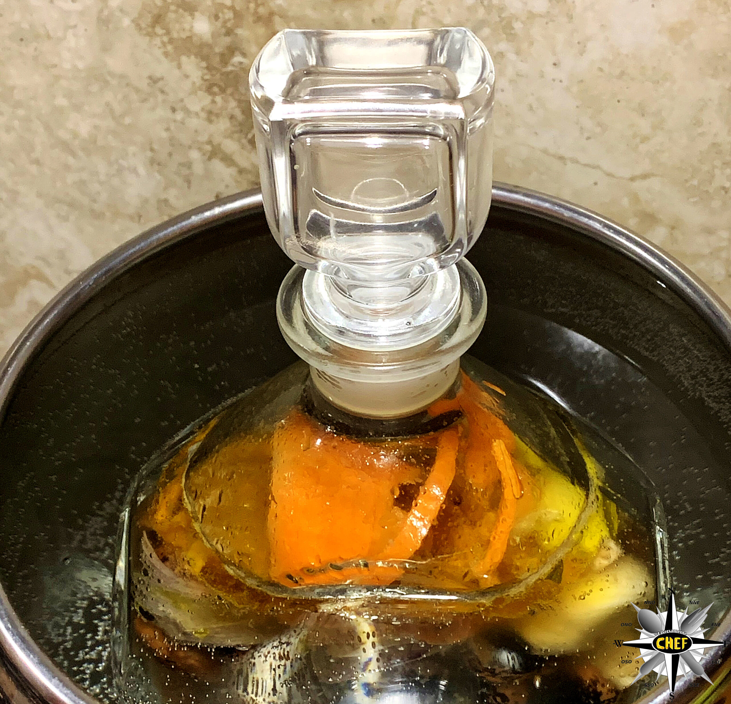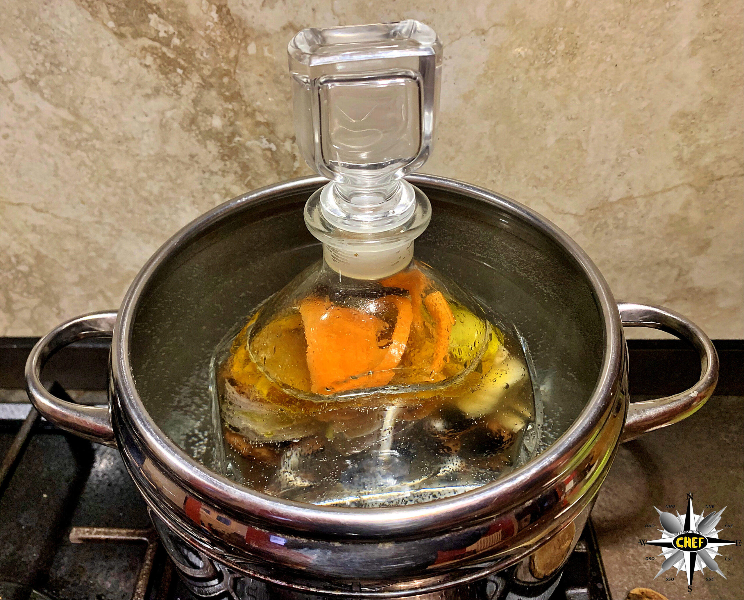Aggiungere gli altri ingredienti e mettere la bottiglia in una pentola piena d’acqua, lasciando scoperta la parte sommitale del recipiente in maniera tale che il livello di acqua nella pentola corrisponda approssimativamente al livello del liquido presente nella bottiglia.