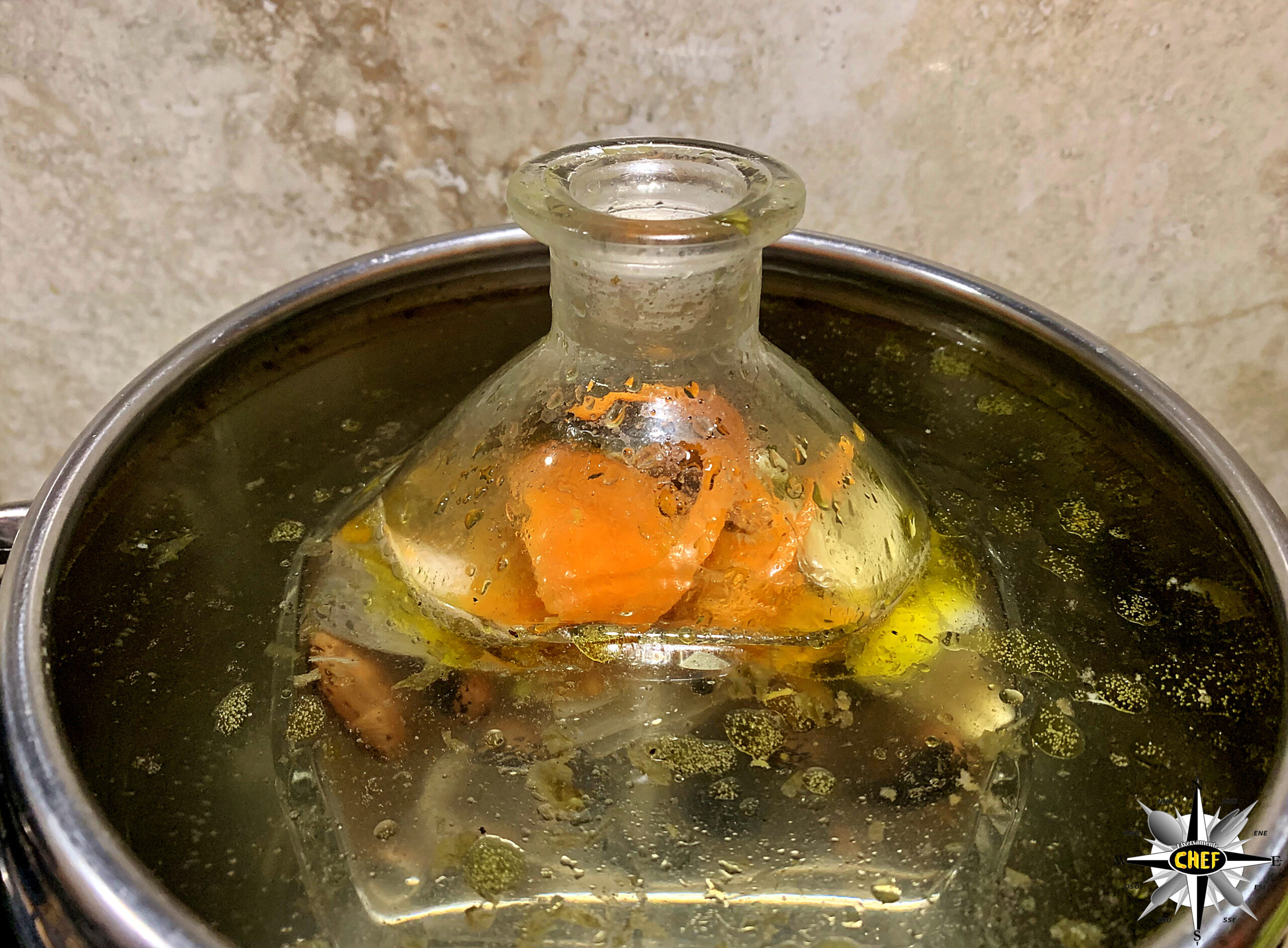 Per evitare che il tappo di vetro della bottiglia possa saltare durante la cottura, a causa dell’aumento della pressione interna, occorre togliere il tappo e sostituirlo con una membrana formata da pellicola alimentare fissata lungo i bordi con un elastico.