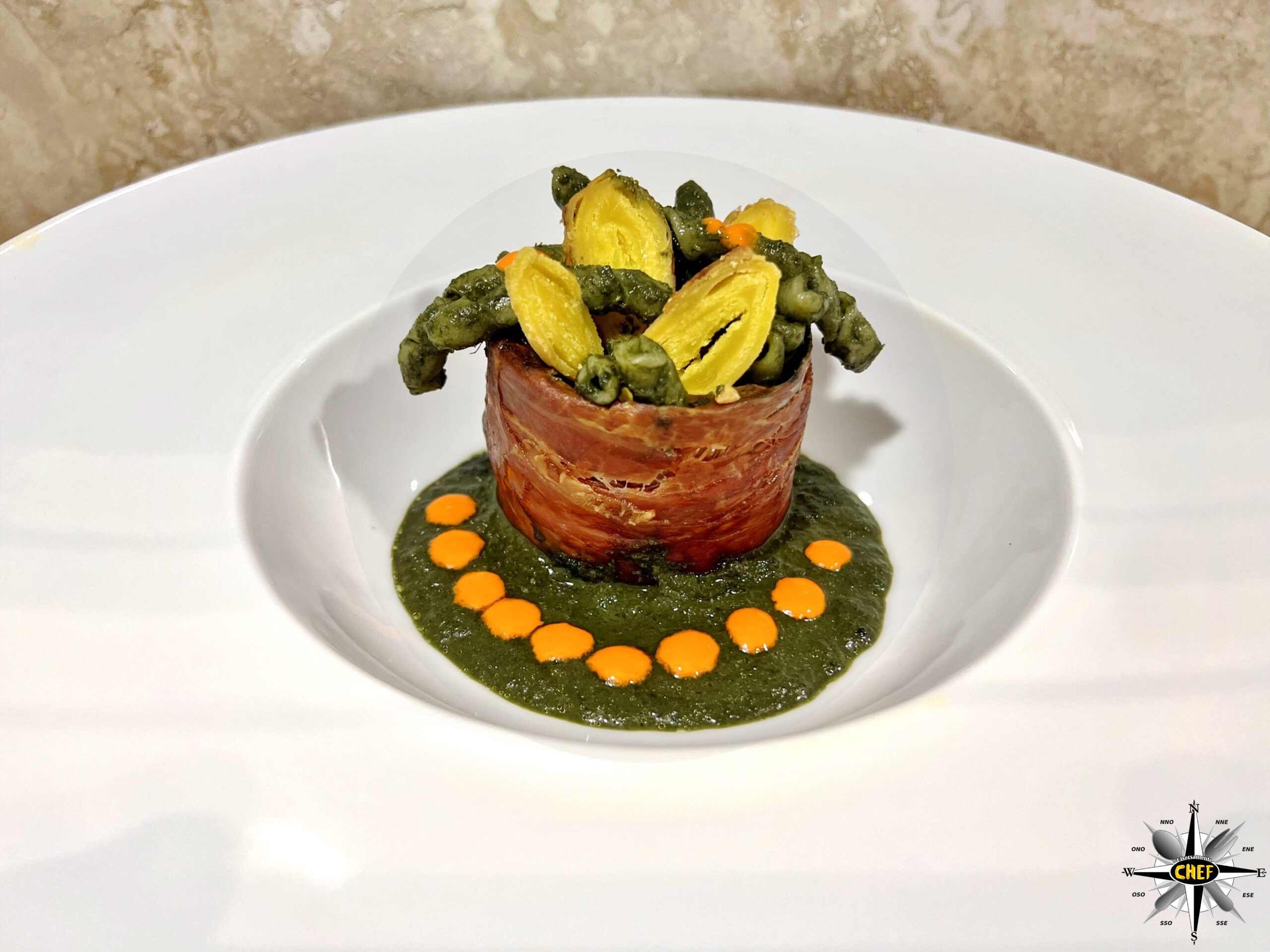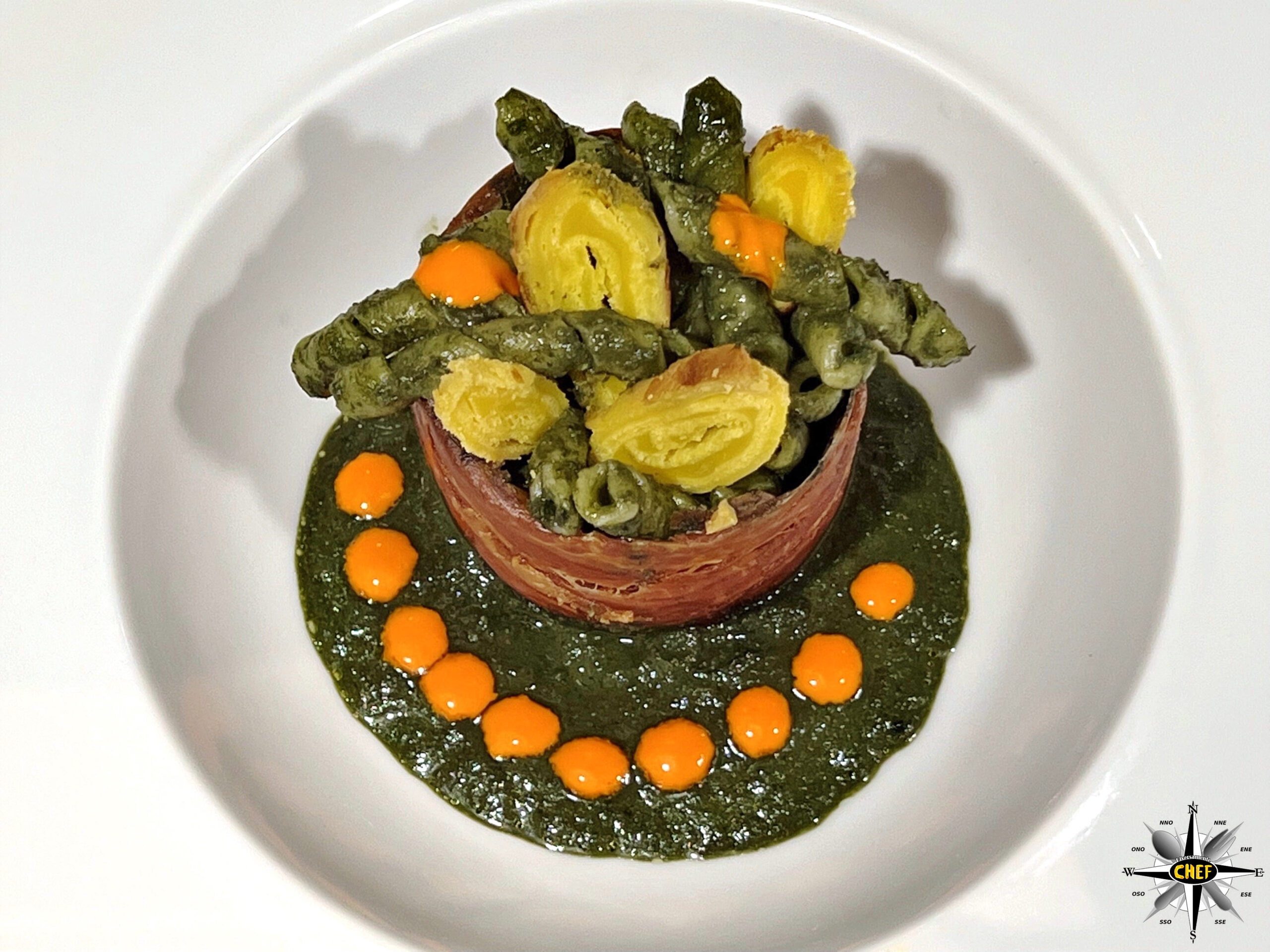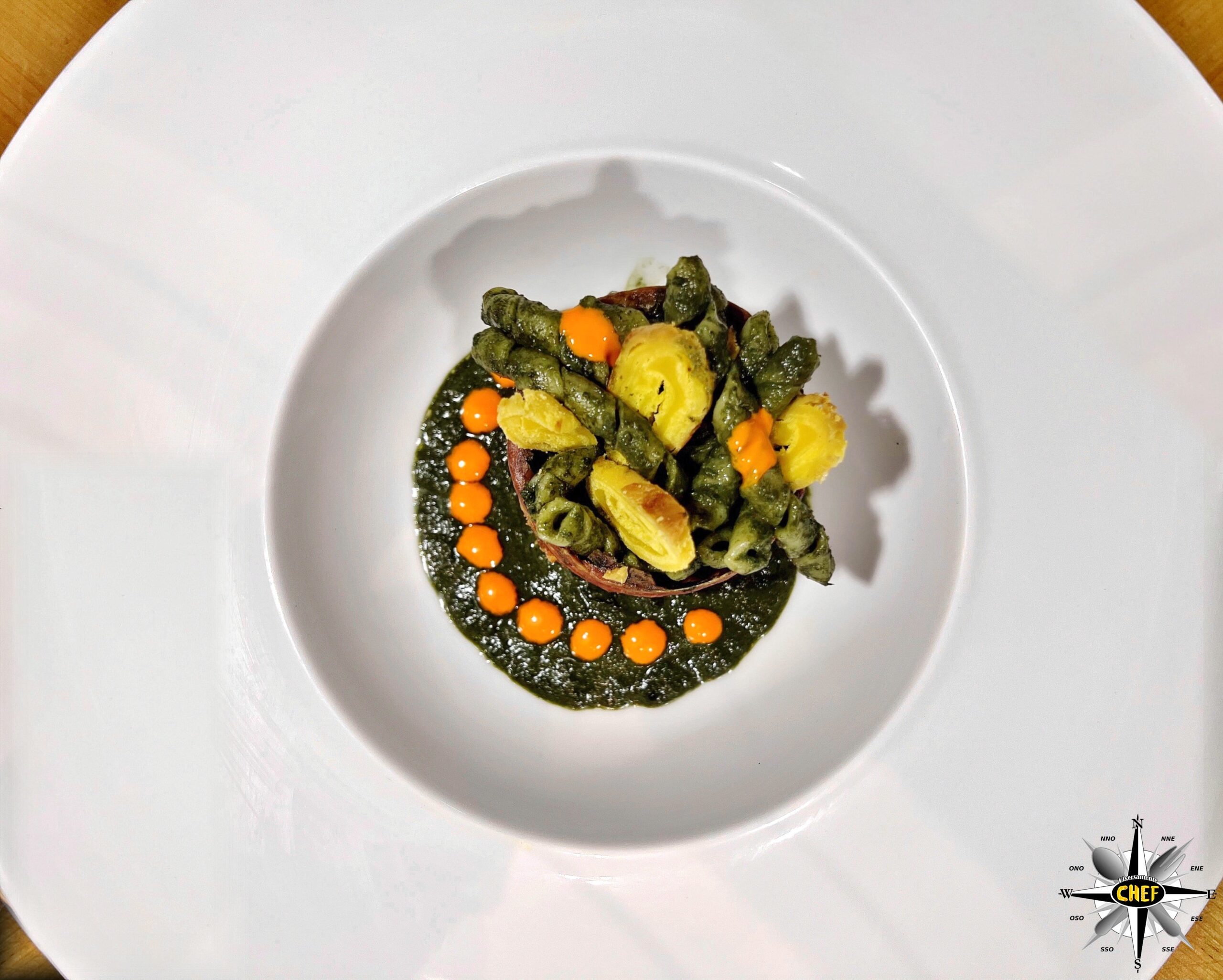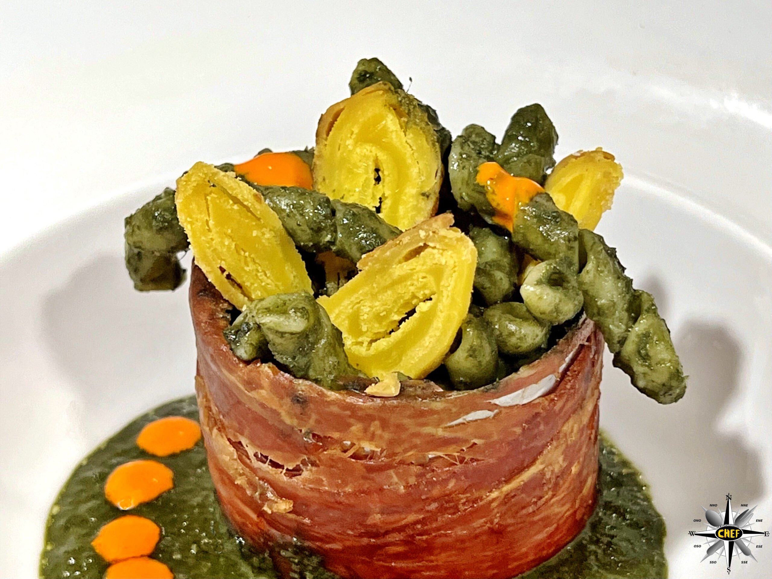 In questo caso abbiamo realizzato con un condimento a base di cavolo nero e prosciutto crudo di Langhirano, abbinato ad una singolare “bottarga” ottenuta da tuorlo di anatra.