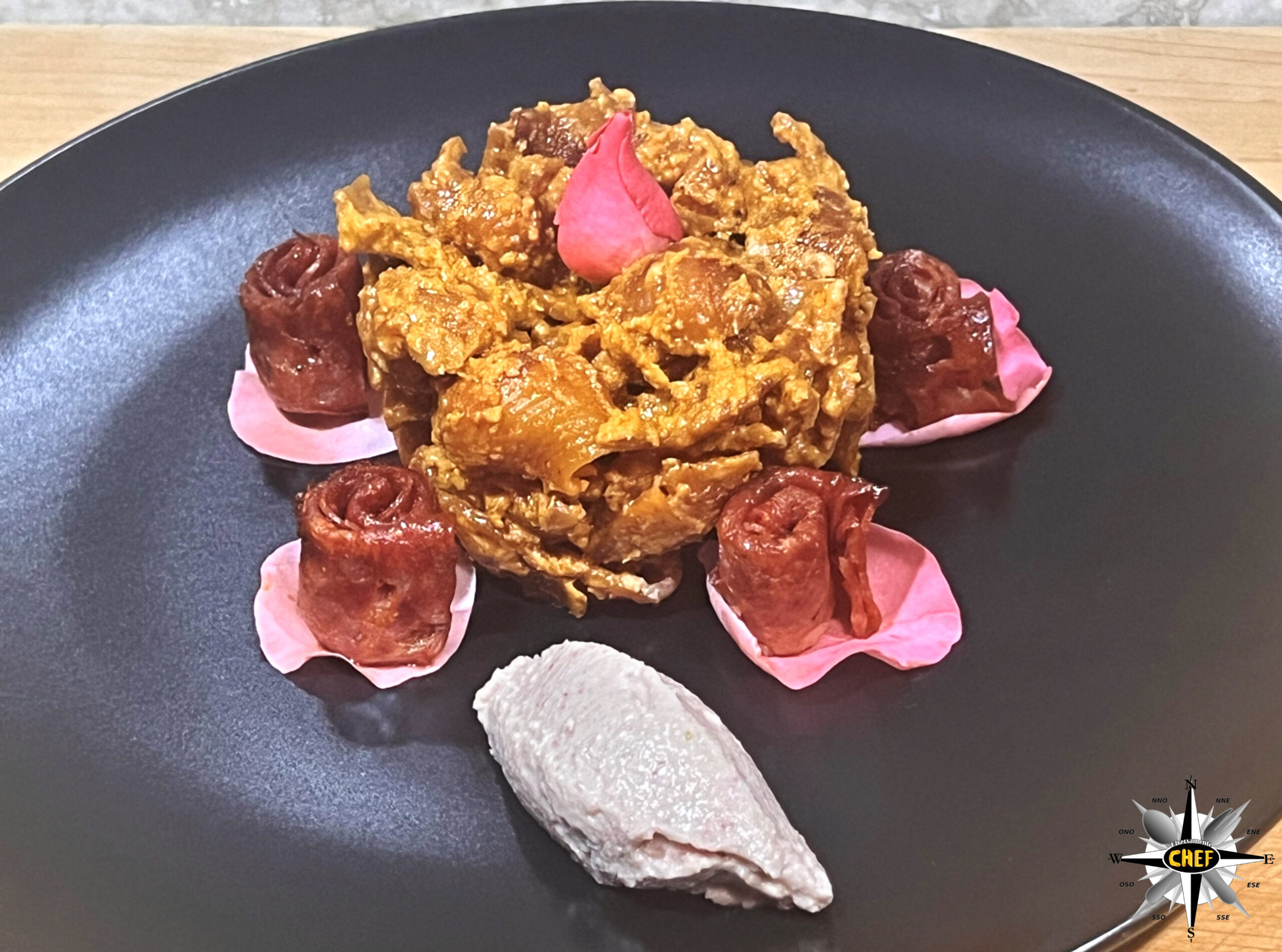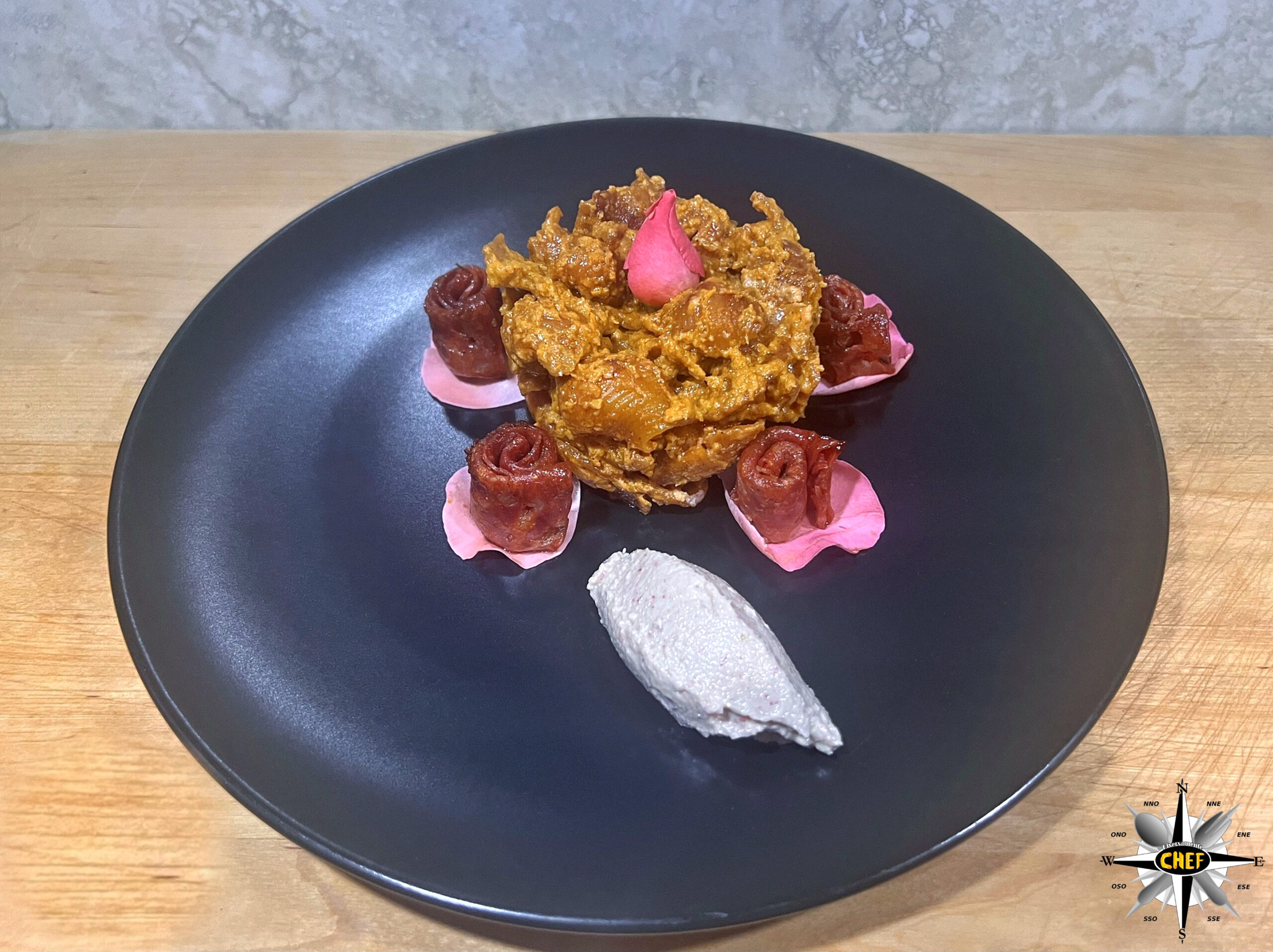 Per le nostre “Gondole di lenticchie rosse con crema di rose e rosette di ventricina” abbiamo utilizzato un tipo di pasta ricca di proteine essiccate a bassa temperatura, realizzata con farina di lenticchie rosse bio (90%) e farina di quinoa bio (10%), condita con un pesto di petali di rose e delle rosette di ventricina, uno degli insaccati più noti e apprezzati della tradizione gastronomica abruzzese.
