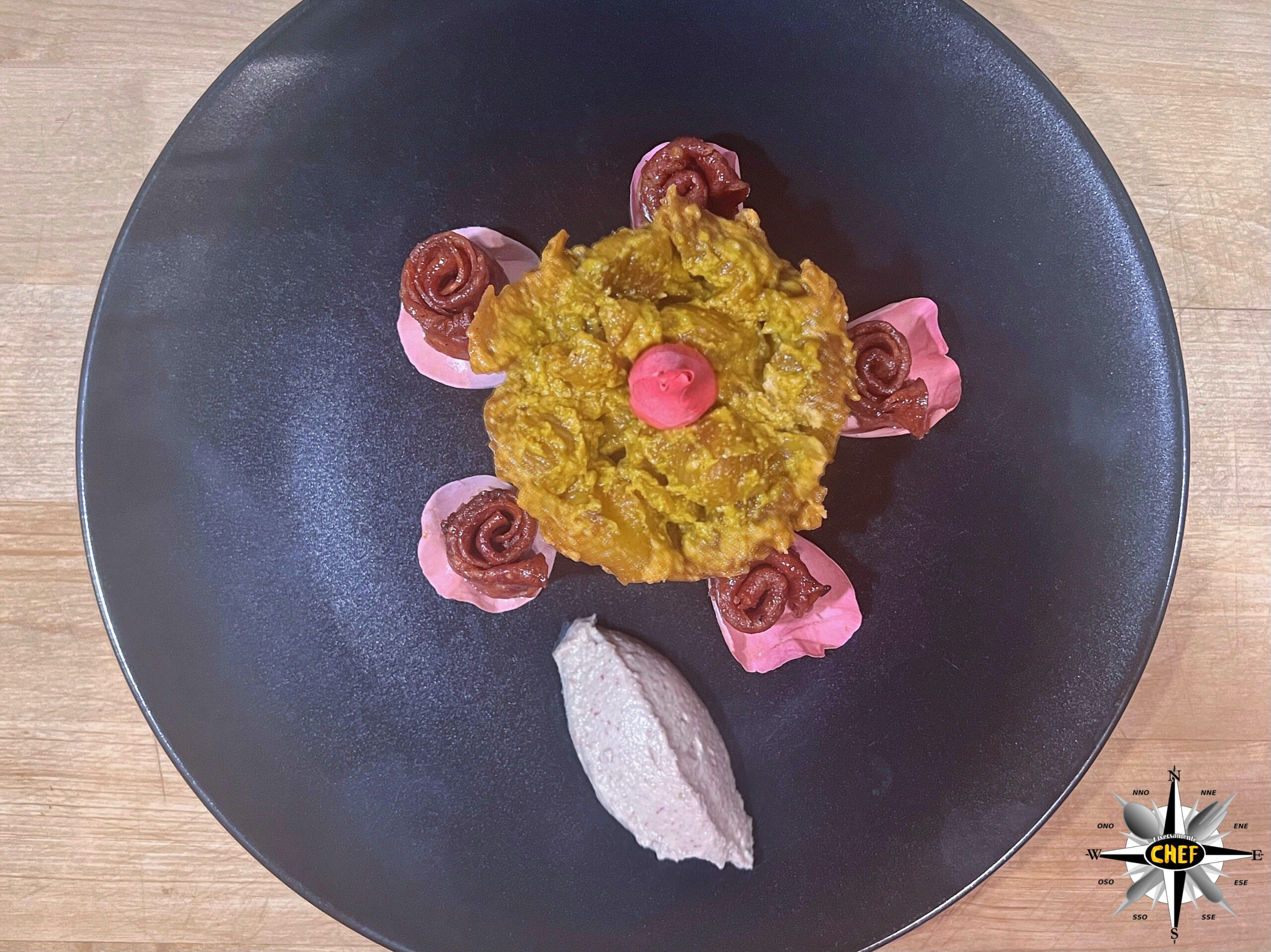 Un’ultima decorazione, con un bocciolo di rosa inserito nella pasta, e le “Conchiglie di lenticchie rosse con crema di rose ai pinoli siberiani e rosette di ventricina” sono pronte.