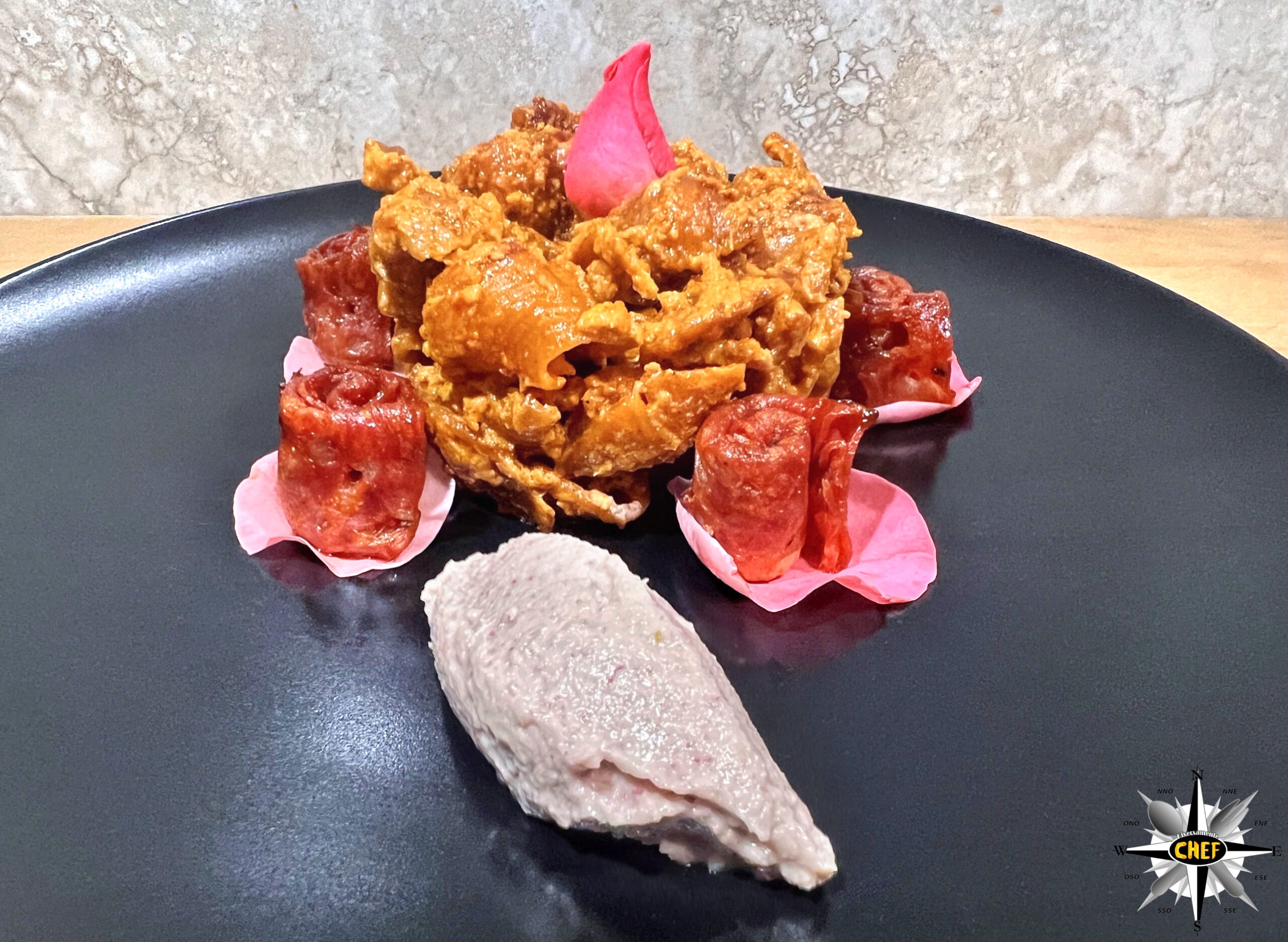 Inserire cinque petali di rosa lungo il contorno del nido, sui quali verranno sistemate le rosette di ventricina, e una quenelle di pesto nella parte anteriore incuneata tra le ventricina.