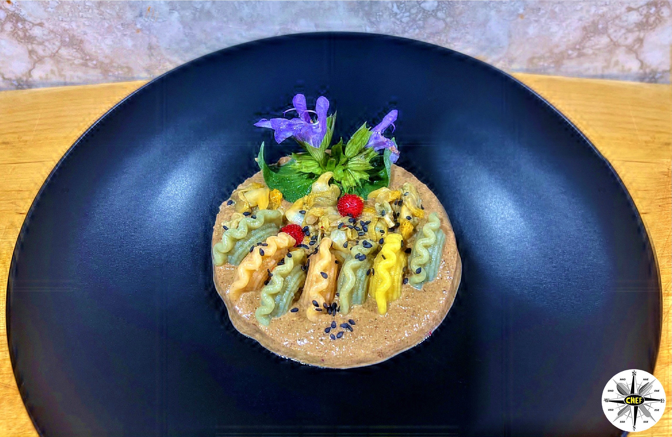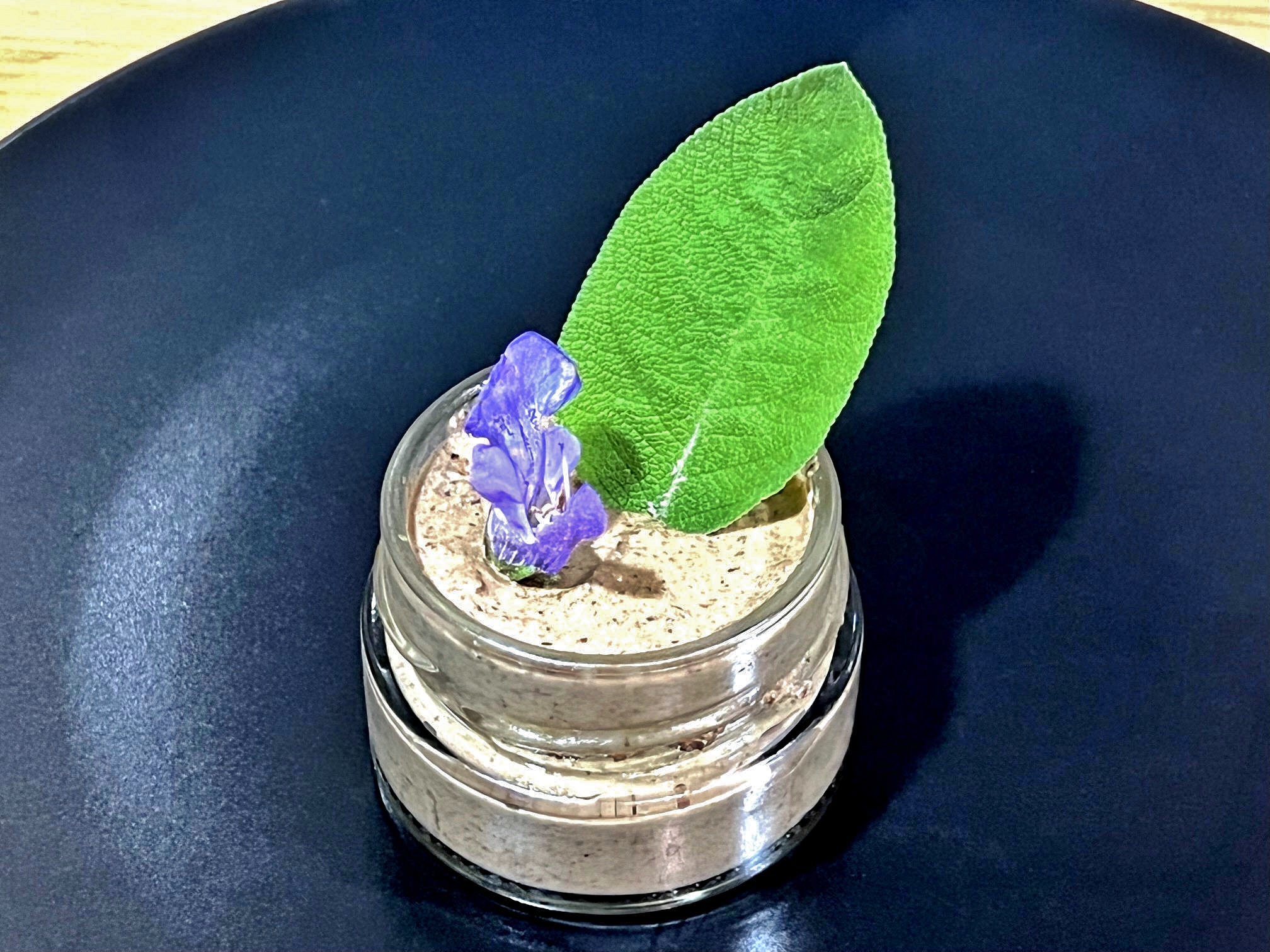 Disporre il pesto di fiori di salvia al centro del piatto (opaco, a fondo nero) utilizzando un coppapasta di medie dimesioni (6-8 cm).
