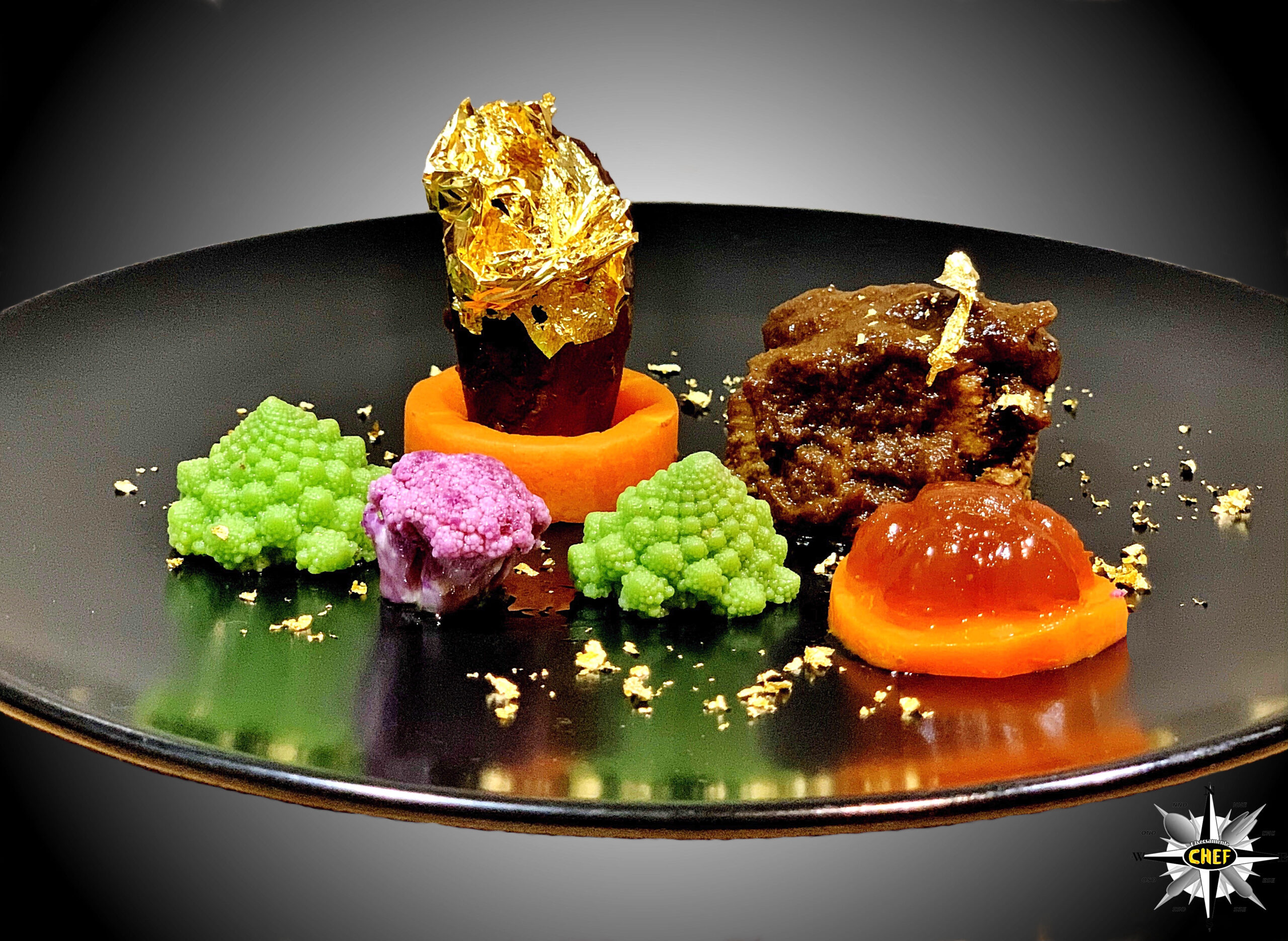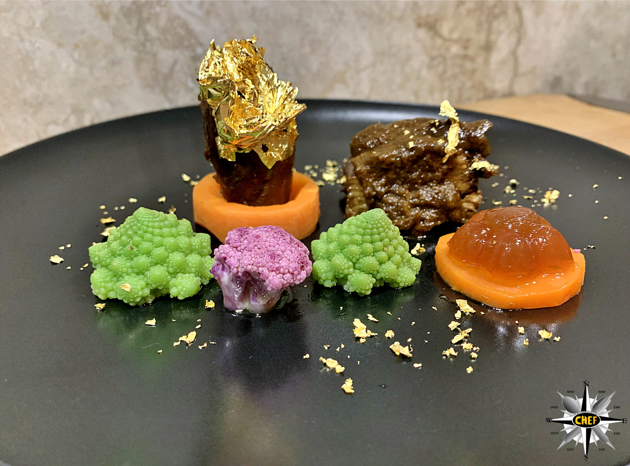 Per la marinatura della carne abbiamo utilizzato una varietà di birra rossa, molto aromatica, versando verso la fine del trattamento 8/10 gocce di olio essenziale di incenso, mentre per il dressage finale (oltre alle verdure) abbiamo inserito una lamina d’oro 24K sulla coscia di fagiano e una gelatina di birra adagiata su un disco di carota.