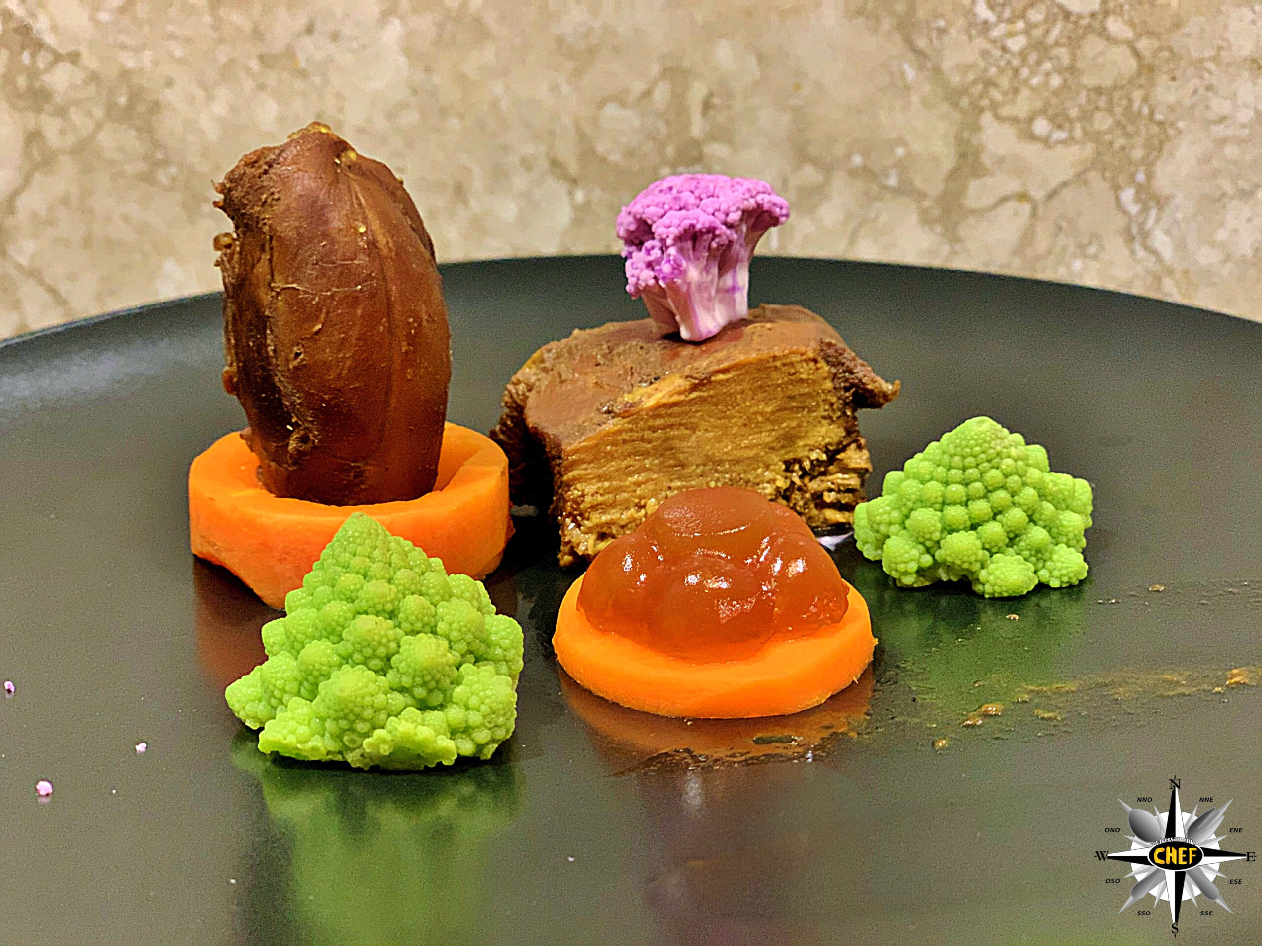 Adagiare sul secondo disco di carota la gelatina di birra, affiancata dal cavolo romano e da quello rosa.
