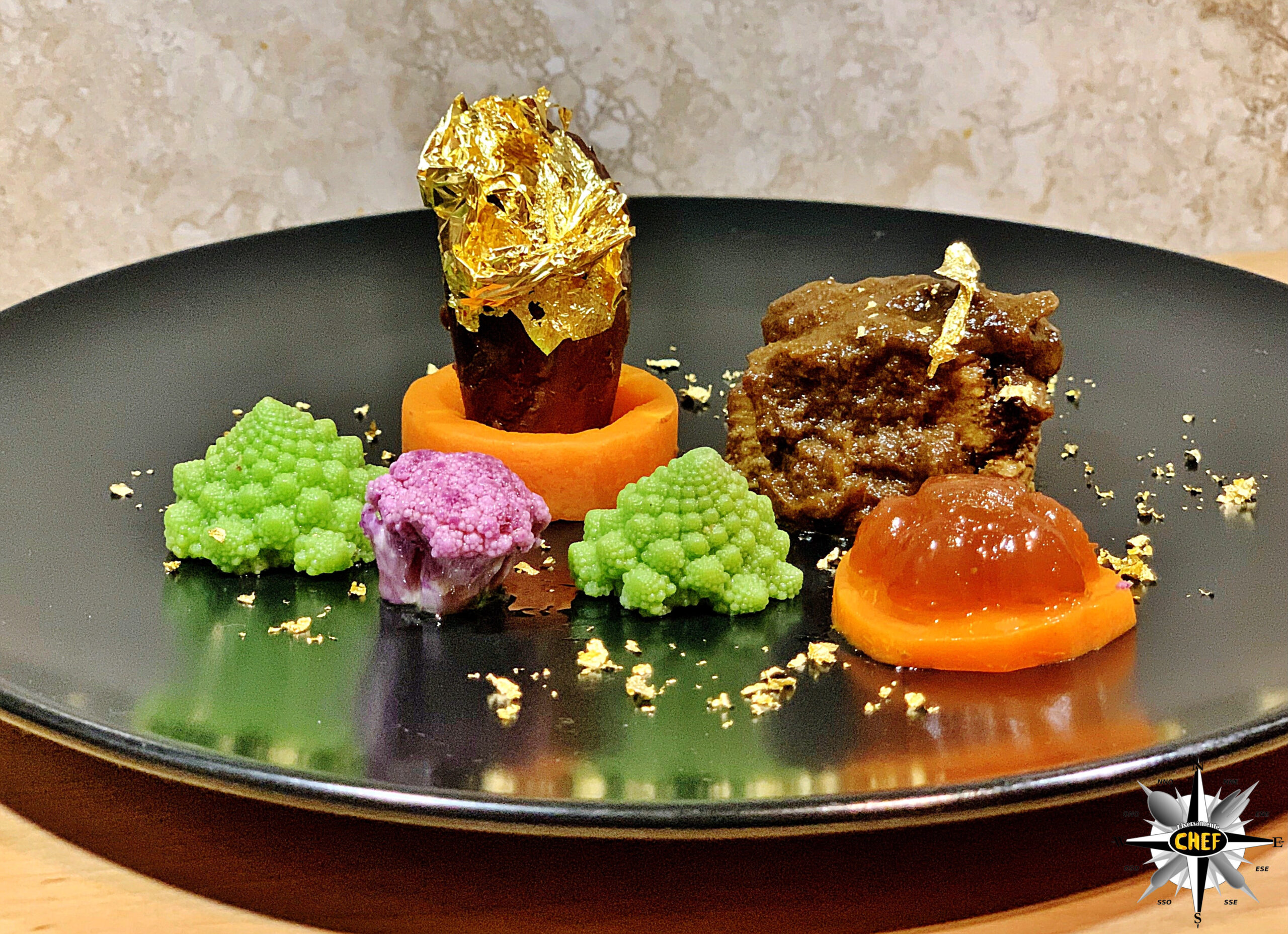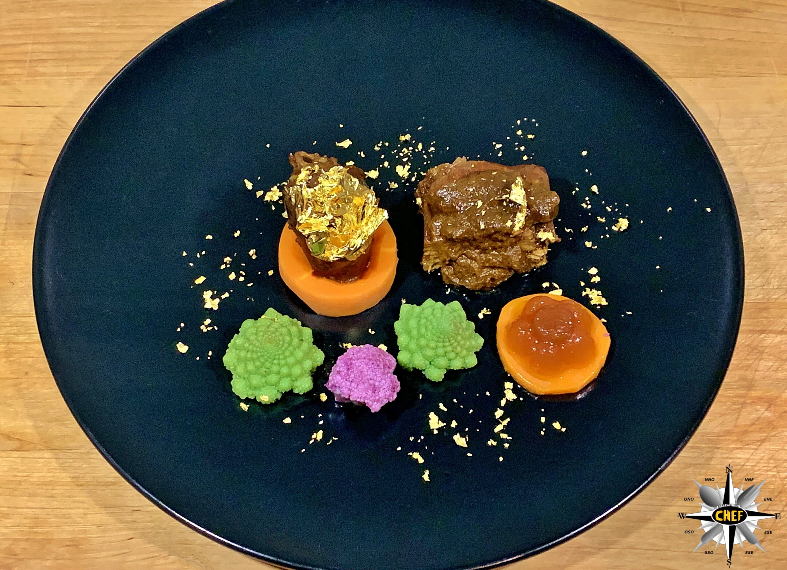 Per la marinatura abbiamo utilizzato una varietà di birra rossa, molto aromatica, versando verso la fine del trattamento 8/10 gocce di olio essenziale di incenso, mentre per il dressage finale (oltre alle verdure) abbiamo inserito una lamina d’oro 24K sulla coscia di fagiano e una gelatina di birra adagiata su un disco di carota.