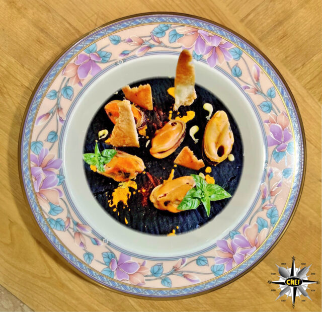 Il sapore deciso del nero di polpo si abbina inoltre alla perfezione con la salsa di ostriche e alla nota piccante (in sintonia cromatica con il colore delle valve) assicurata da alcune gocce di wasabi, rendendo la “Focaccia al nero di polpo con vele di fontina e mitili giganti” un piatto veramente unico e gradevole al palato.