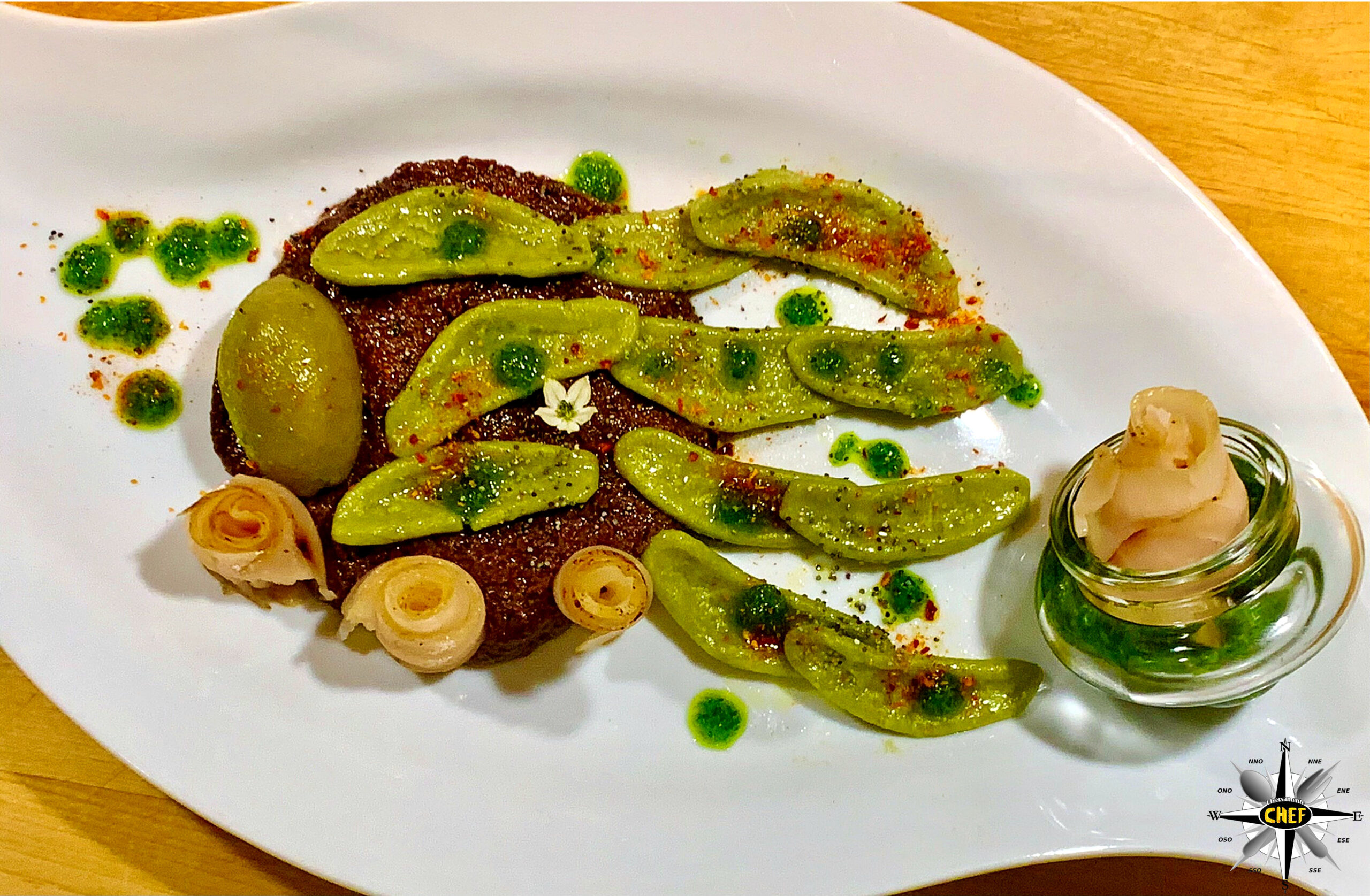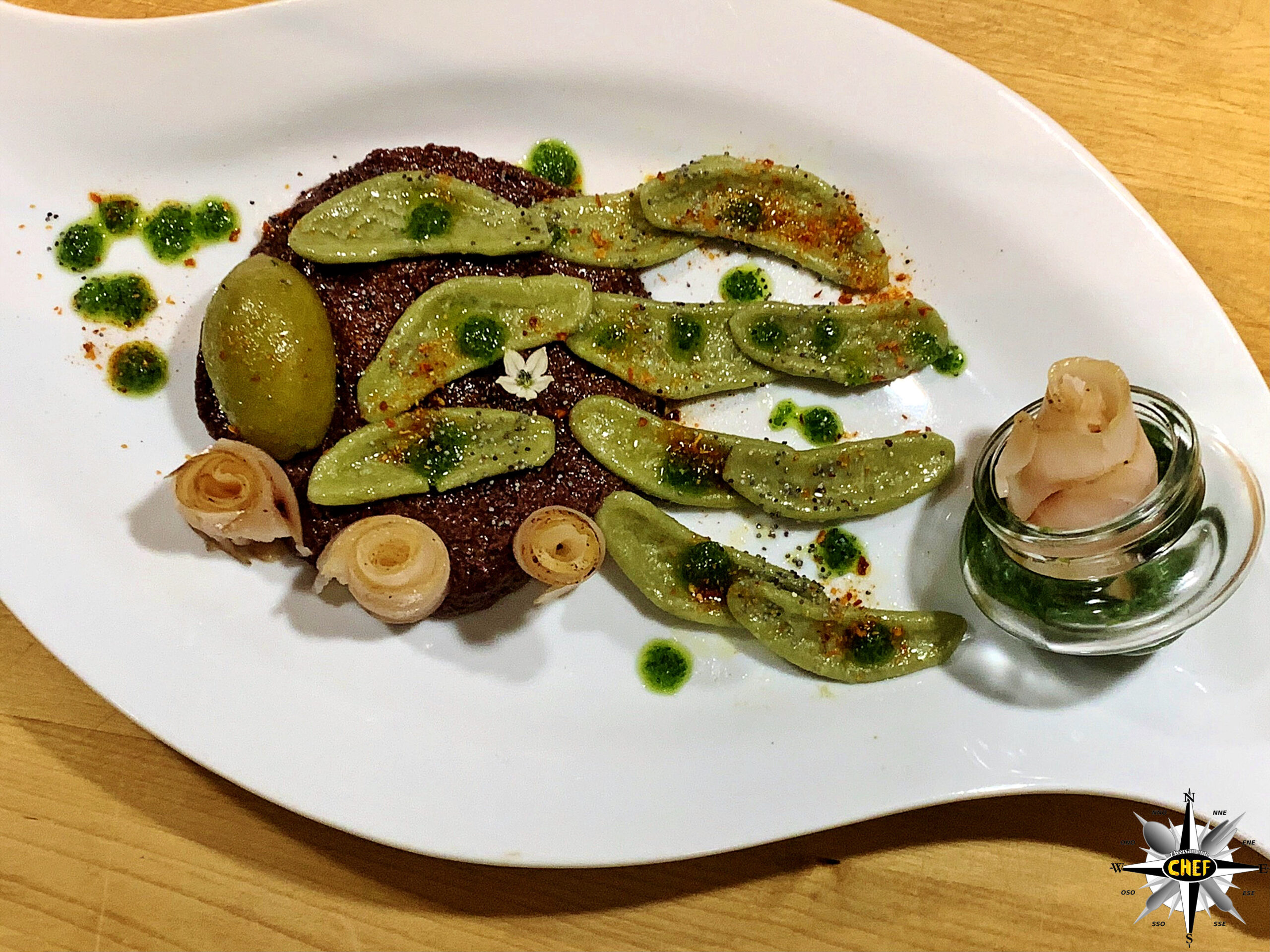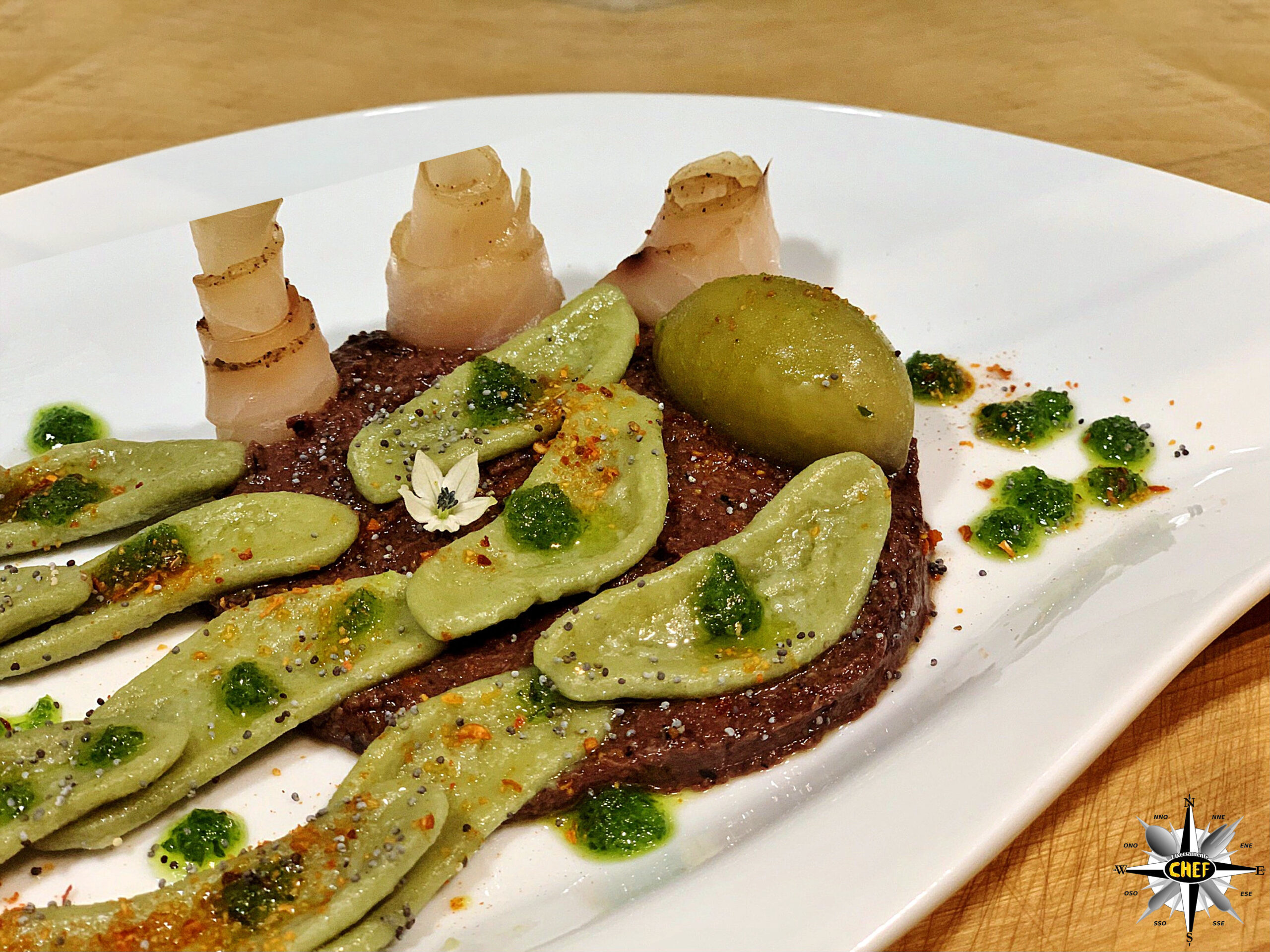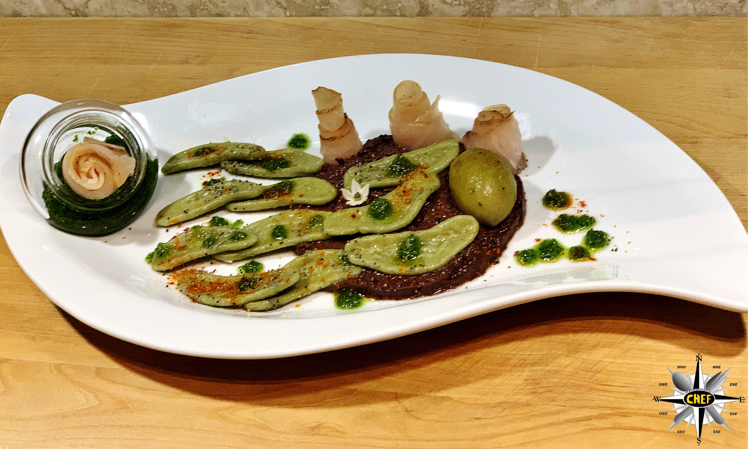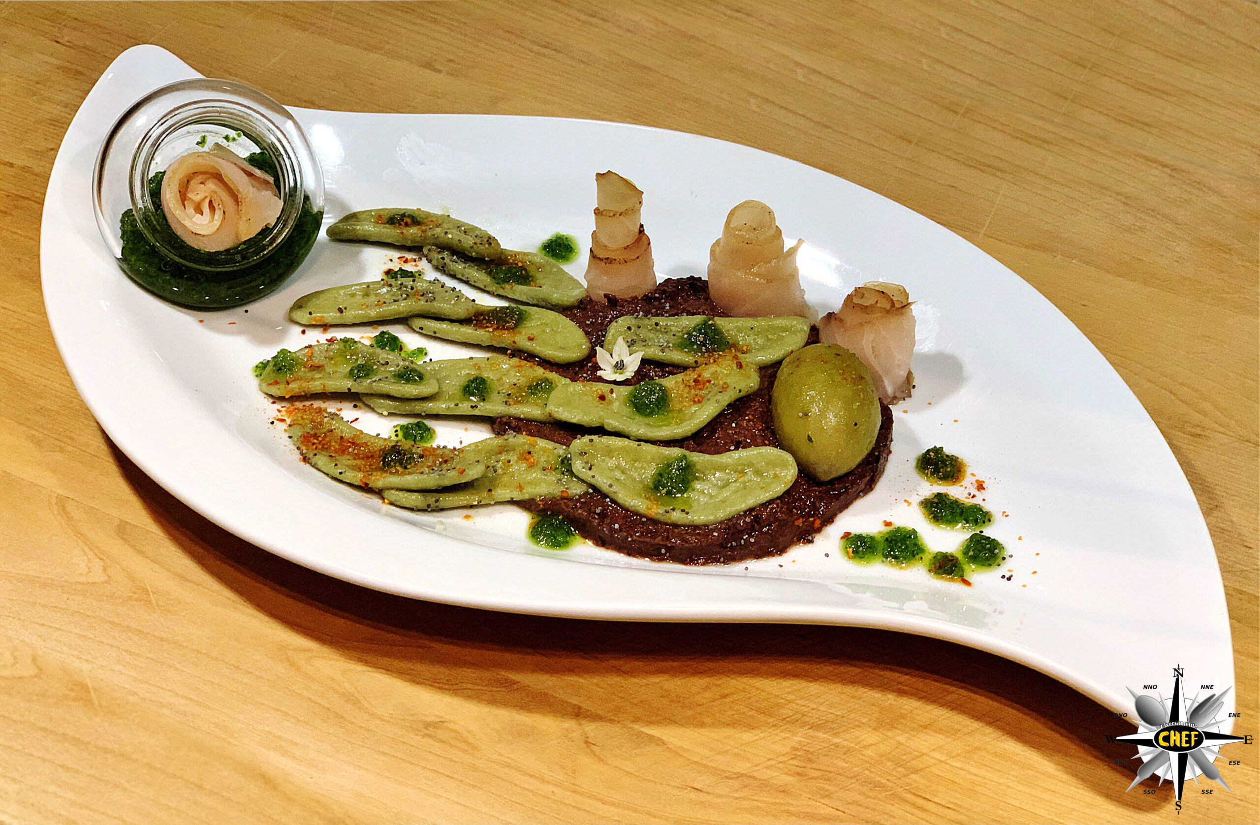Nella “Foglie di ulivo al pesto taggiasco con storione bianco affumicato“, abbiamo utilizzato un pesto a base di olive, acciughe e capperi, abbinato allo storione bianco affumicato.