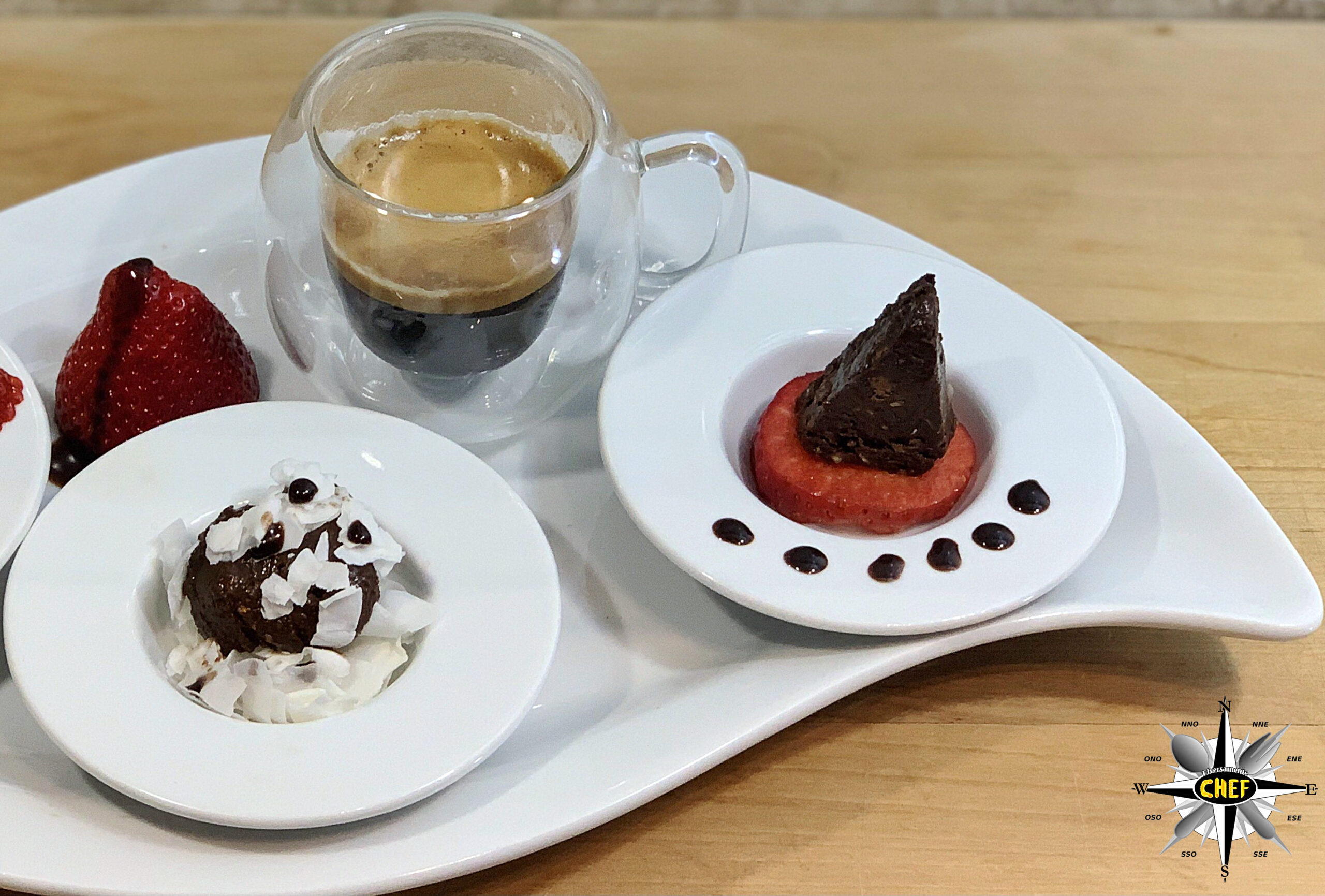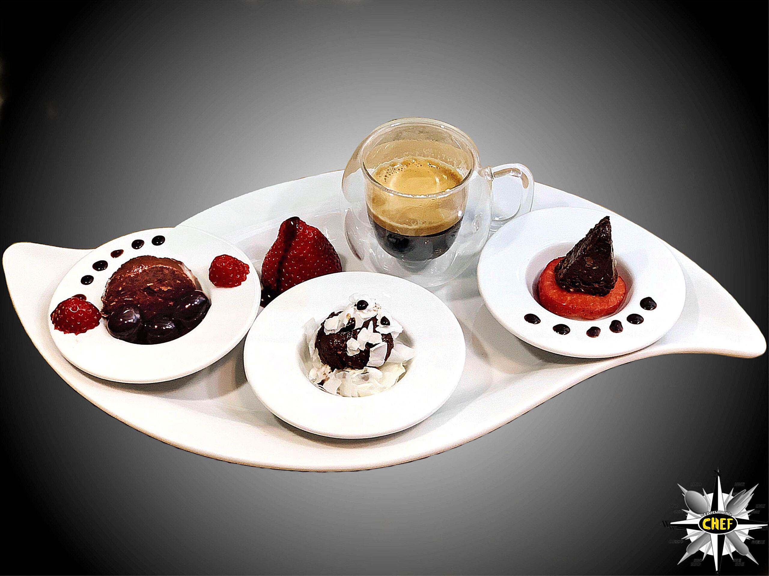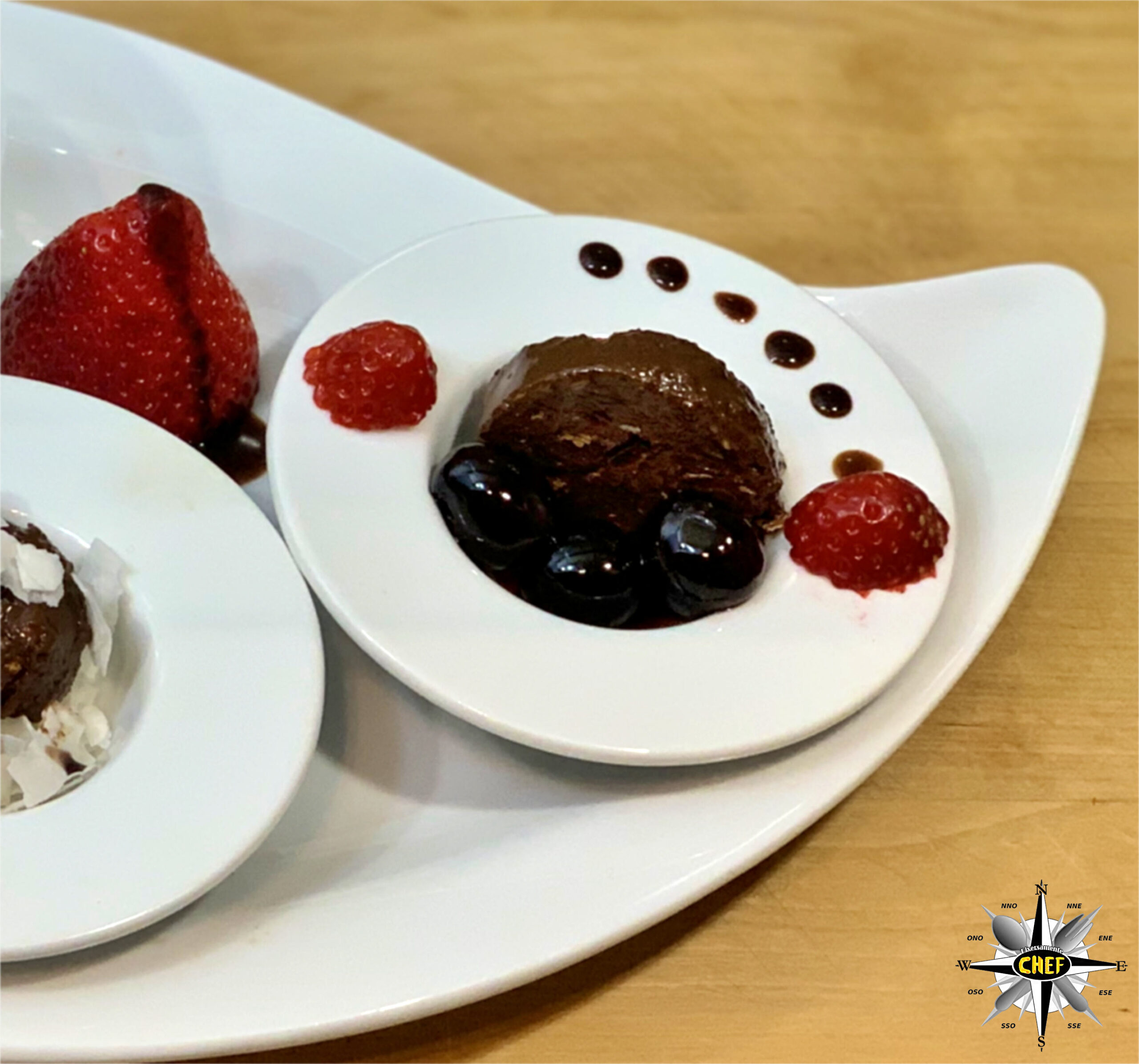 Per sottolineare ulteriormente il mix di sapori presenti nella ricetta, e assicurare al palato tre tipologie di degustazione, sistemare all’interno del piatto tre coppette rotonde: in quella centrale si posiziona una fetta del “salame” di cioccolato, immersa tra le scaglie di cocco essiccato ricoperte di gocce di cioccolato, in quella di sinistra viene collocata una pralina circolare affiancata da tre amarene, e in quella di destra un cuneo di cioccolato adagiato su una base formata da un disco di fragola.