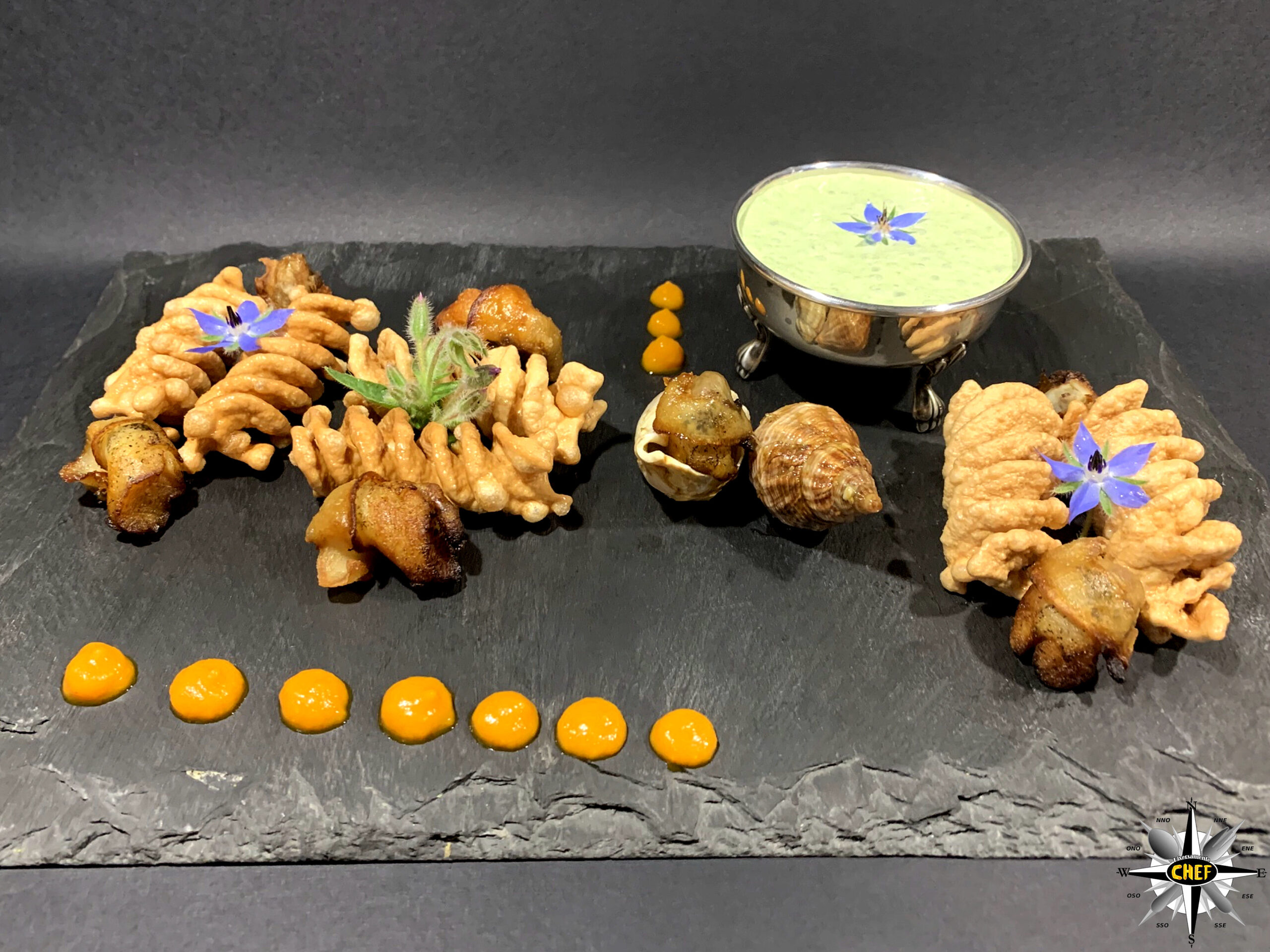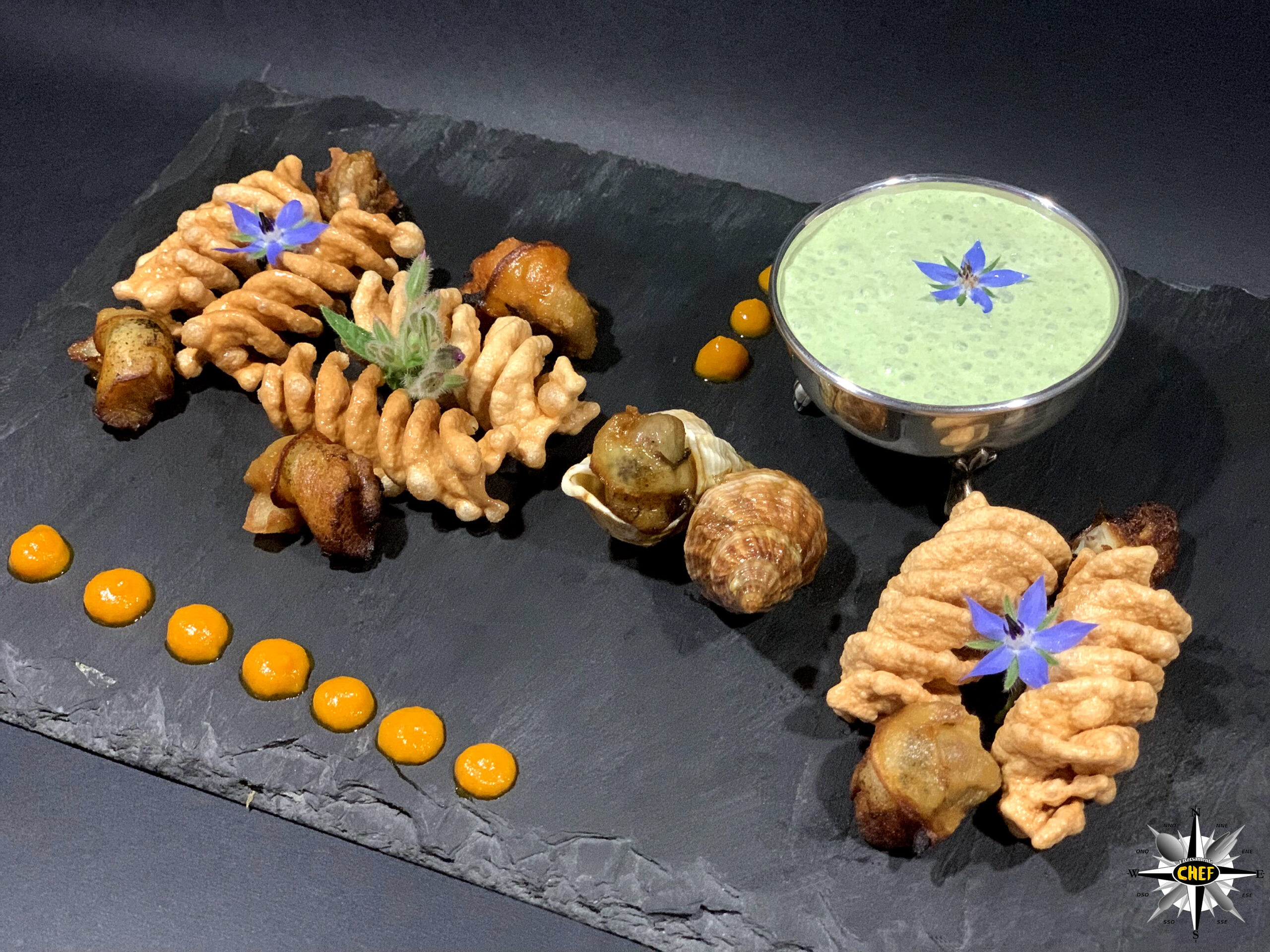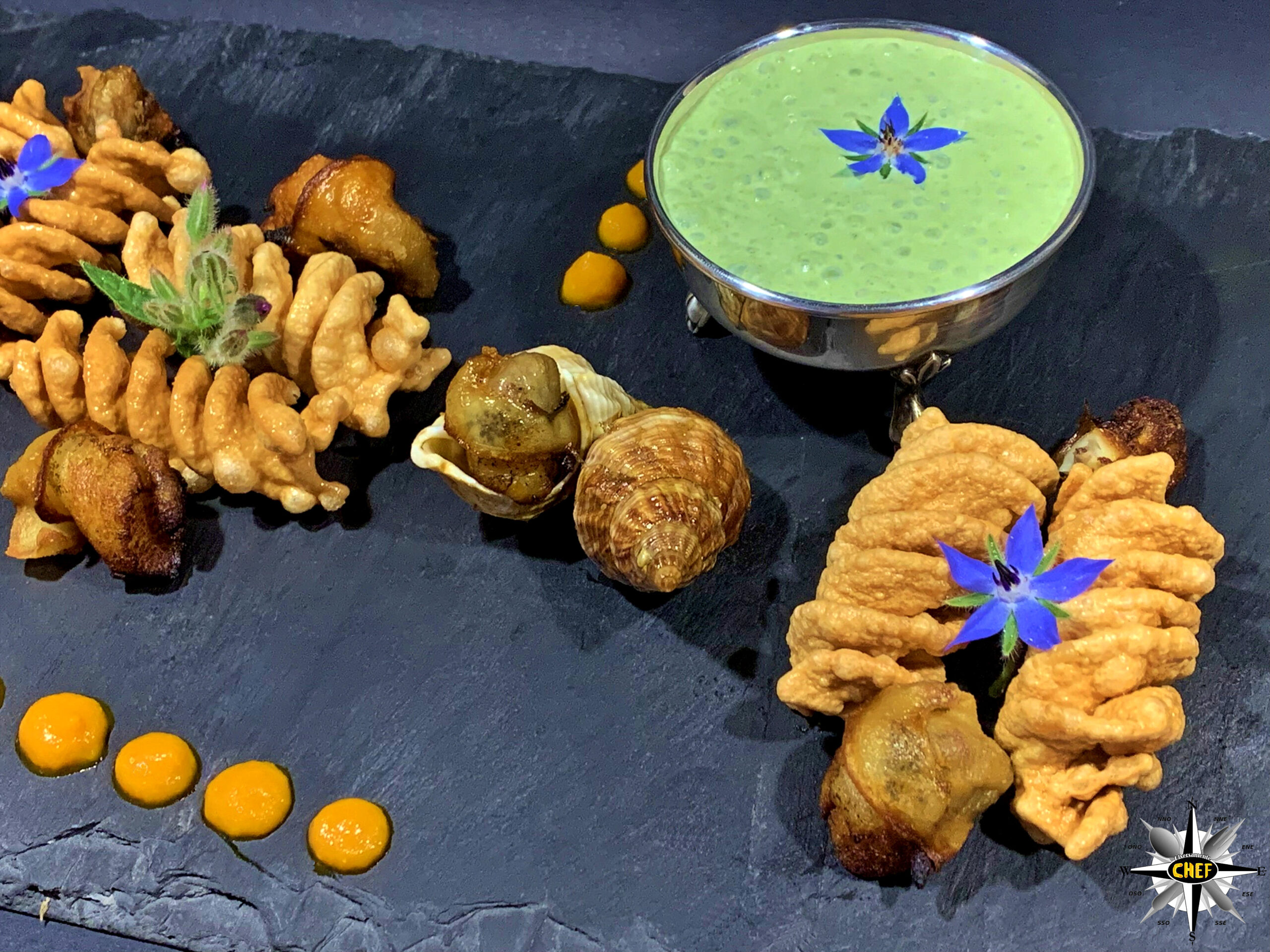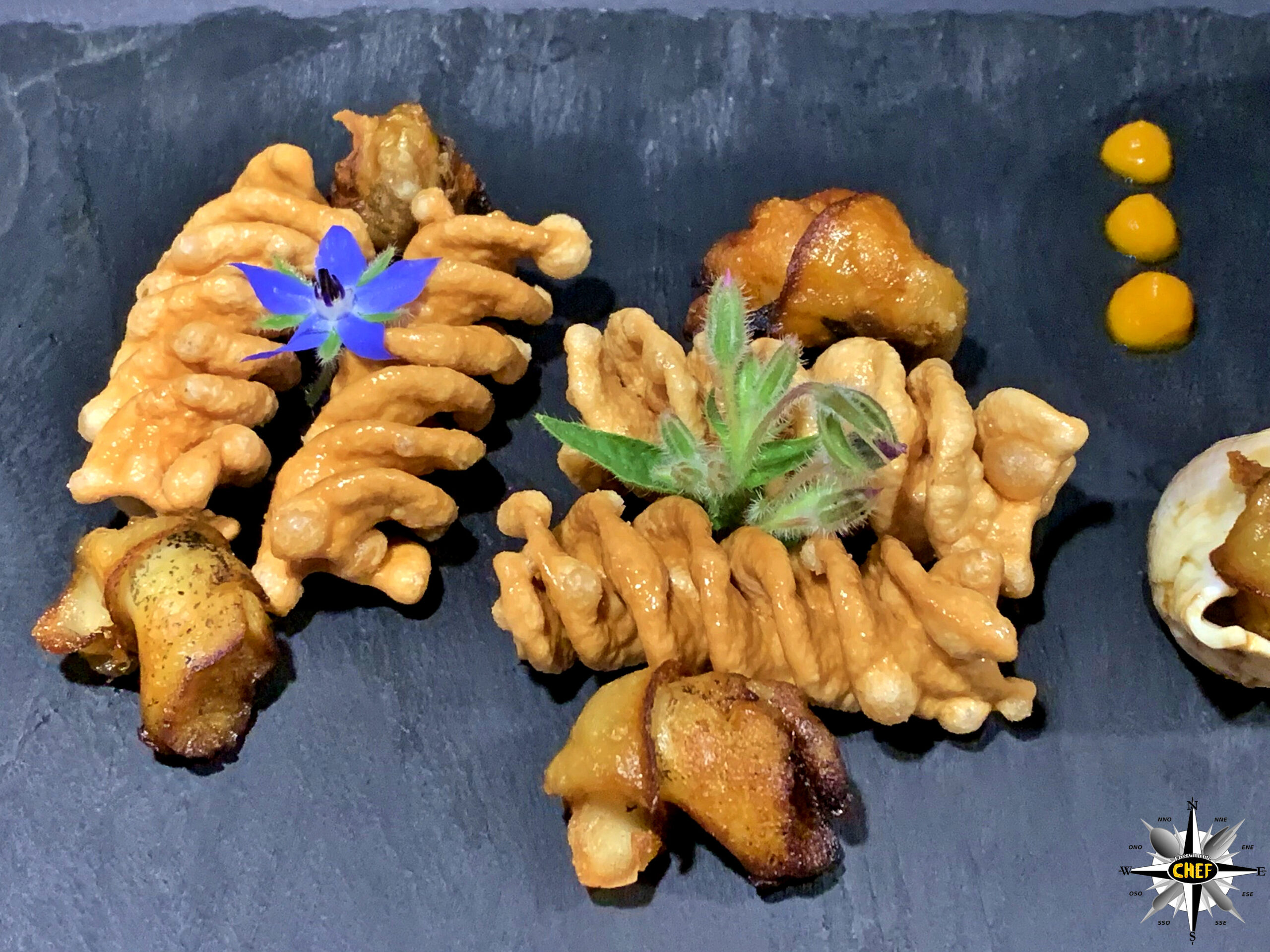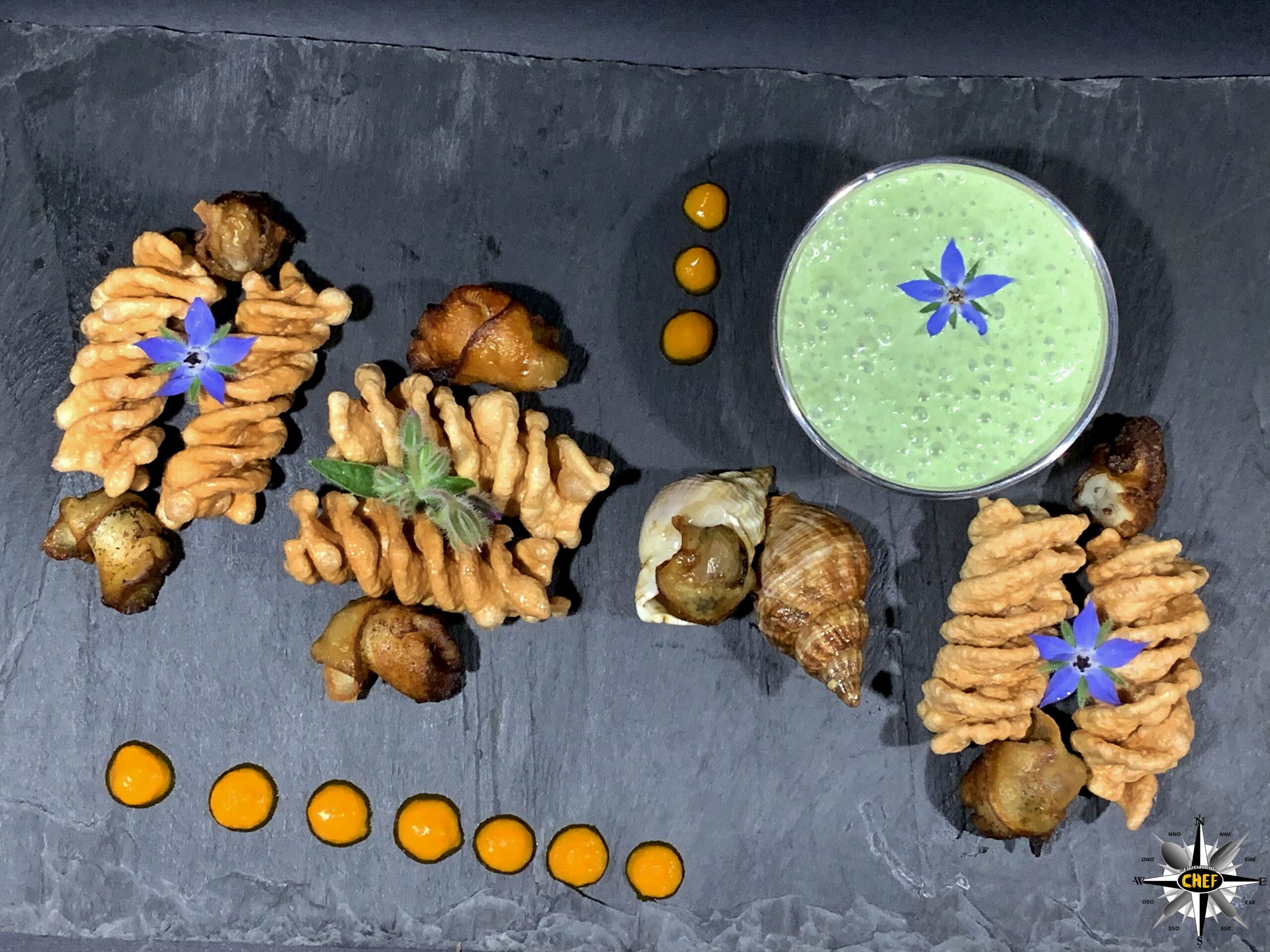 Nella “Fusilloni soffiati con lumache di mare e cremoso di borragine” la pasta è accompagnata dalle lumache di mare, note come buccini, uno dei molluschi più appetitosi presenti nella vasta dispensa dei prodotti ittici.