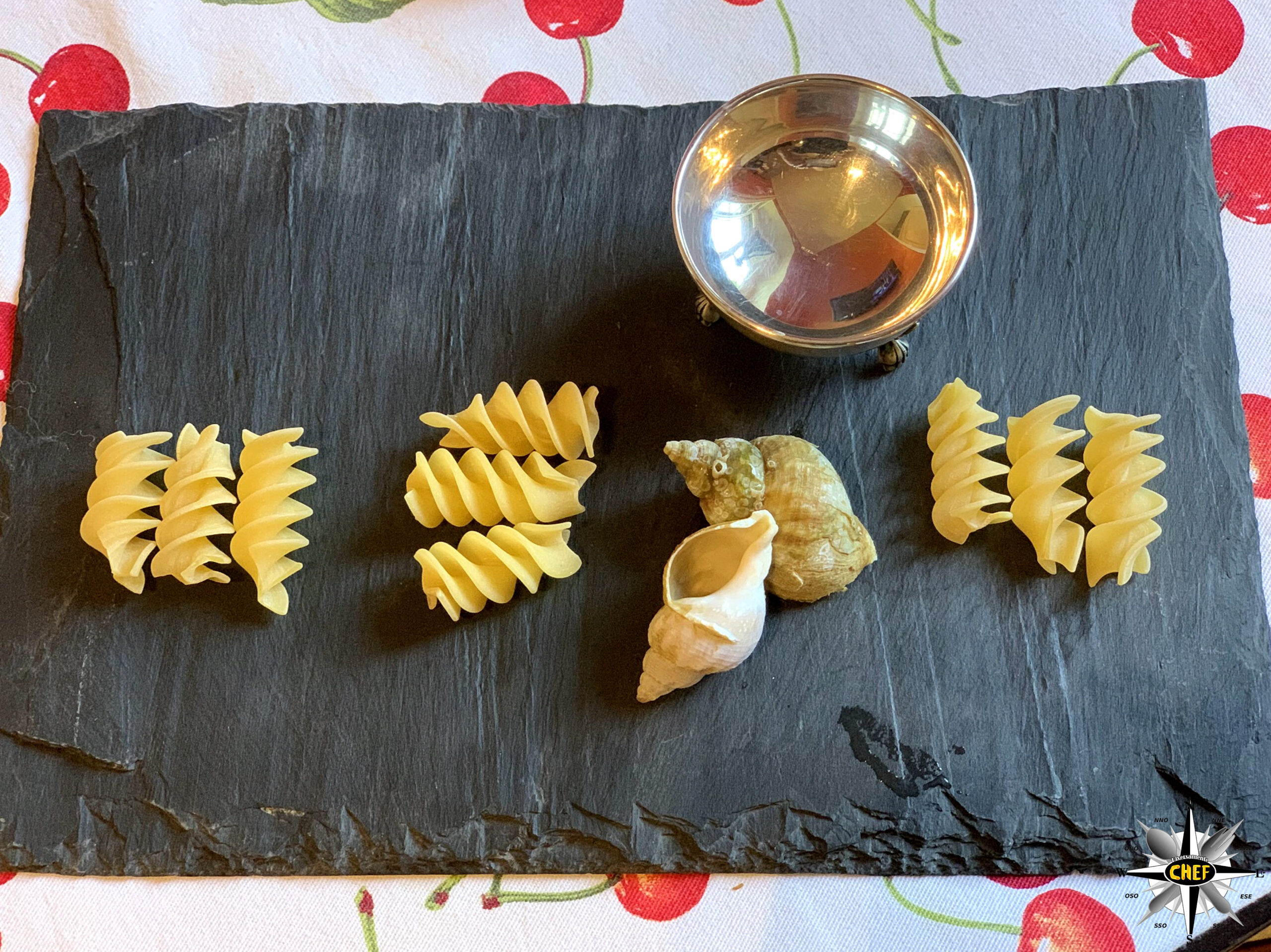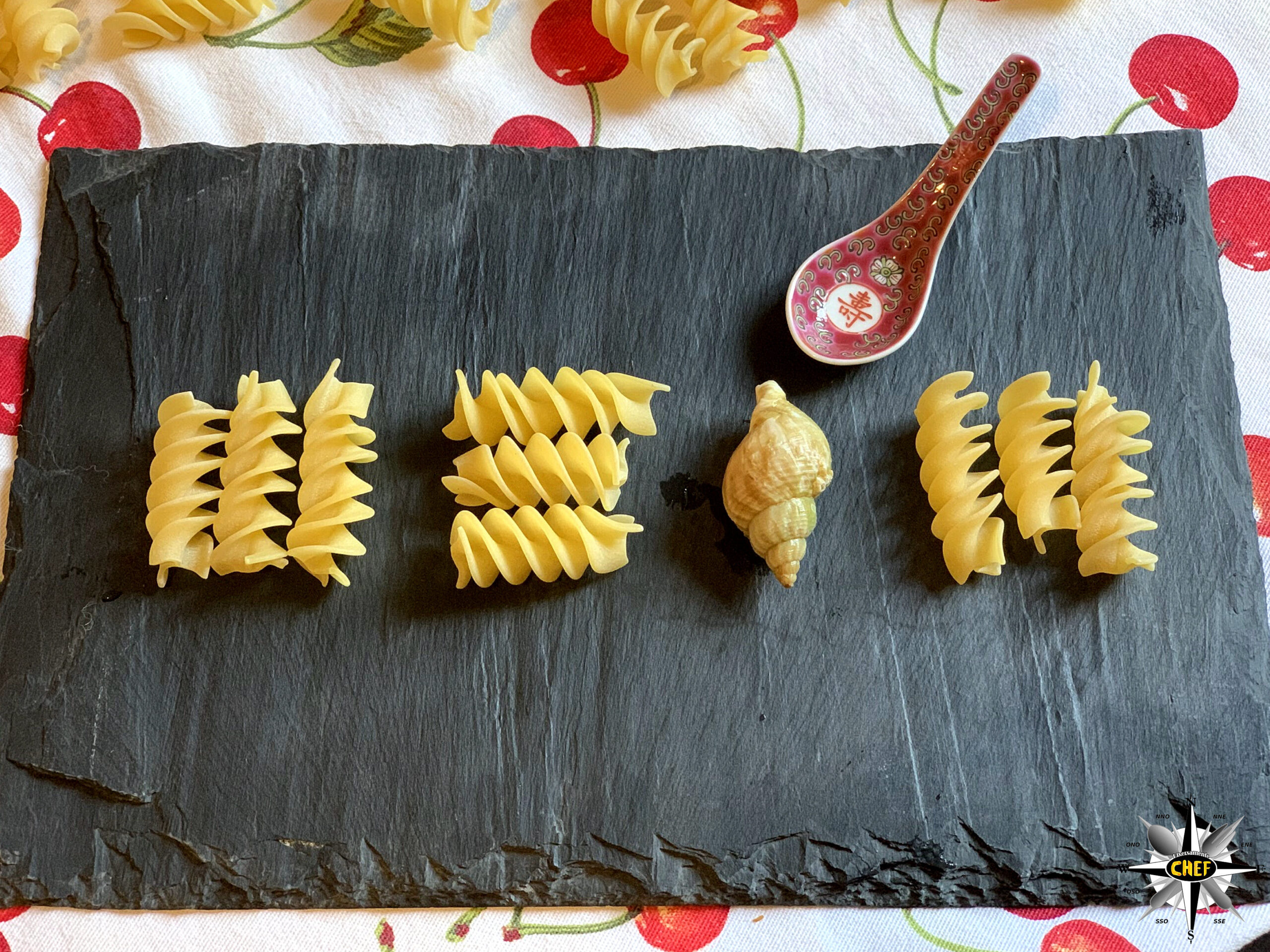 Disporre diagonalmente i fusilloni in un piatto di ardesia, allineati due a due, affiancati dalla polpa dei molluschi, inserendo sul lato destro due buccini con le relative conchiglie.