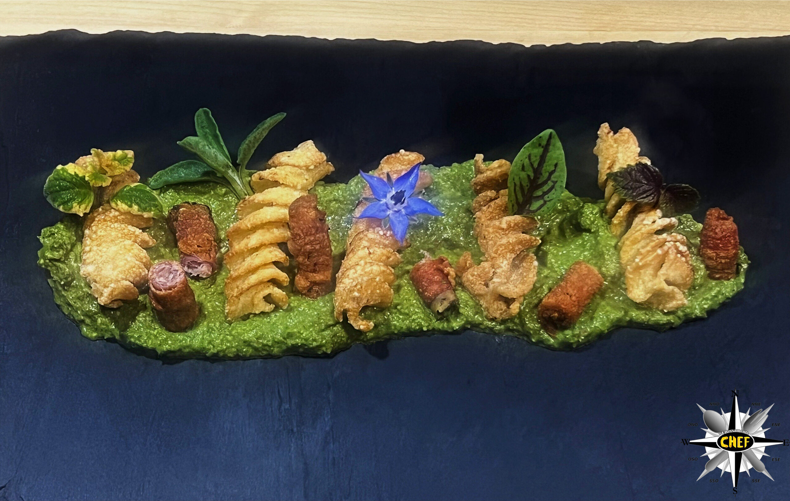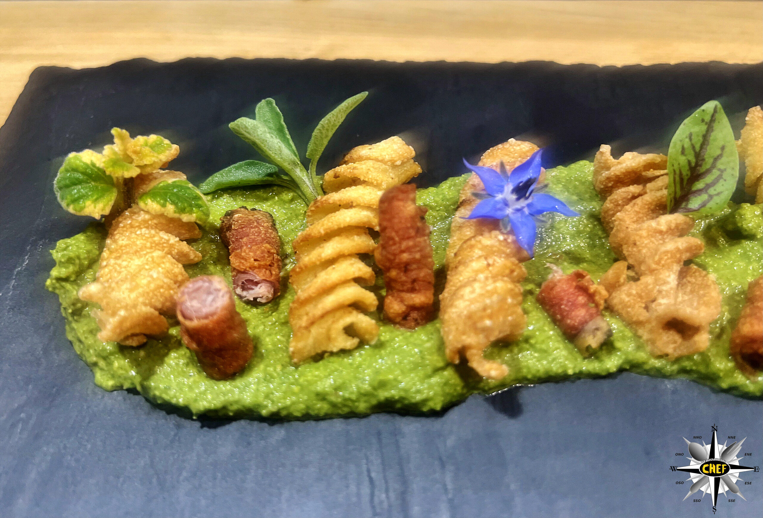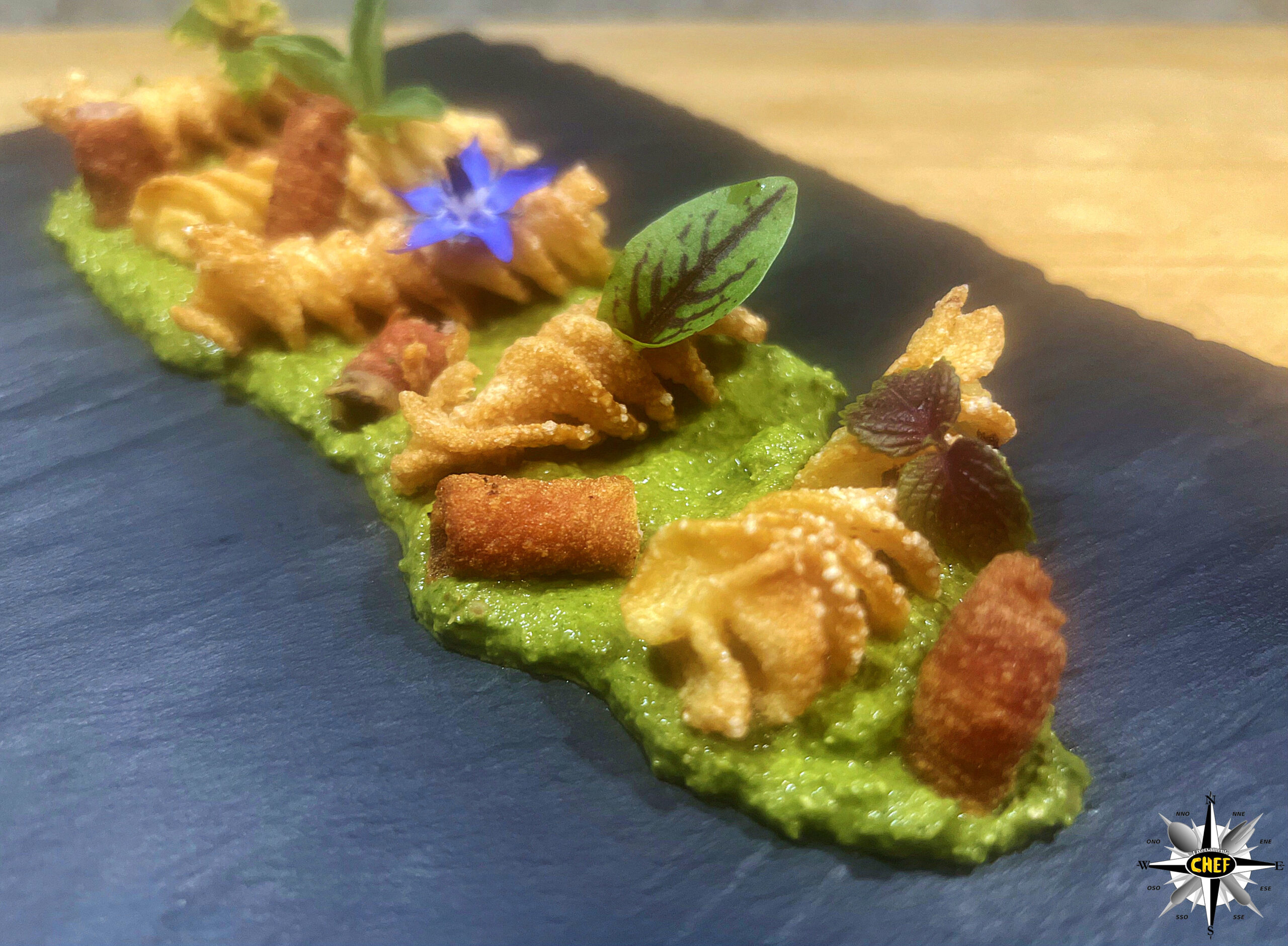 Le 5 foglie sono utilizzate anche per le decorazioni del dressage, nelle quali sono presenti i vivaci fiori di borragine, mentre per una marcia in più abbiamo inserito dei riccioli di Speck Alto Adige IGP, sottoposti ad una lunga cottura in forno che li ha trasformati in croccanti cannoli ricchi di gusto che si armonizzano (ed esaltano) alla perfezione il cocktail vegetale del pesto.