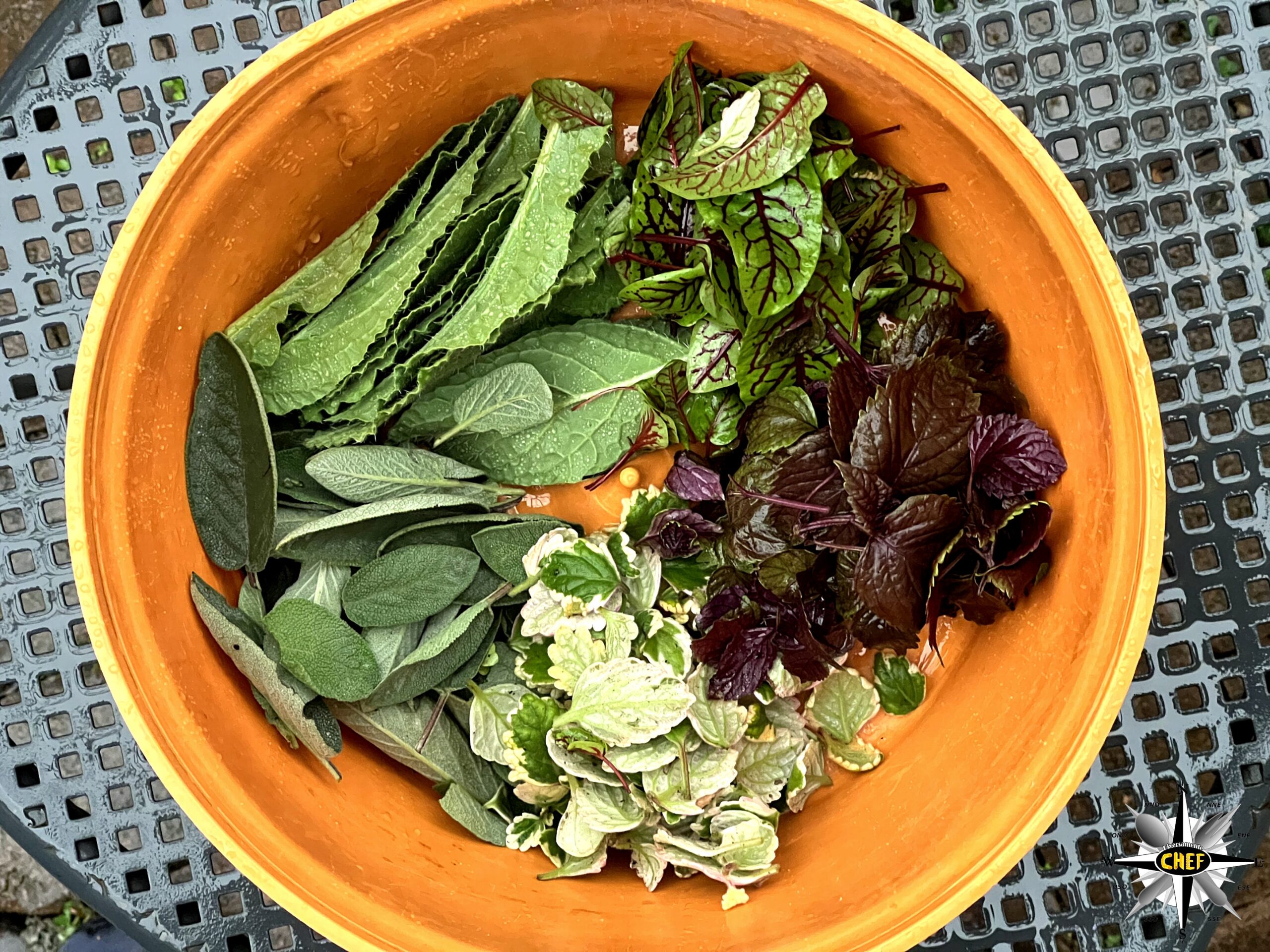 Sbollentare leggermente in acqua salata solo la borragine, la salvia e soprattutto l’incenso (che ha foglie molto spesse e carnose), scolare e asciugare bene su un foglio di carta assorbente da cucina.