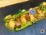 Inserire le cinque foglioline del pesto, e un fiore di borragine al centro della composizione, e i “Fusilloni soffiati con pesto alle 5 foglie e riccioli di Speck Alto Adige IGP” sono pronti.