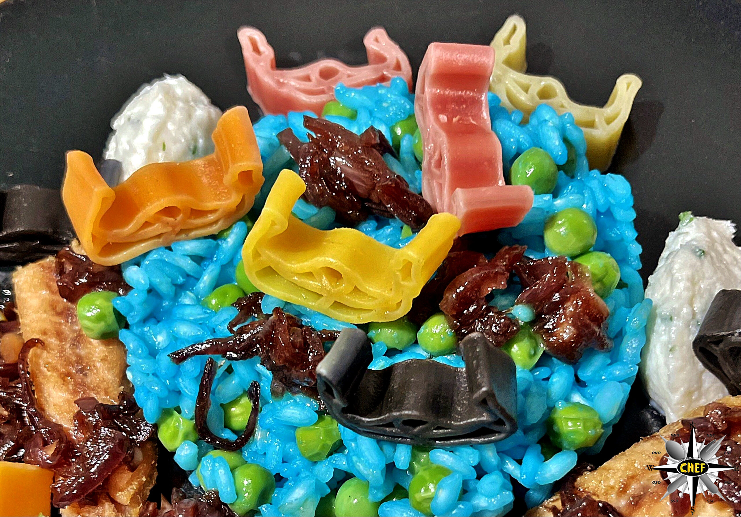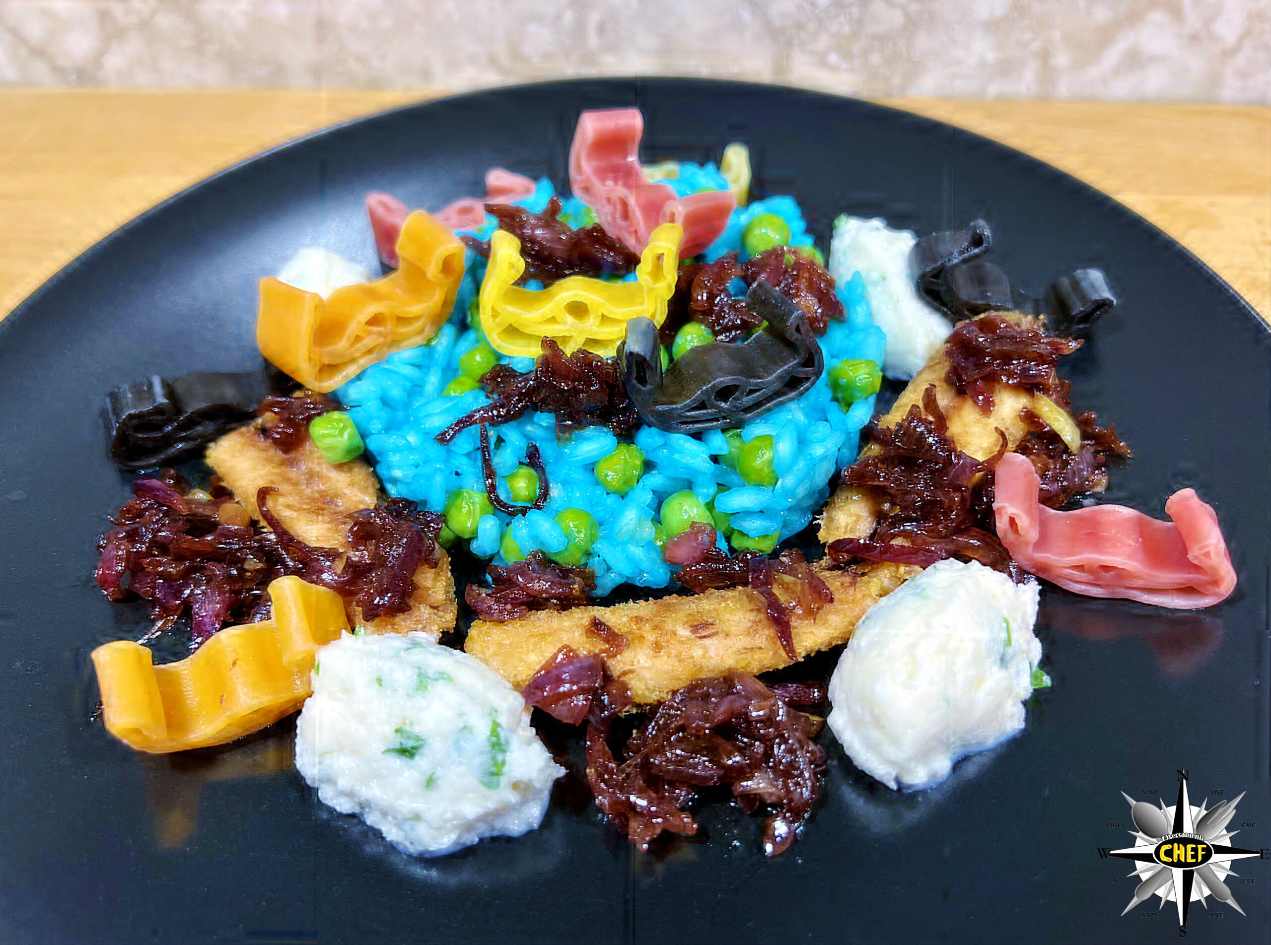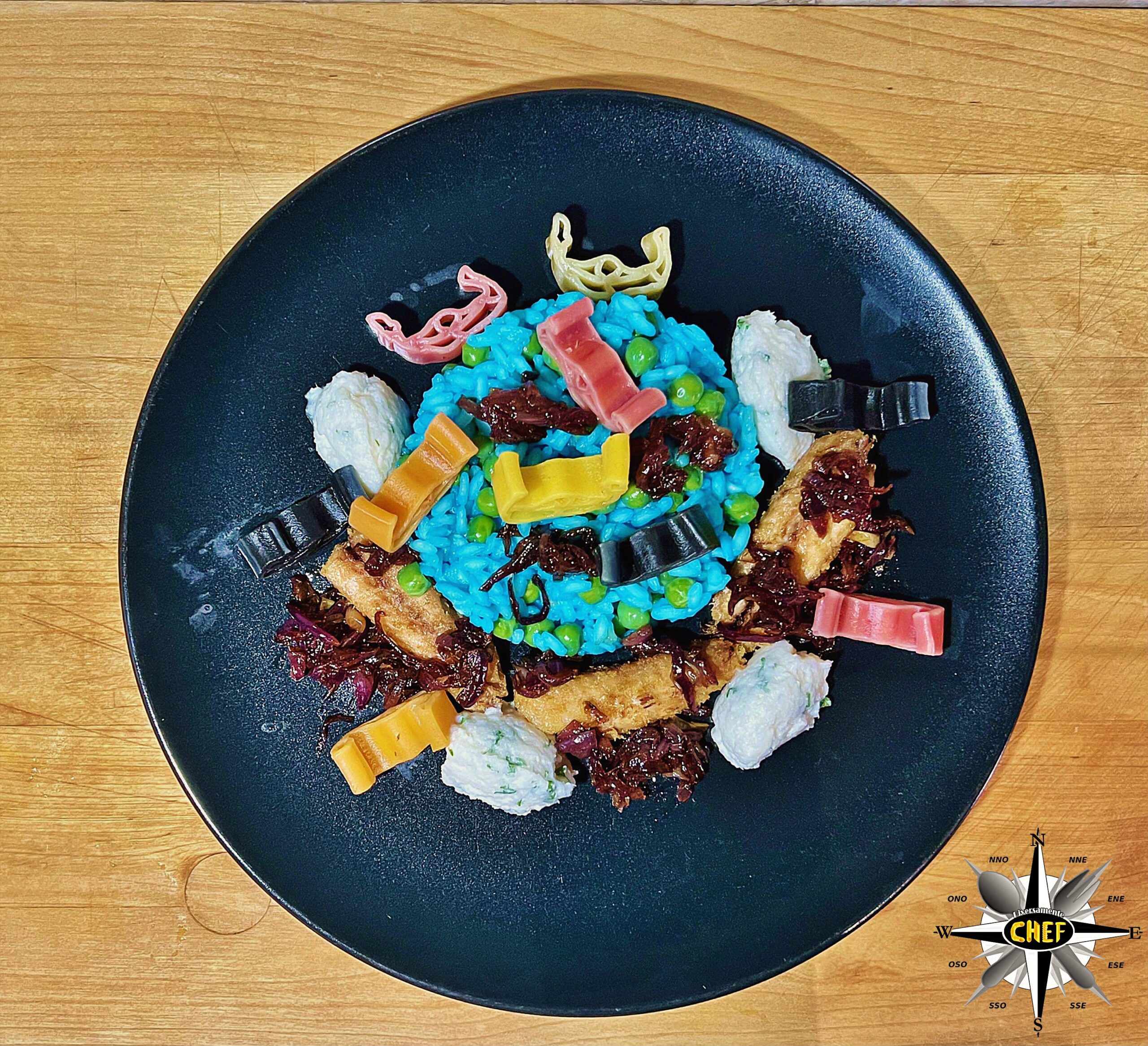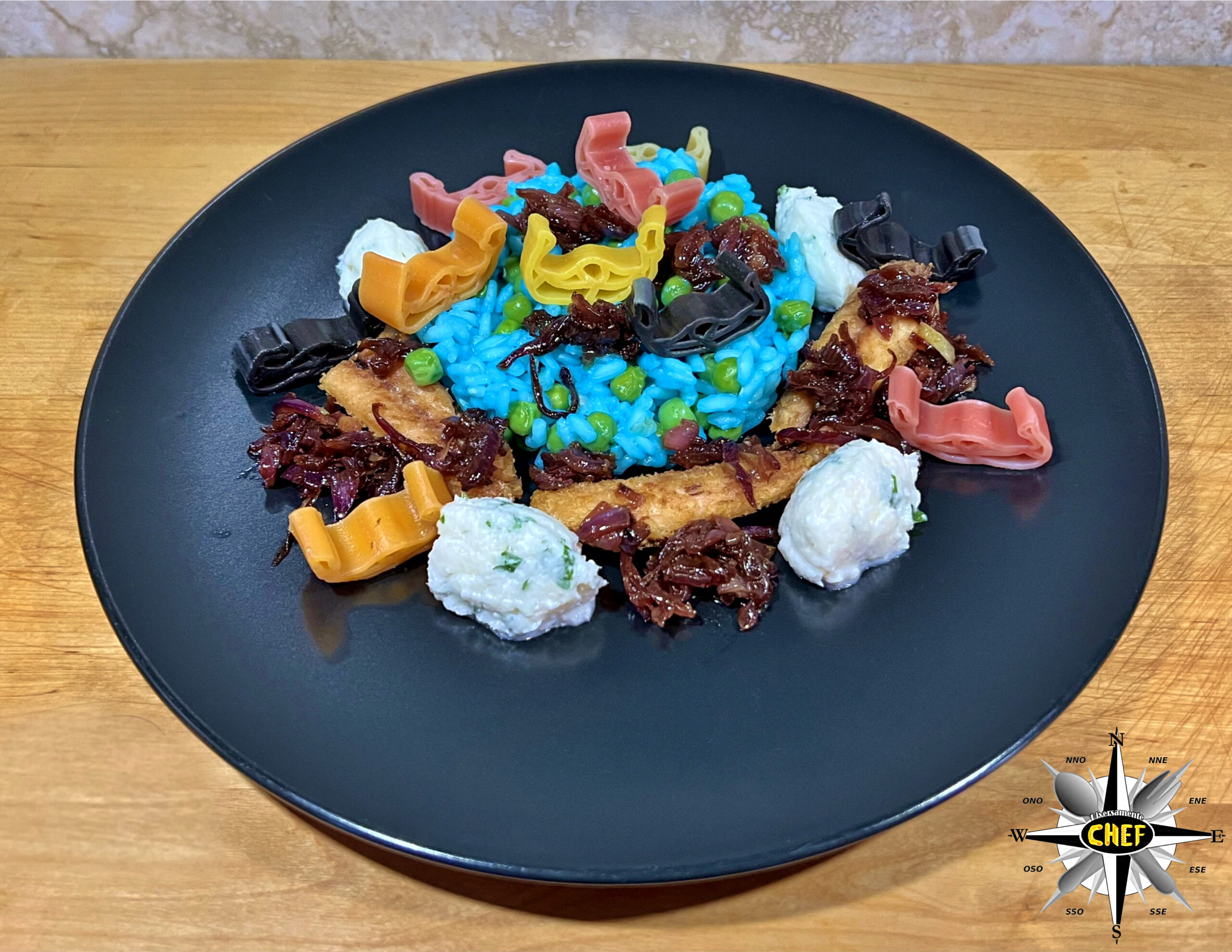 Naturalmente con alcune rielaborazioni che prevedono la colorazione del riso con alga spirulina, la sostituzione dello sgombro al posto delle sarde per il saor e un insolito abbinamento di due tipi di primi nello stesso piatto.