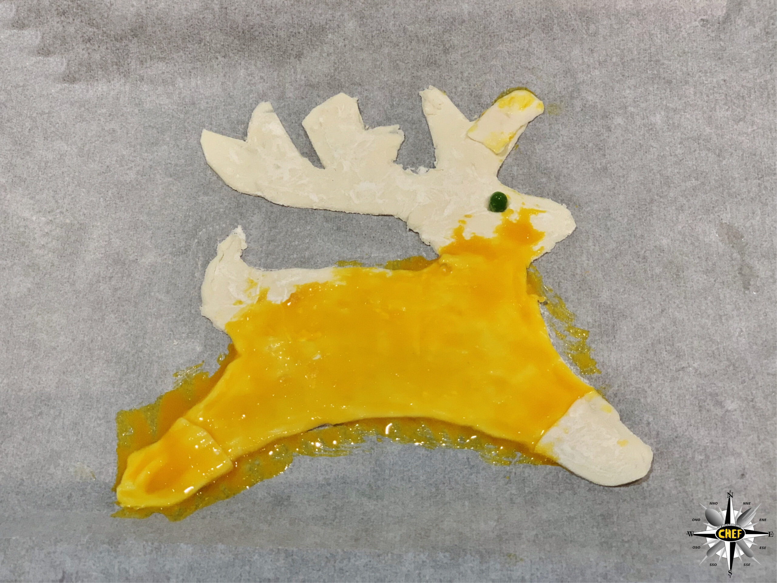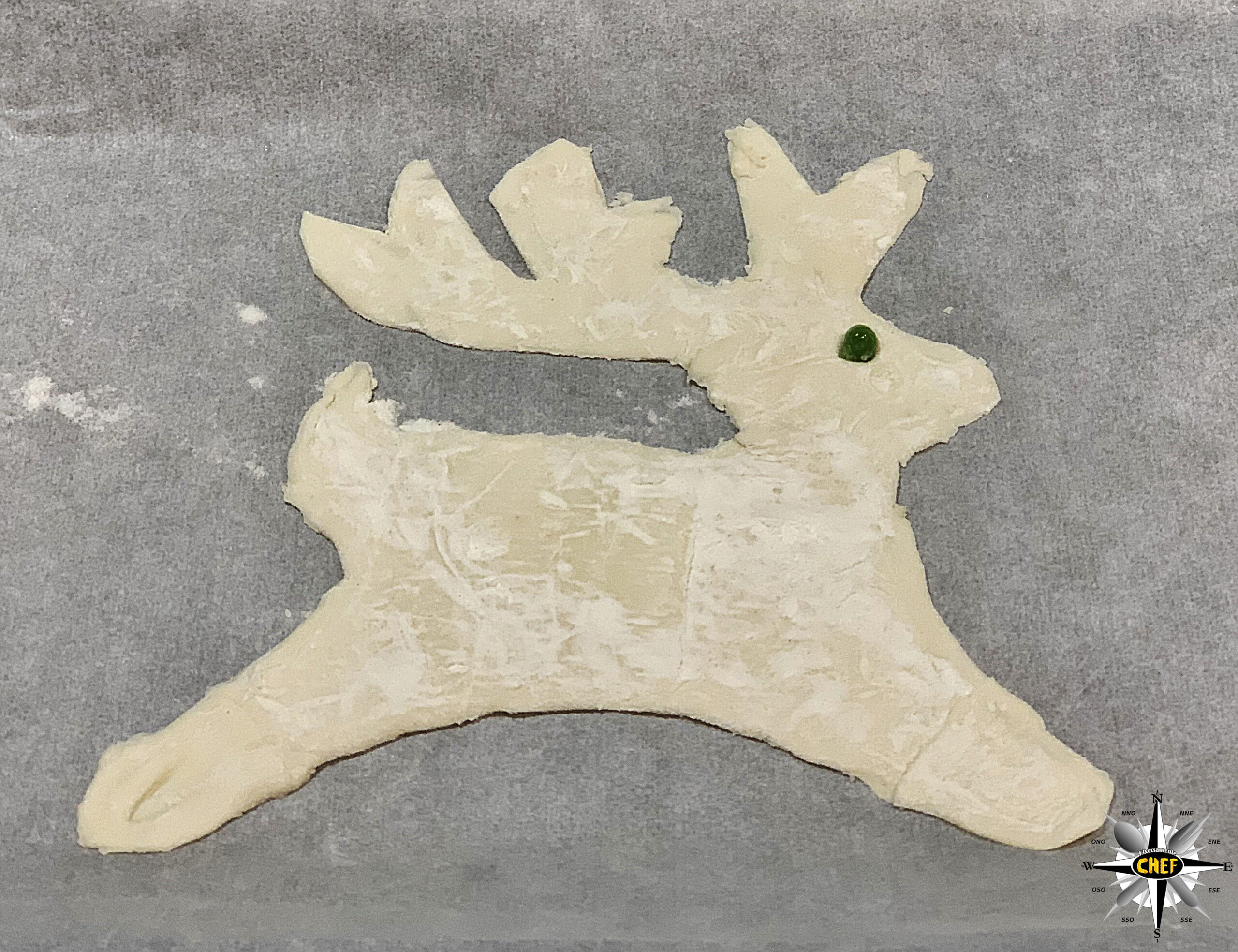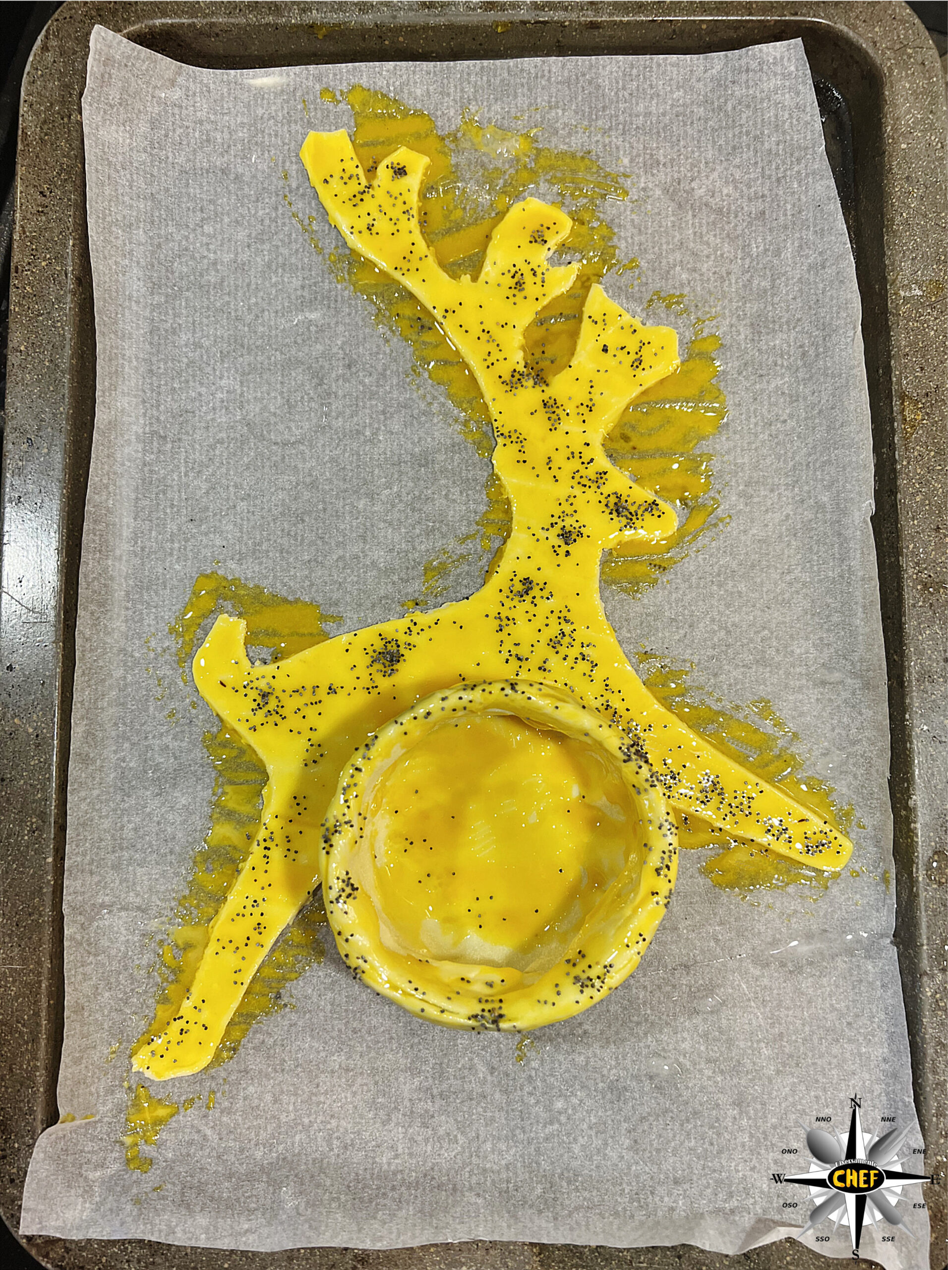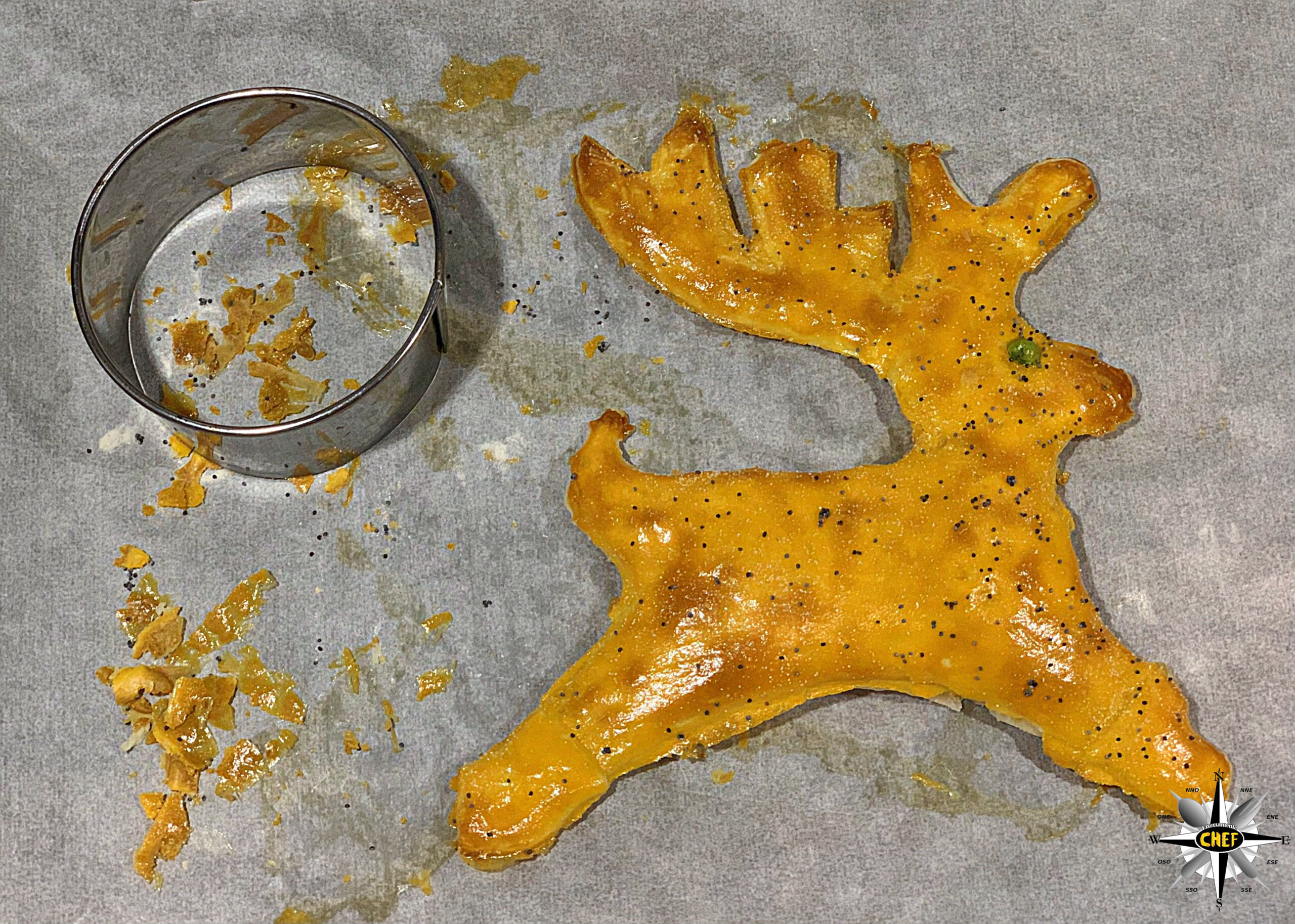 Con una formina (facilmente disponibile tra gli accessori di pasticceria) si ricava una sagoma che ricorda quella del cervo, mentre con un coppapasta rivestito da uno strato di sfoglia si viene a formare il “piatto” che conterrà il goulash.