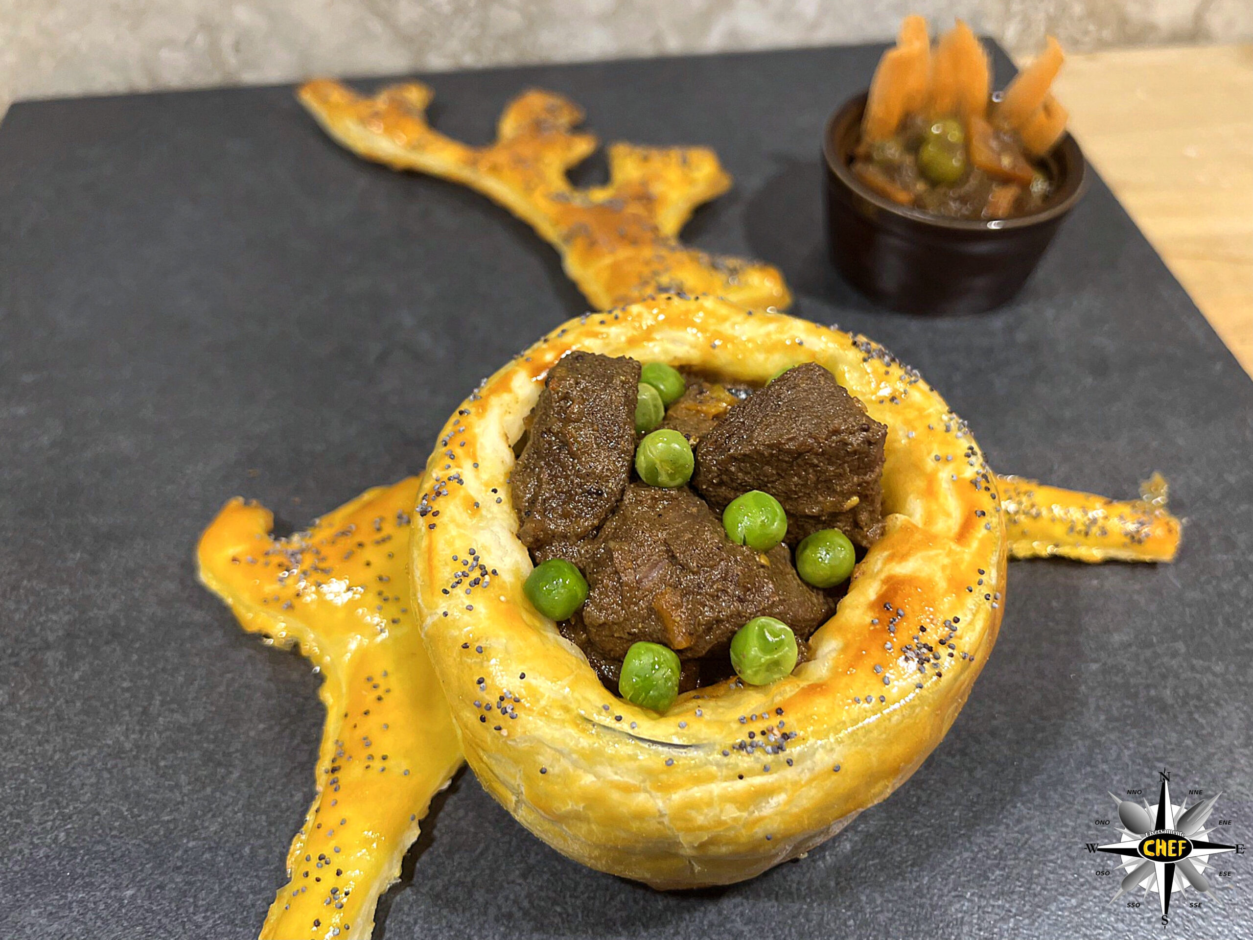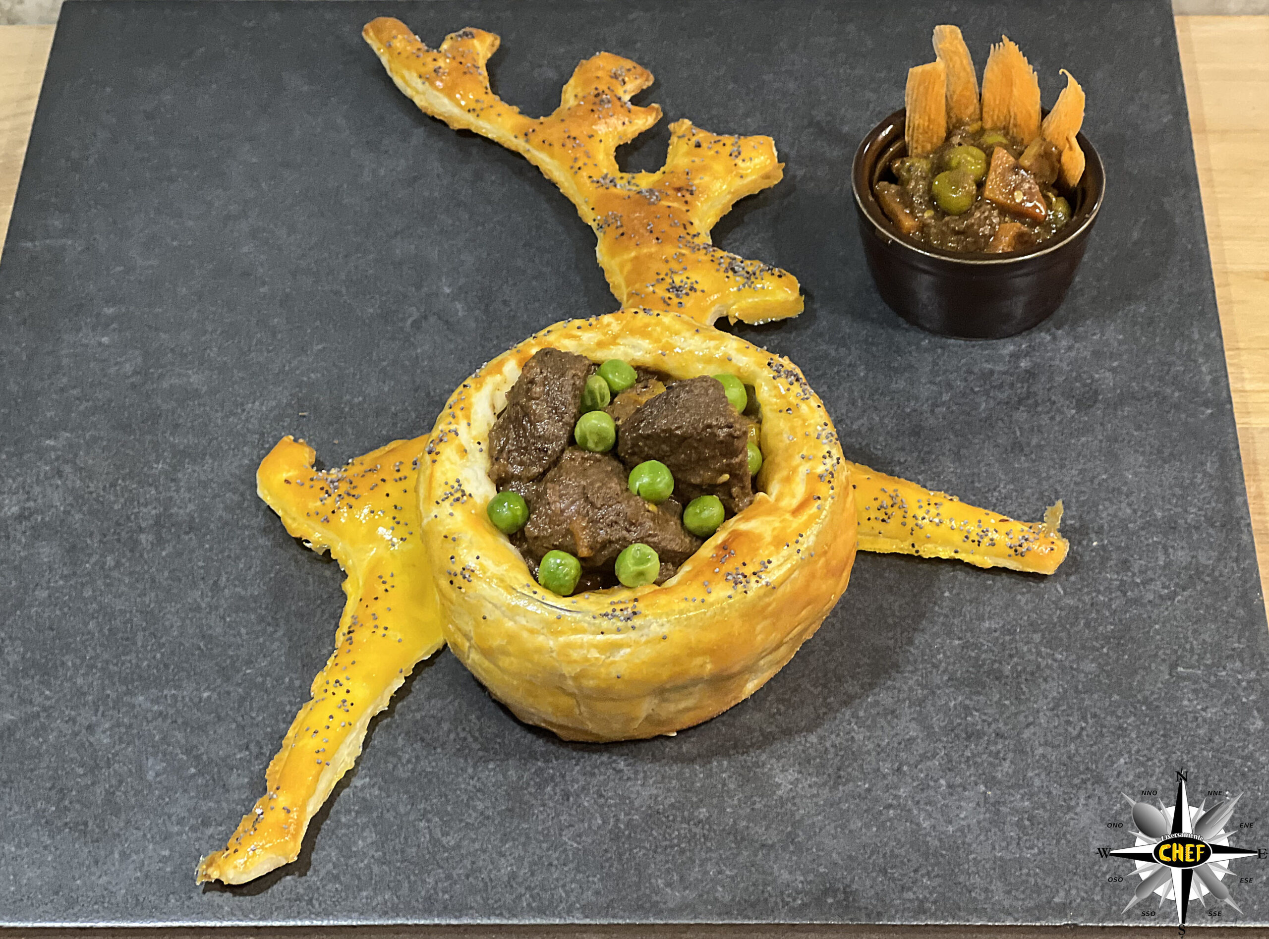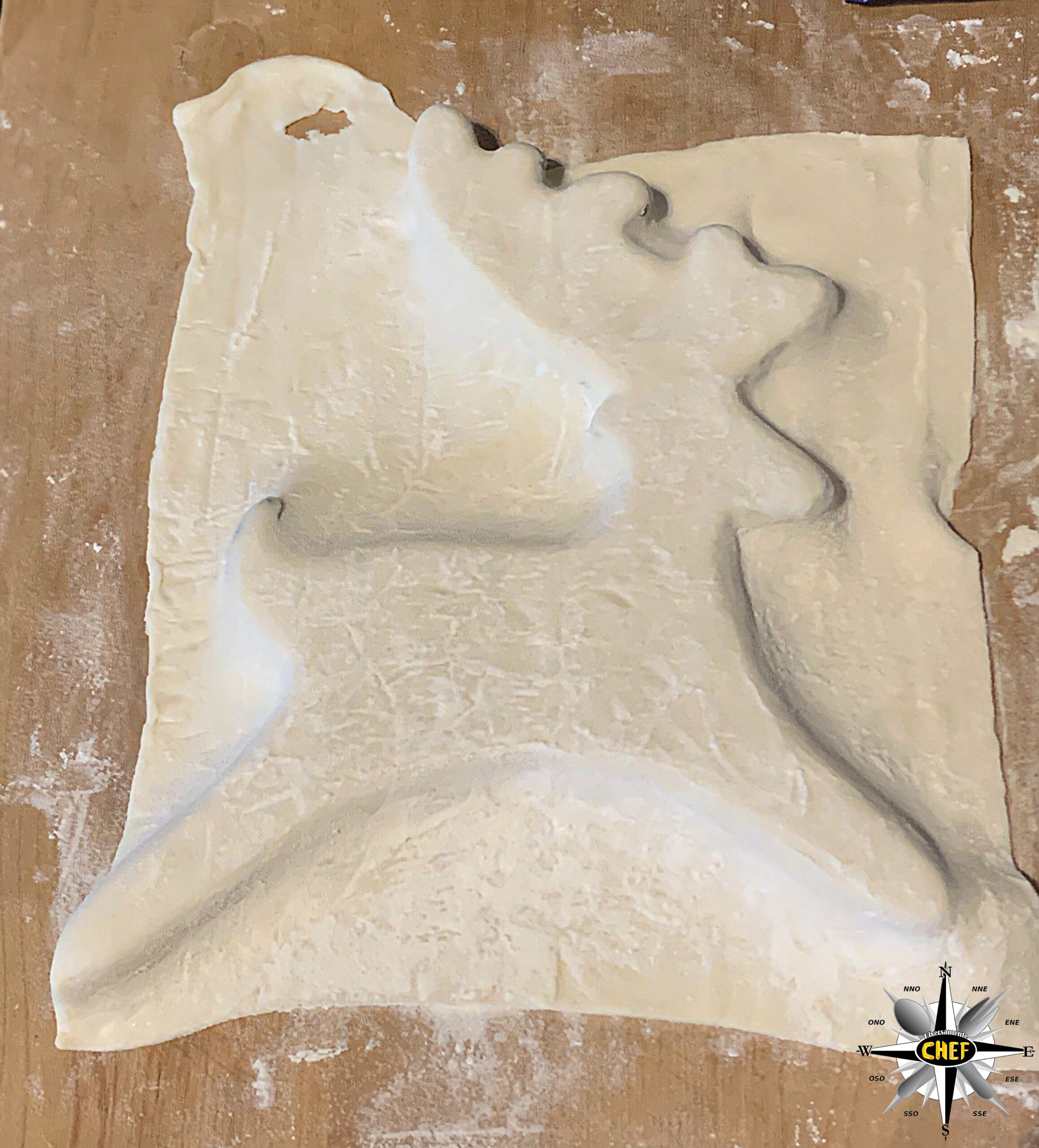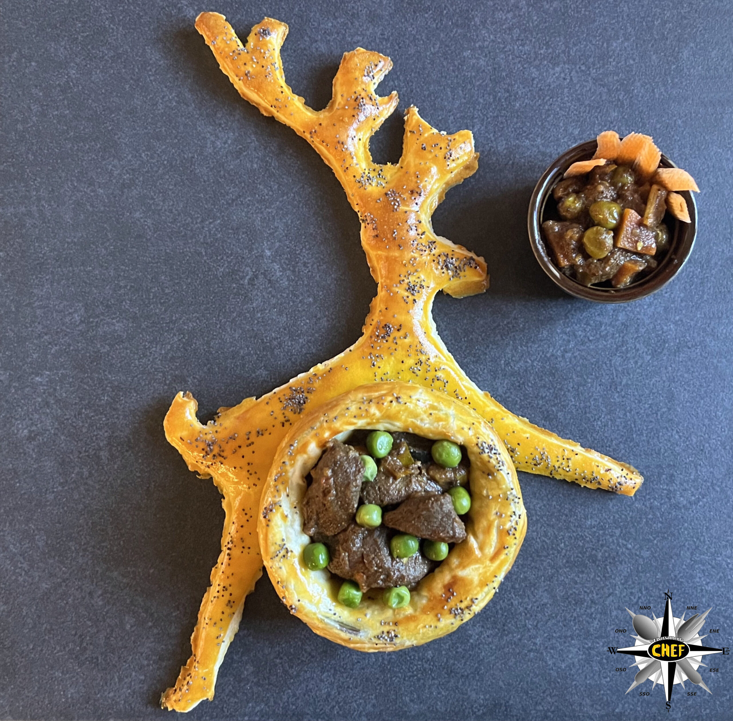 Con una formina (facilmente disponibile tra gli accessori di pasticceria) si ricava una sagoma che ricorda quella del cervo, mentre con un coppapasta rivestito da uno strato di sfoglia si viene a formare il “piatto” che conterrà il goulash.