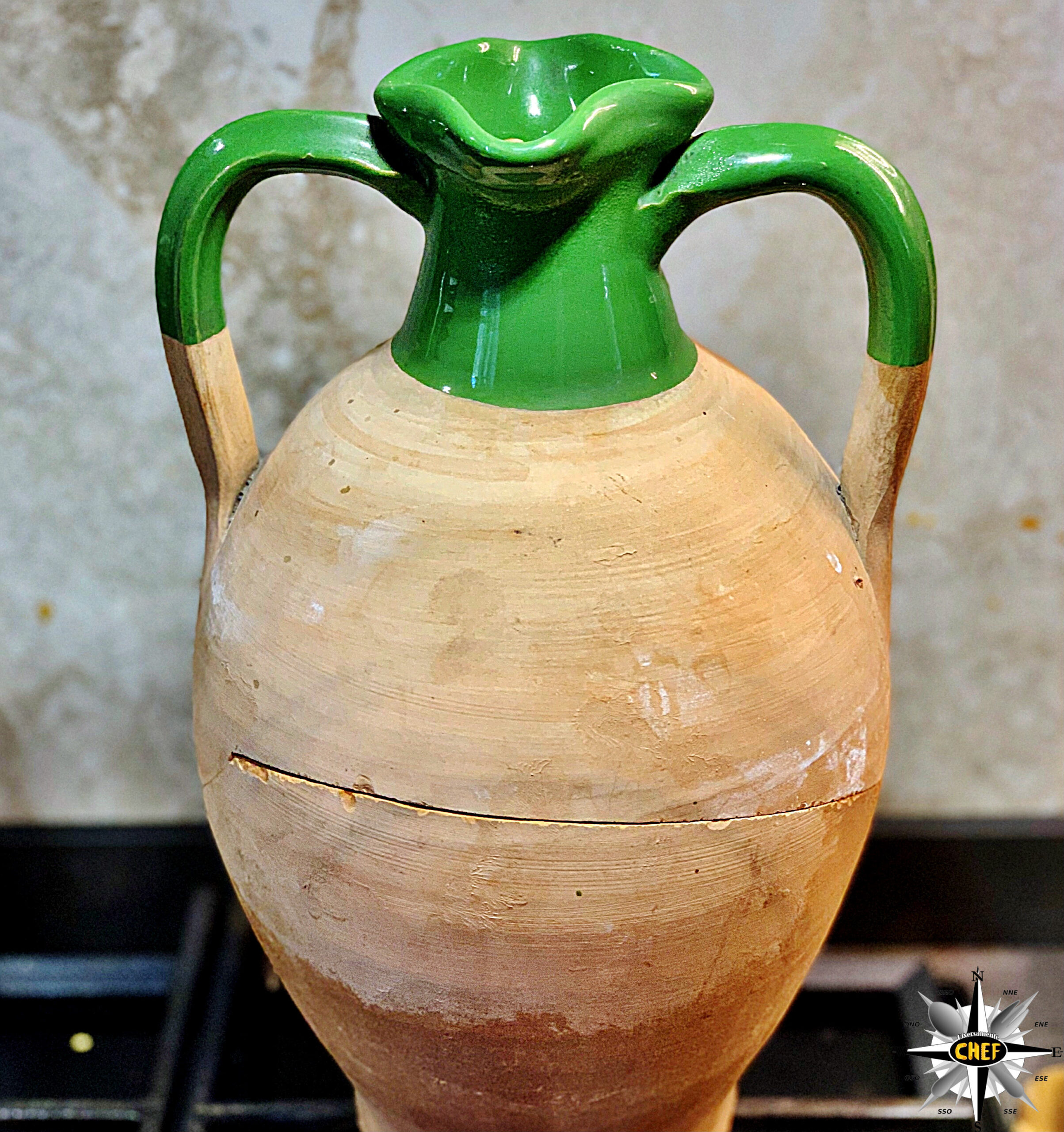 La scelta è caduta sulla classica anfora di terracotta dell’artigianato abruzzese, tagliata a metà ed utilizzata come pentola per la cottura a bagnomaria.