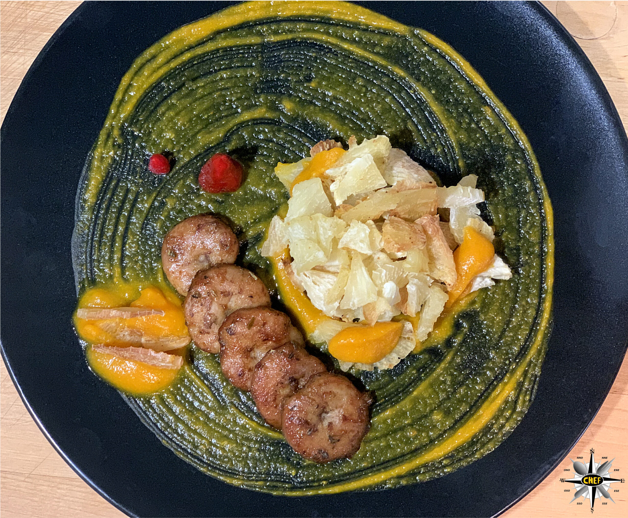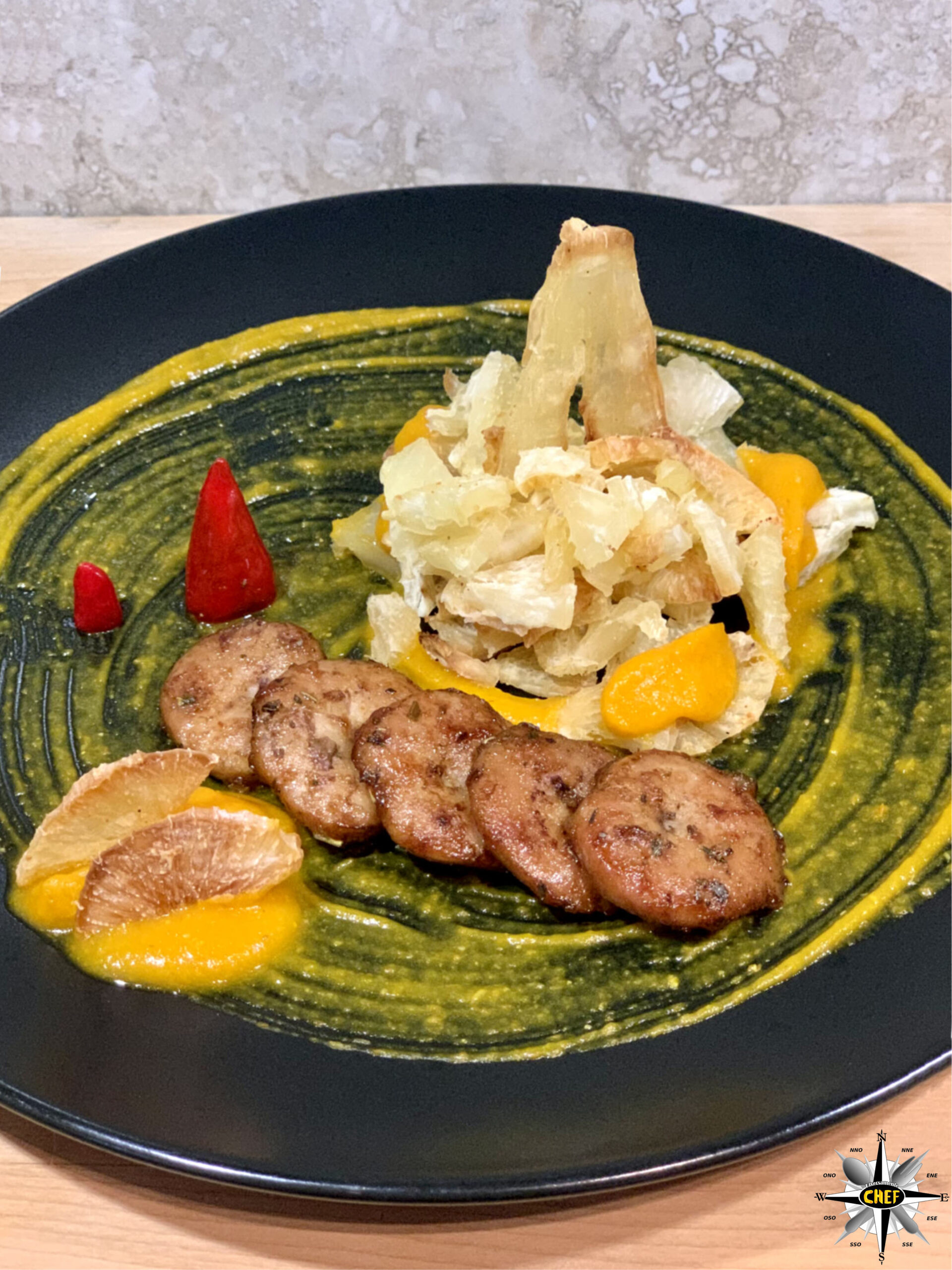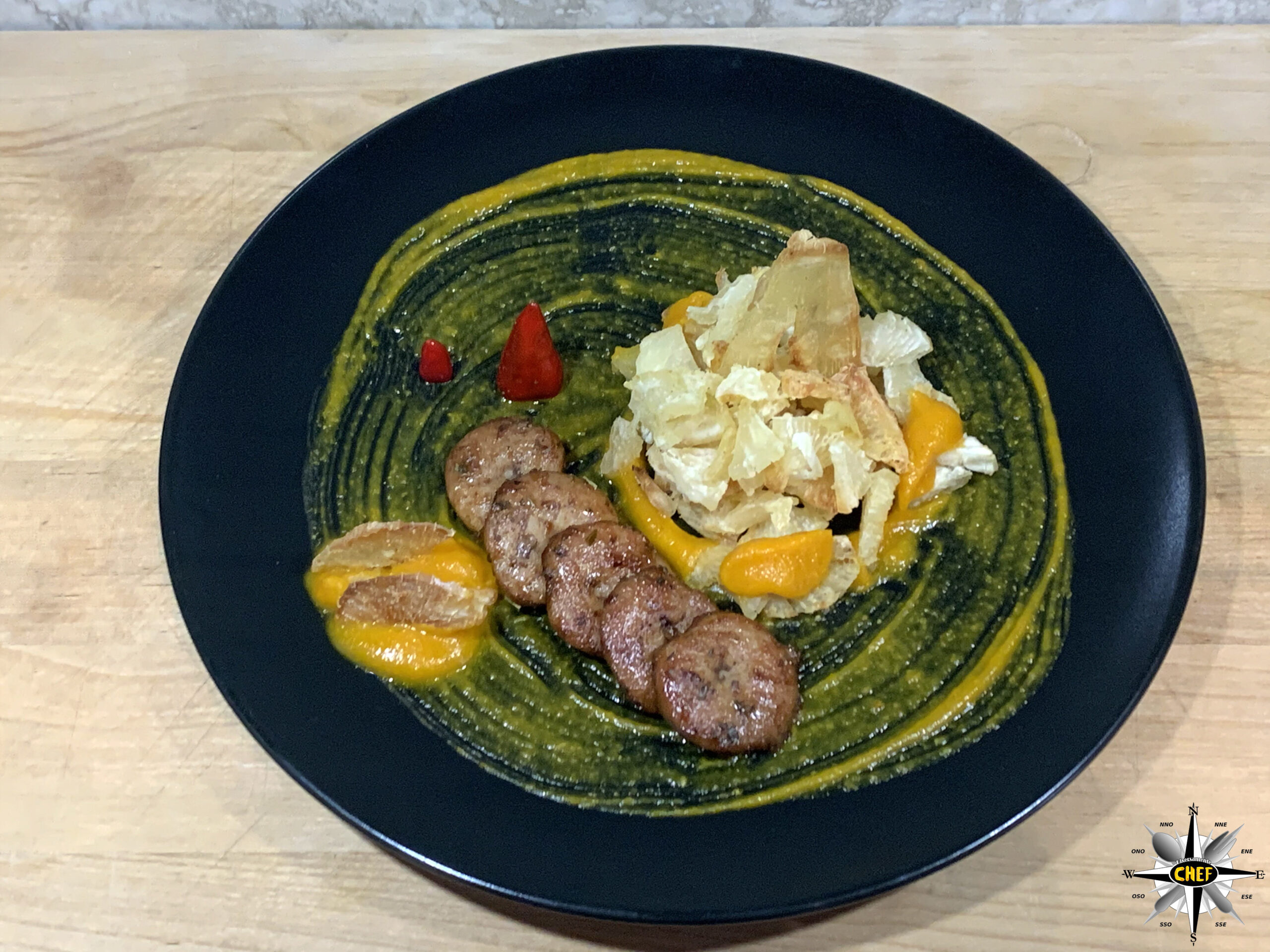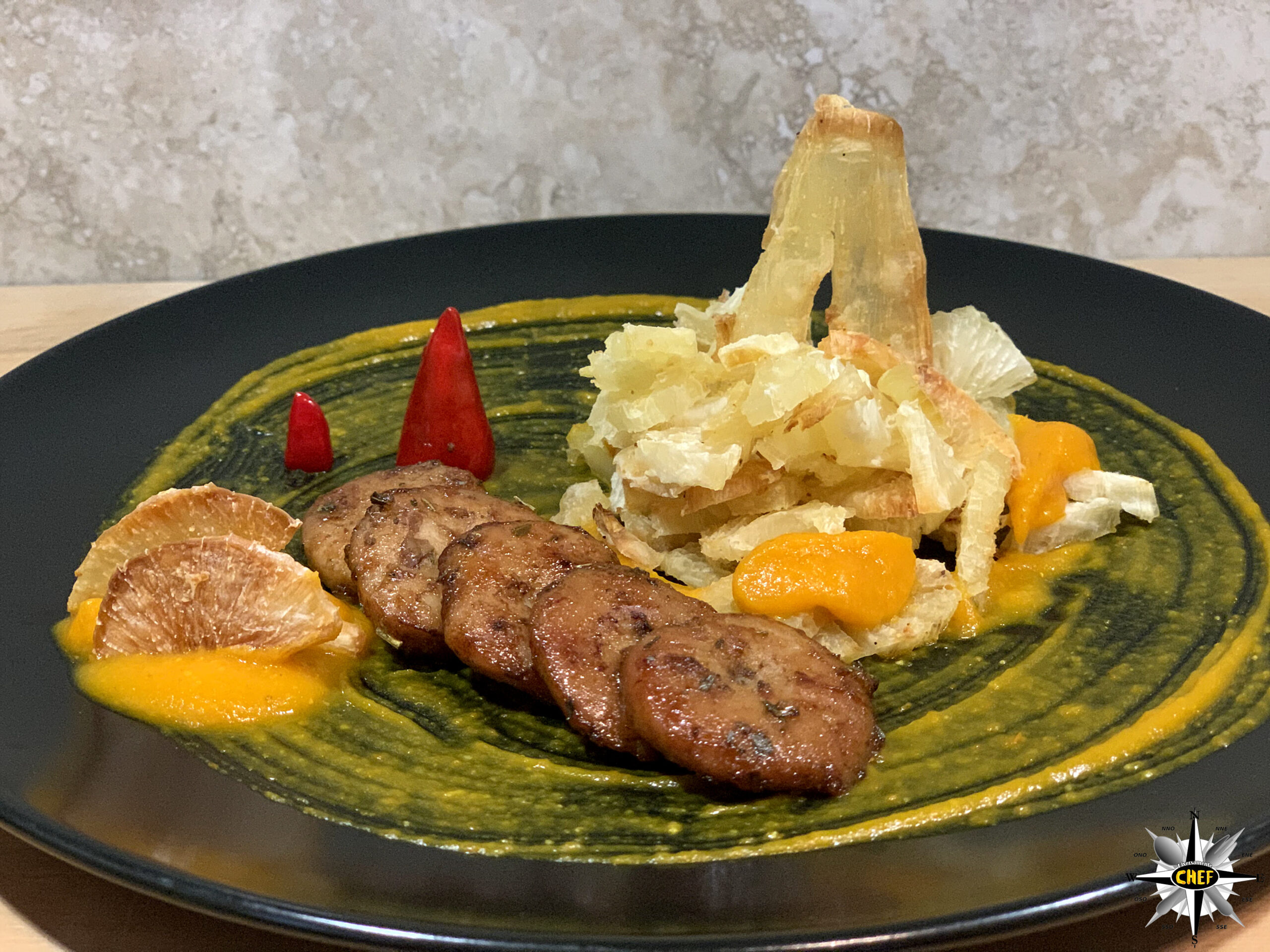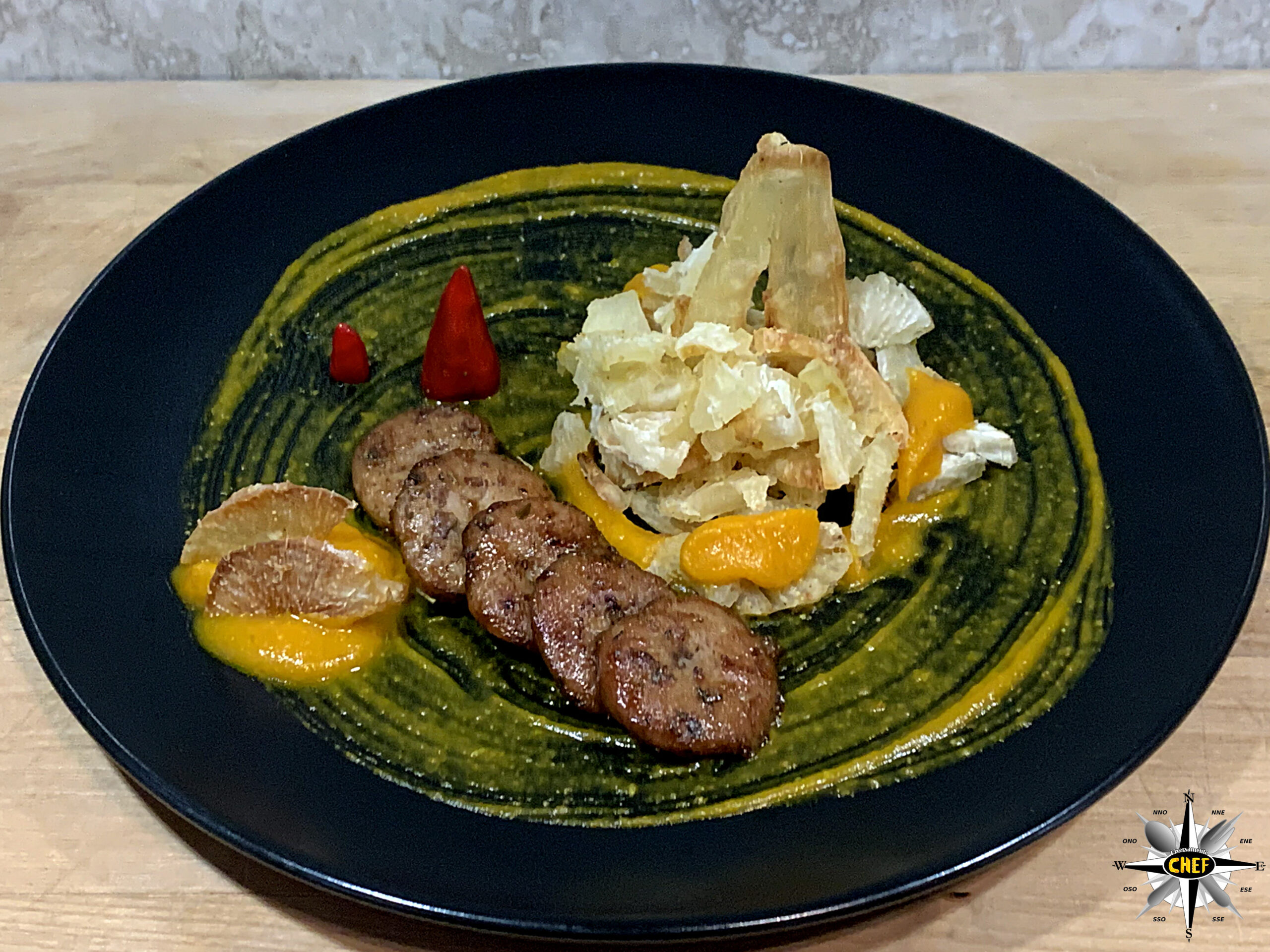 Inserire alcune decorazioni con la pasta de Aji Amarillo (versata con una sac à poche), due cunei di peperoncino Cayenne, e il piatto è pronto.