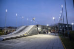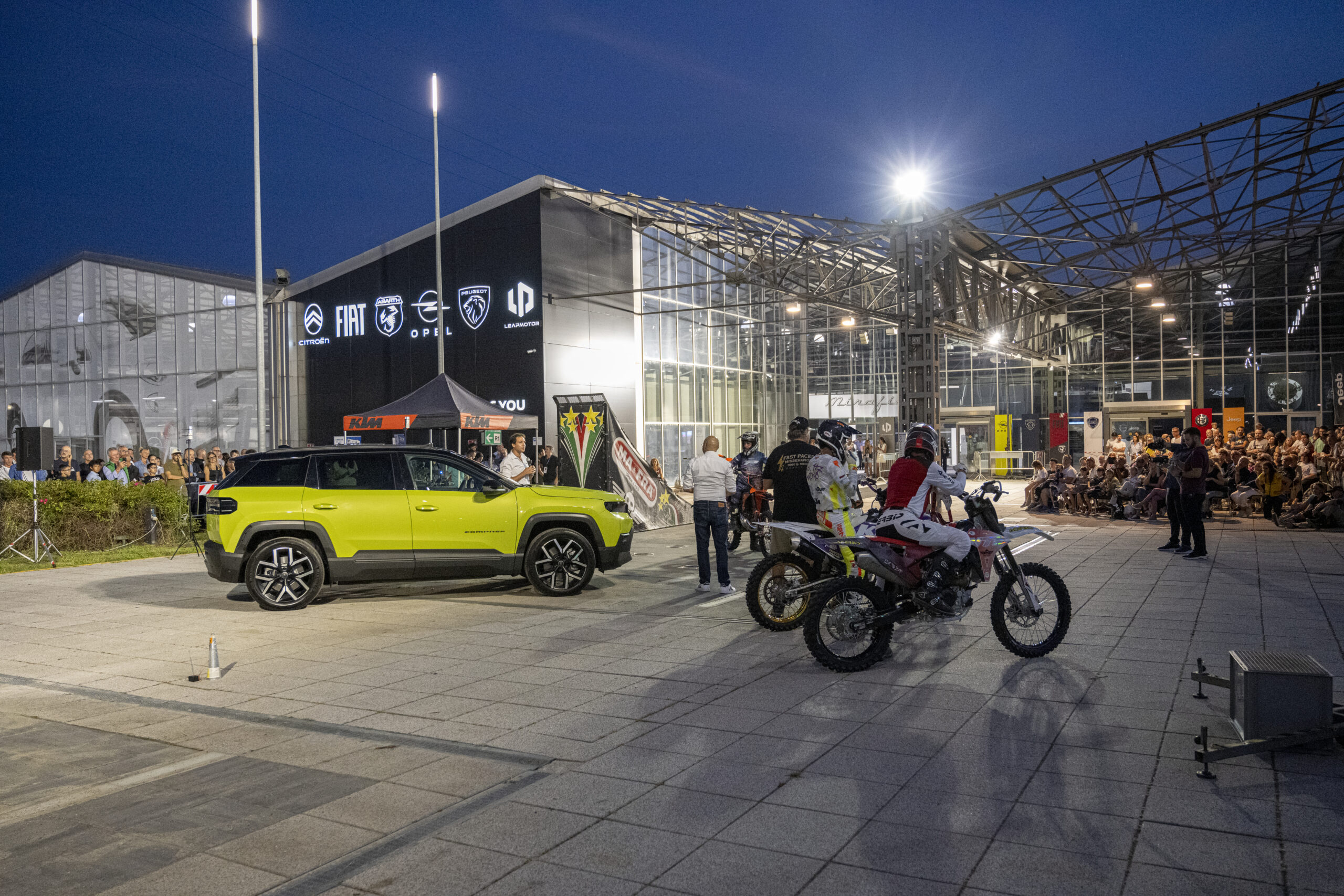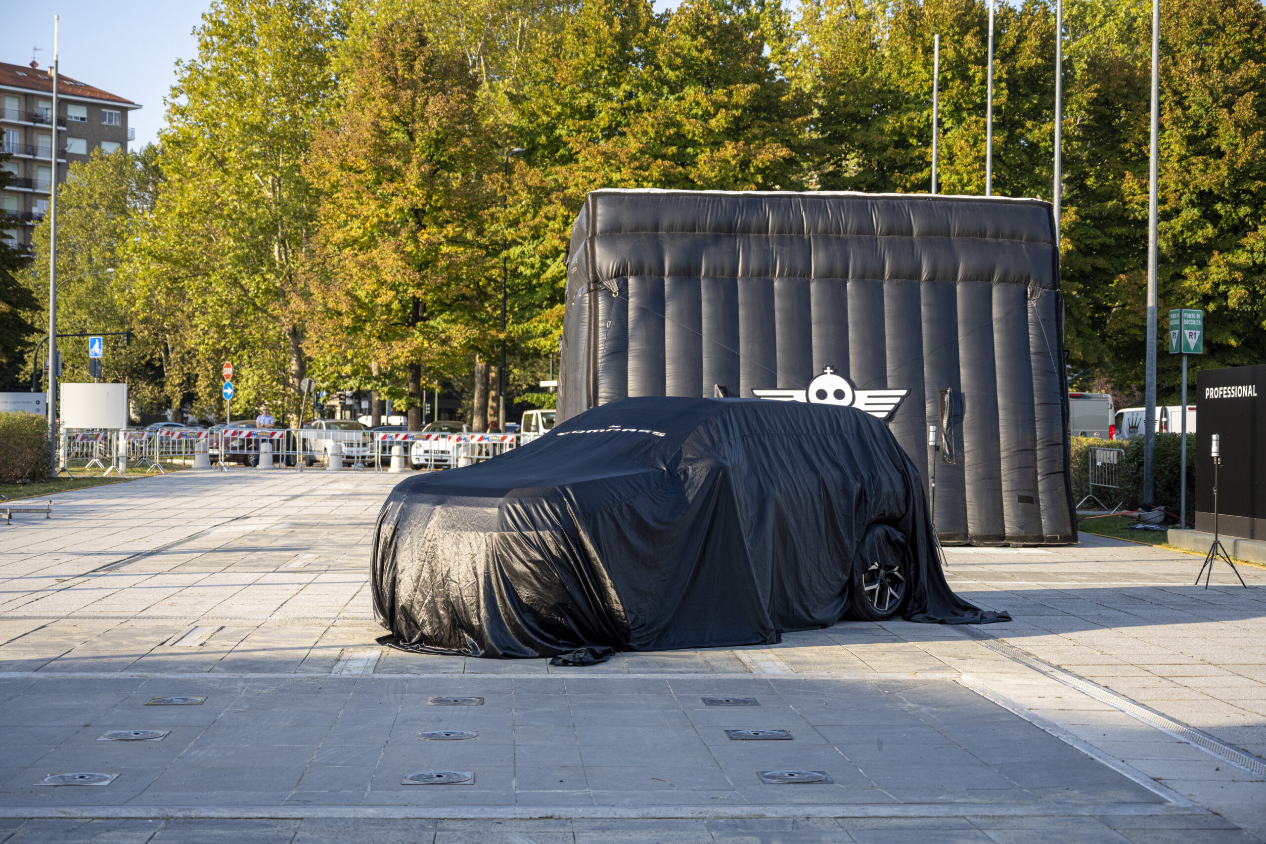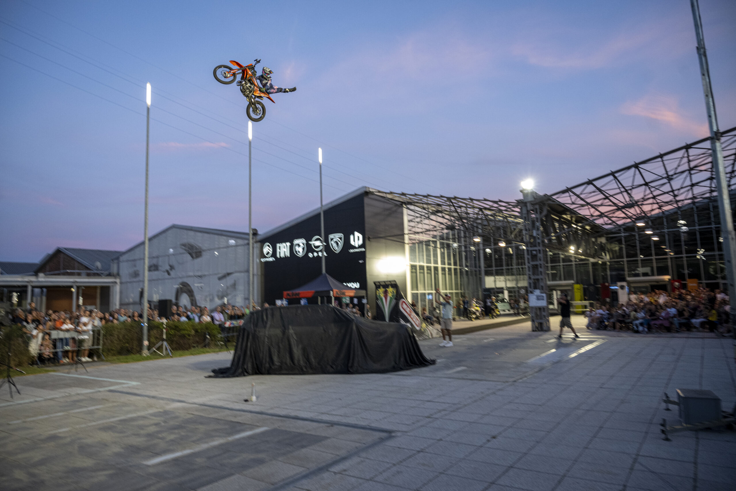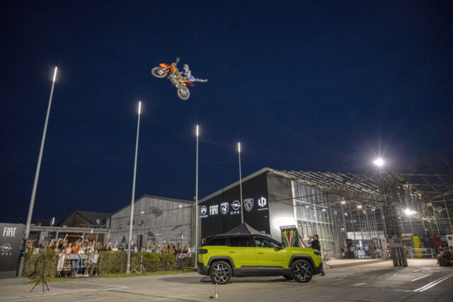 Attorno alle 19:30 le luci si sono accese, la scenografia ha preso forma, i curiosi e gli addetti ai lavori hanno preso posto. Sotto il cielo torinese (di un limpido che non ti aspetti in città), l’auto stava lì, semi-nascosta, pronta a fare il suo ingresso. E non era sola: ad accompagnarla, la performance acrobatica di Vanni Oddera, che ha portato sul palco moto, salti e adrenalina.