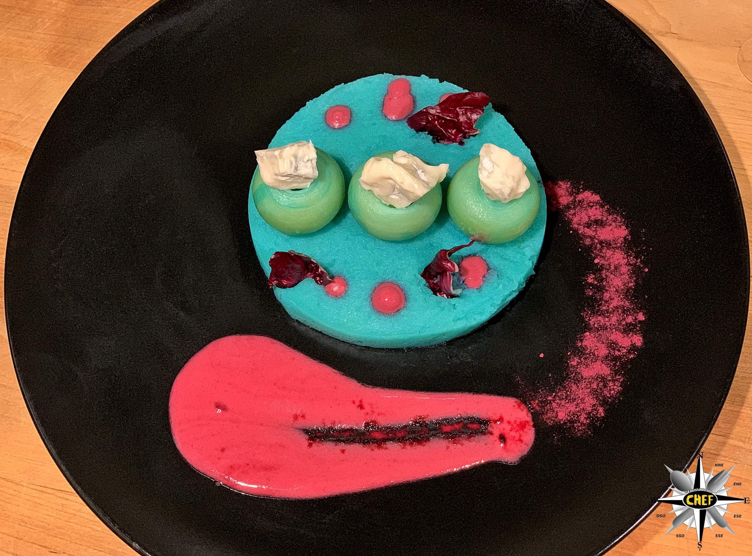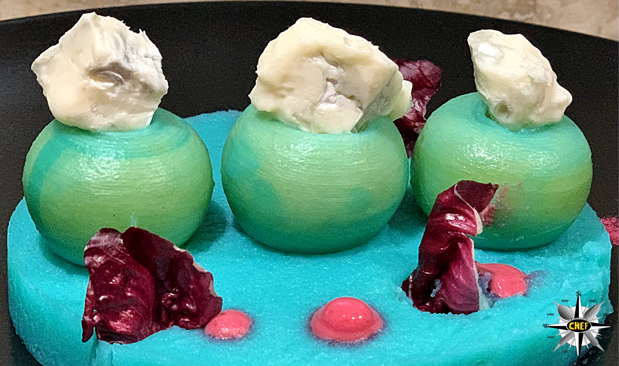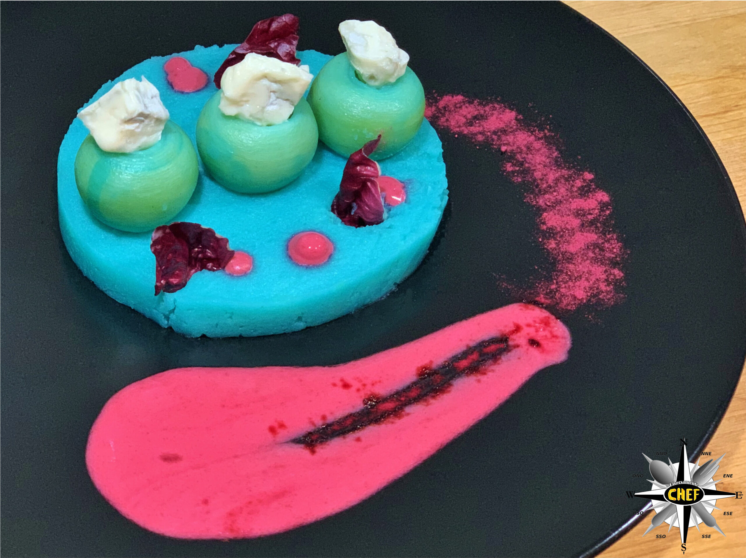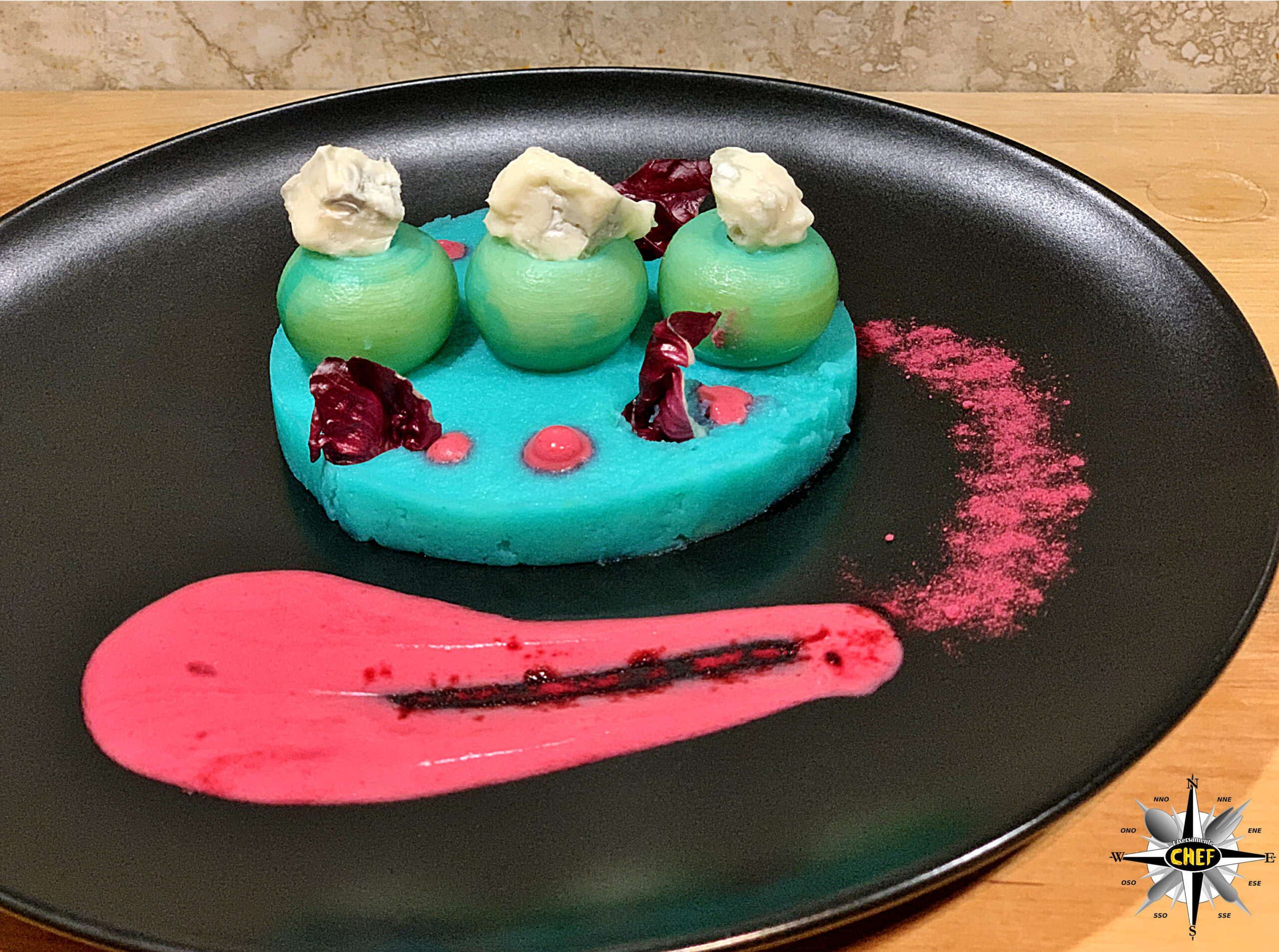 Per questo abbiamo farcito le Sfere col gorgonzola, adagiandole su una piccola laguna blu (formata da una spuma di blue cheese all’alga spirulina) circondata da atolli corallini ottenuti con un cremoso di cavolo rosso e polvere di barbabietola.