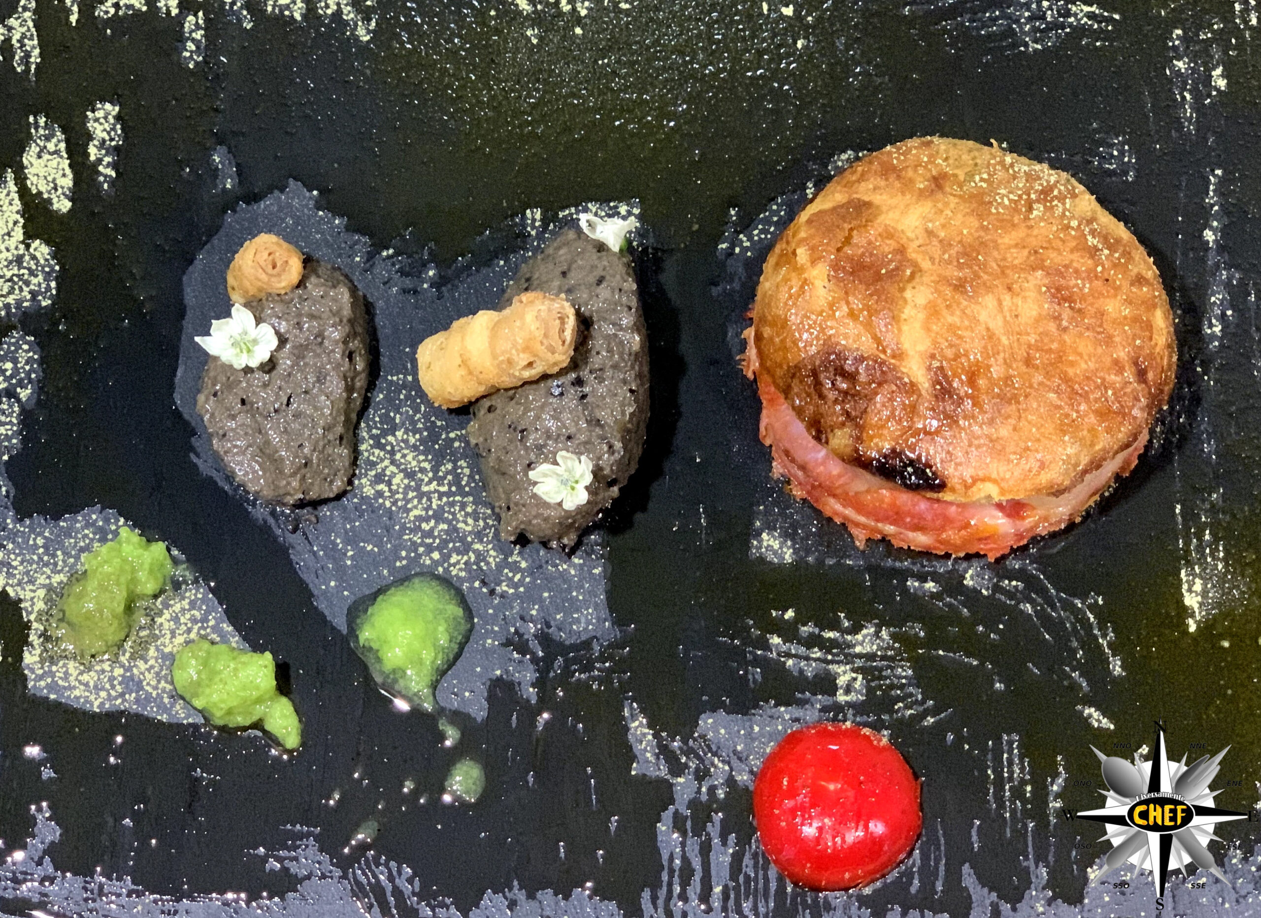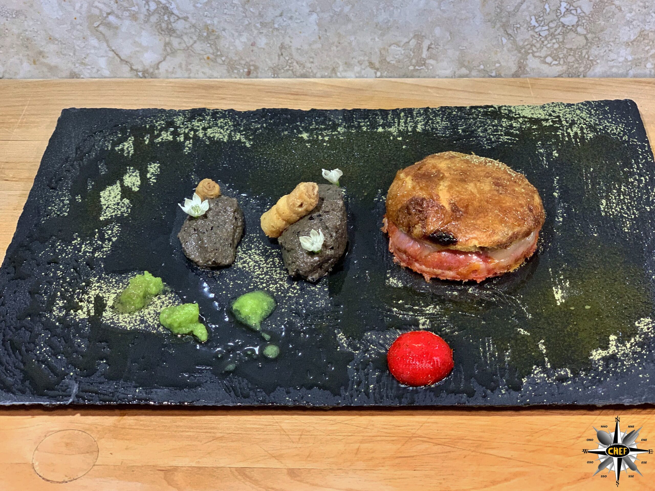 La preparazione delle “Lamine di panettone con Emmentaler DOP e Nduja di Spilinga” può essere suddivisa in tre parti essenziali, dedicate all’allestimento delle lamine (1) che vengono a formare il doppio sandwich farcito, alla realizzazione dei cannoli di guanciale (2) e alla produzione delle salse (3) di accompagnamento (tapenade e crema di piselli).