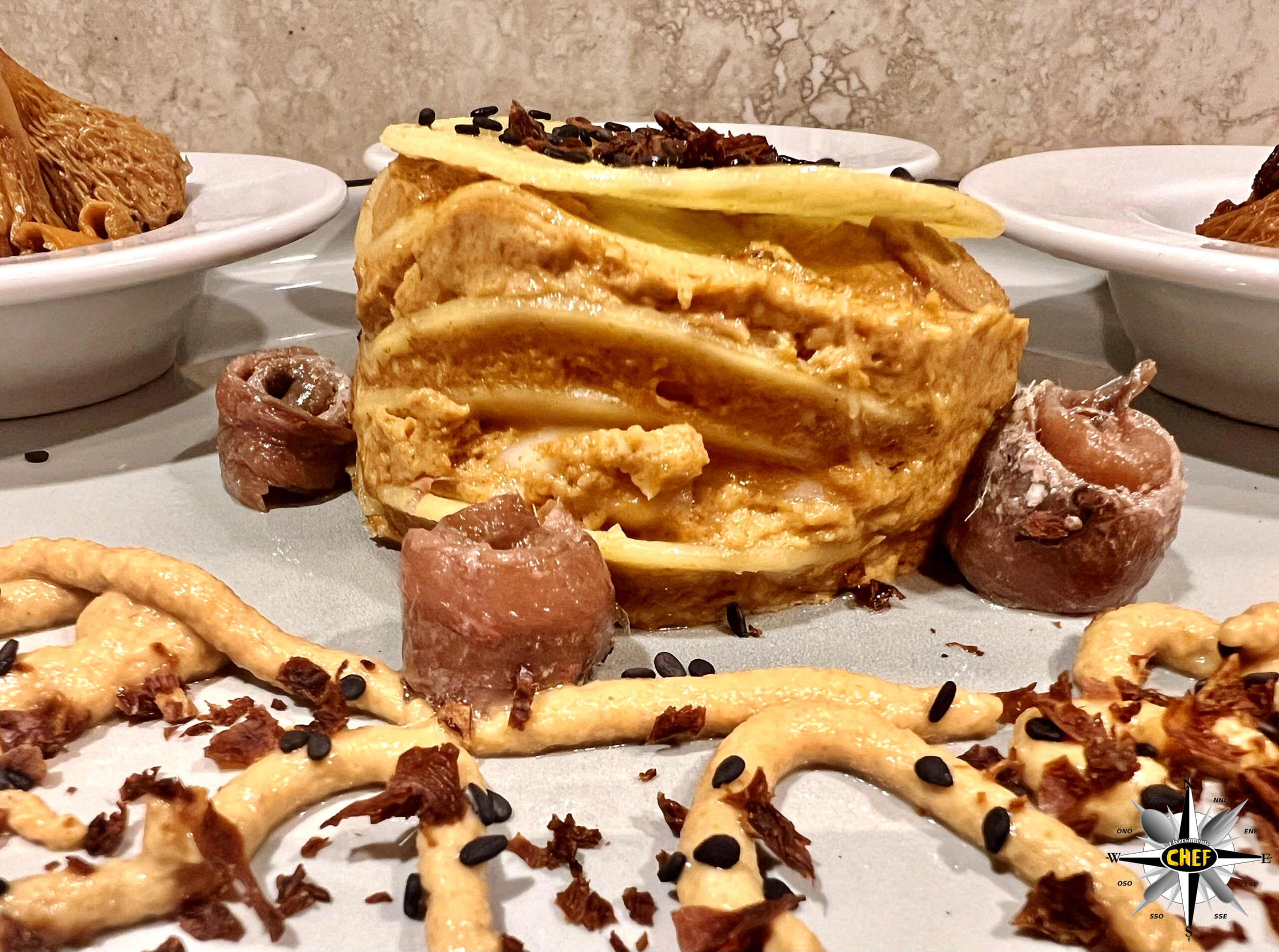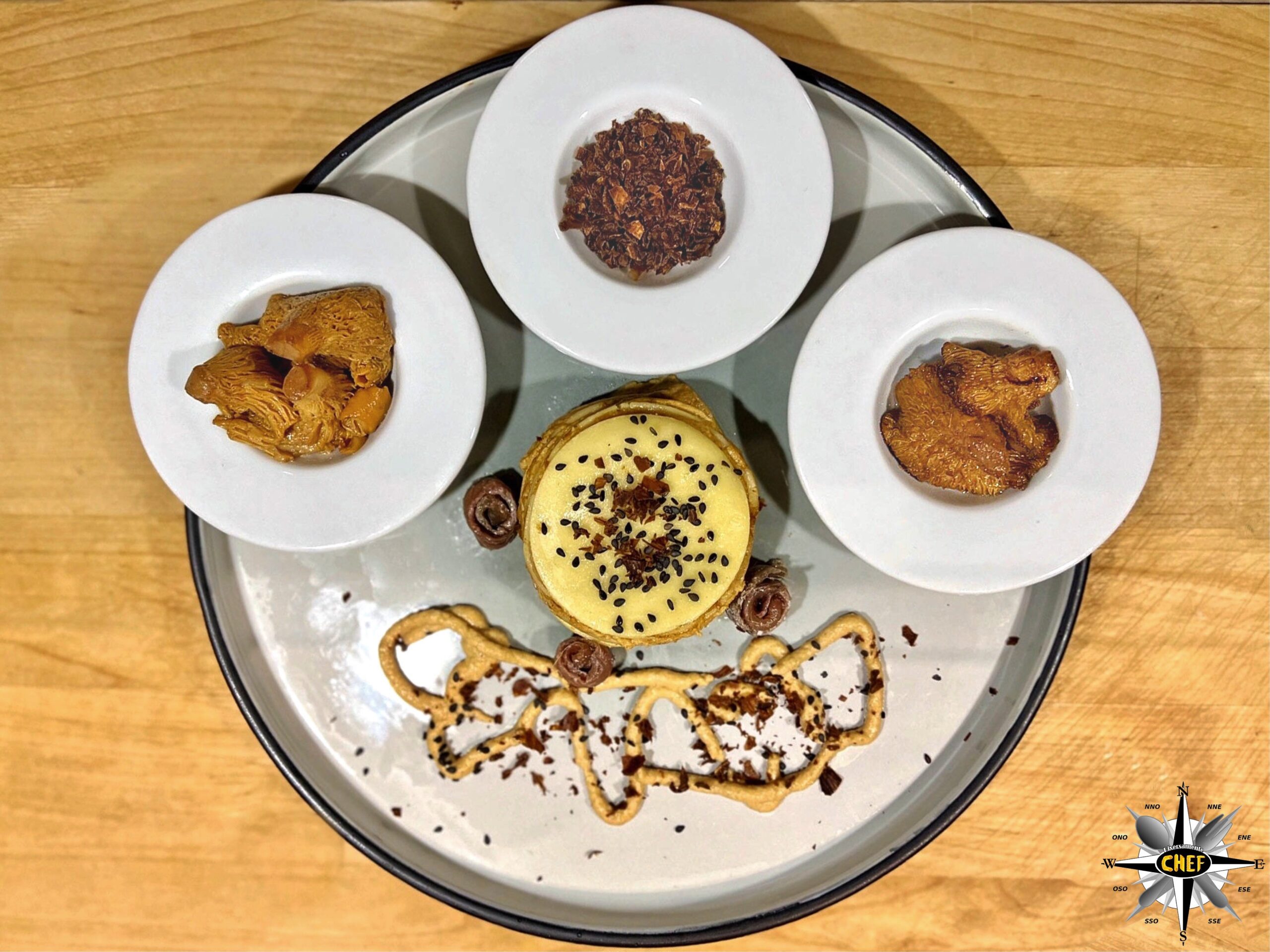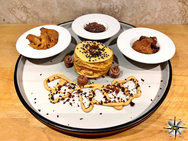 Una spruzzata di semi di sesamo sulla sommità sul disco di pasta, e di crumble sulla mousse, e la “Lasagnetta alle 4 sfumature di finferli, con alici dei Cantabrico e grana di pecora” è pronta.
