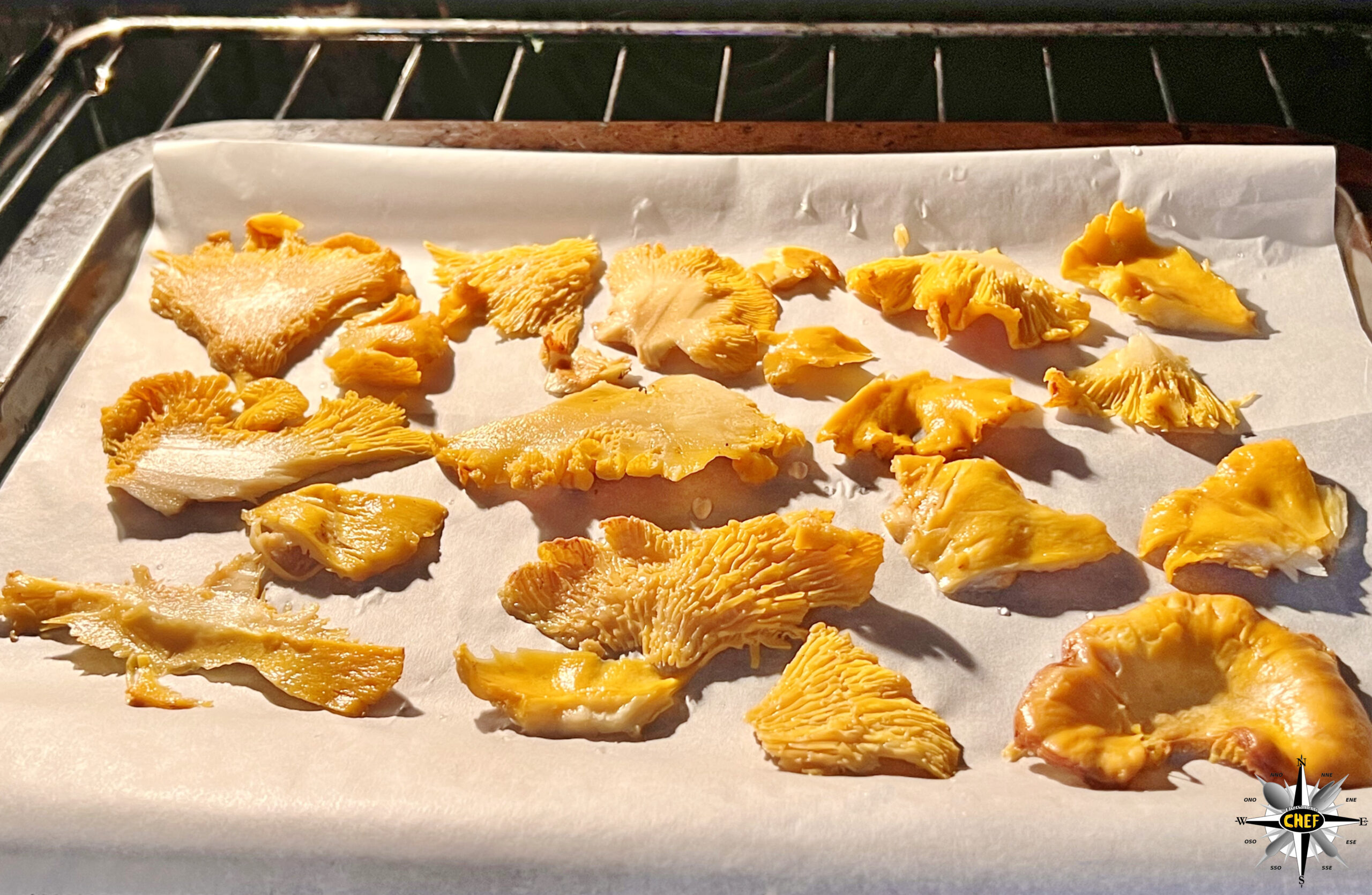 Generalmente la temperatura non dovrebbe oltrepassare i 50° e i tempi variano dalle 8 alle 12 ore, ma in questo caso la nostra “Lasagnetta alle 4 sfumature di finferli, con alici dei Cantabrico e grana di pecora” non richiede una polvere di funghi, ma un crumble, per cui sono sufficienti due ore in forno (in modalità ventilata) ad una temperatura di 80/100°.