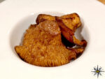 Per sottolineare le 4 diverse sfumature di finferli anche il dressage del piatto doveva evidenziare fin dal primo impatto visivo per cui l’impiattamento presenta le diverse cotture dei funghi, che circondano ad anello la lasagnetta adagiata al centro del piatto e attorno alla quale sono addossate le acciughe del Cantabrico.