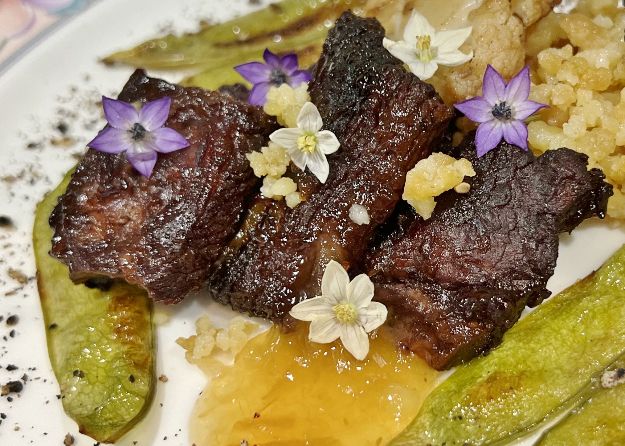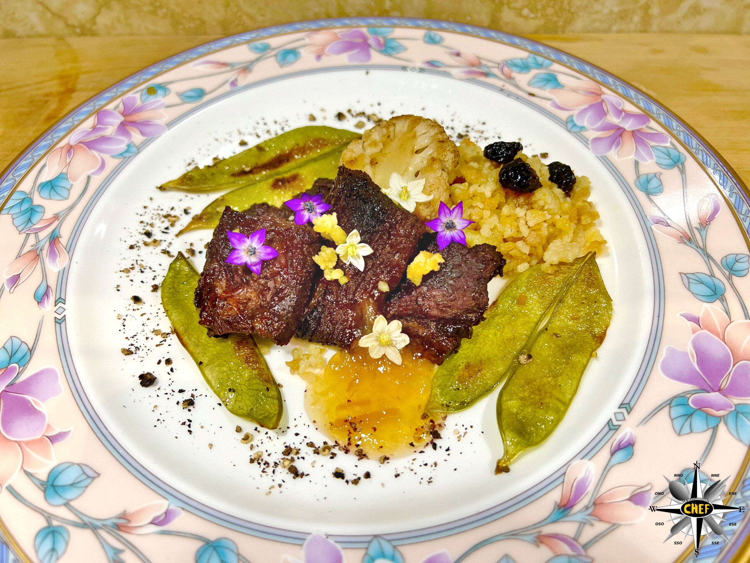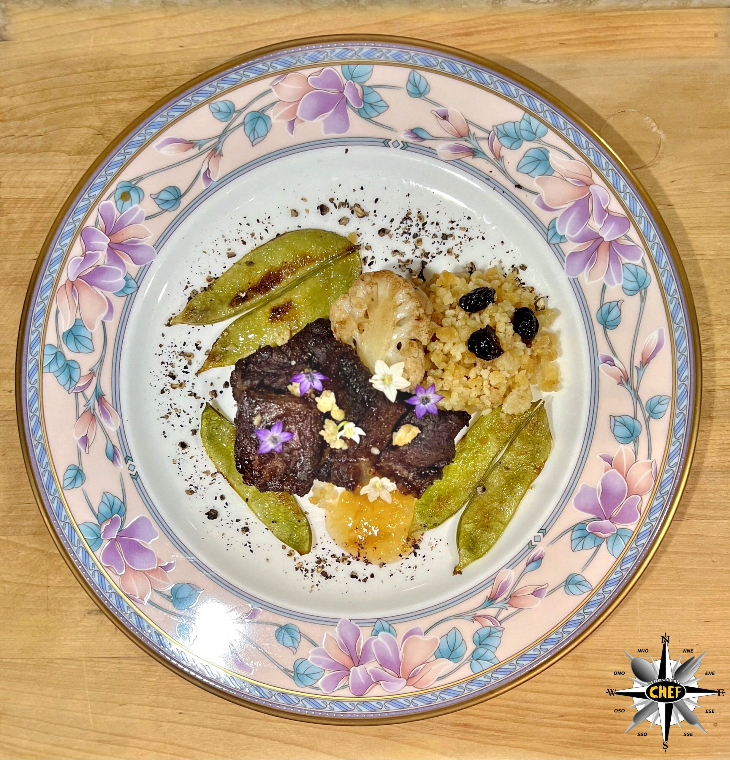 Inserire i fiori di malva e di peperoncino bianco, e i “Medaglioni di sella di pecora in composta di pompia, con fregola e polvere di mirto” sono pronti.