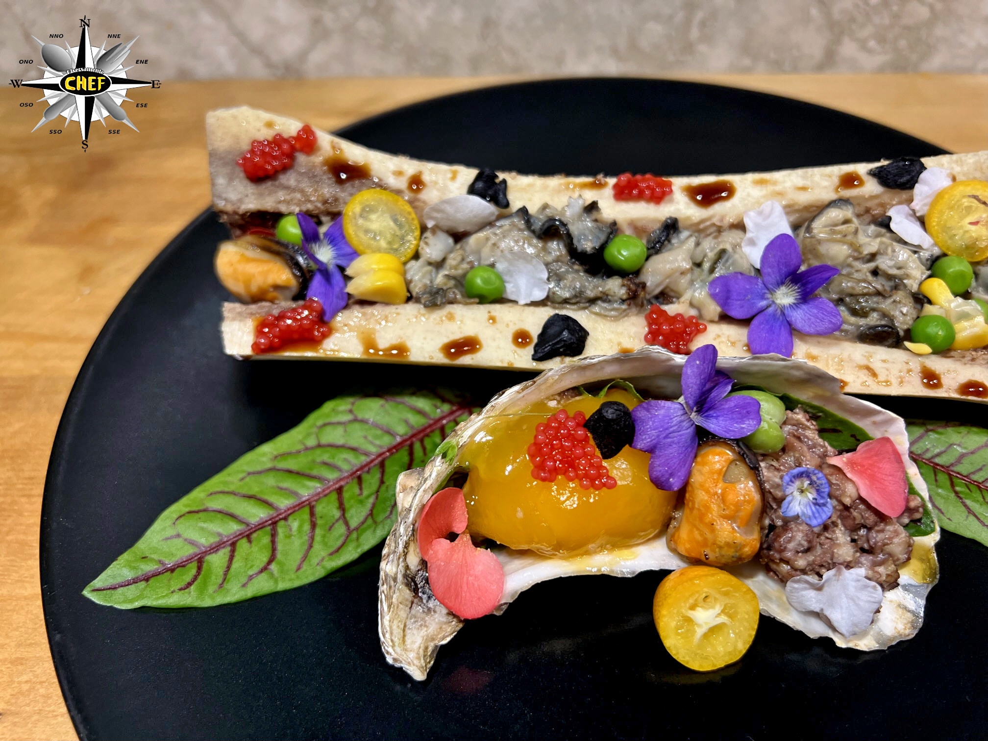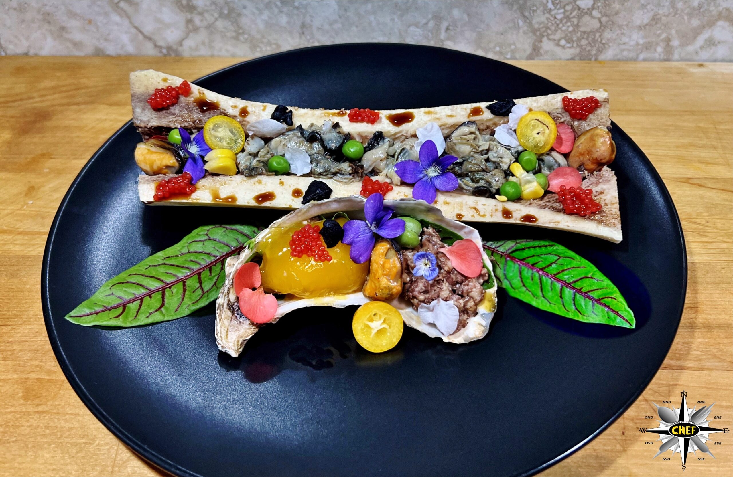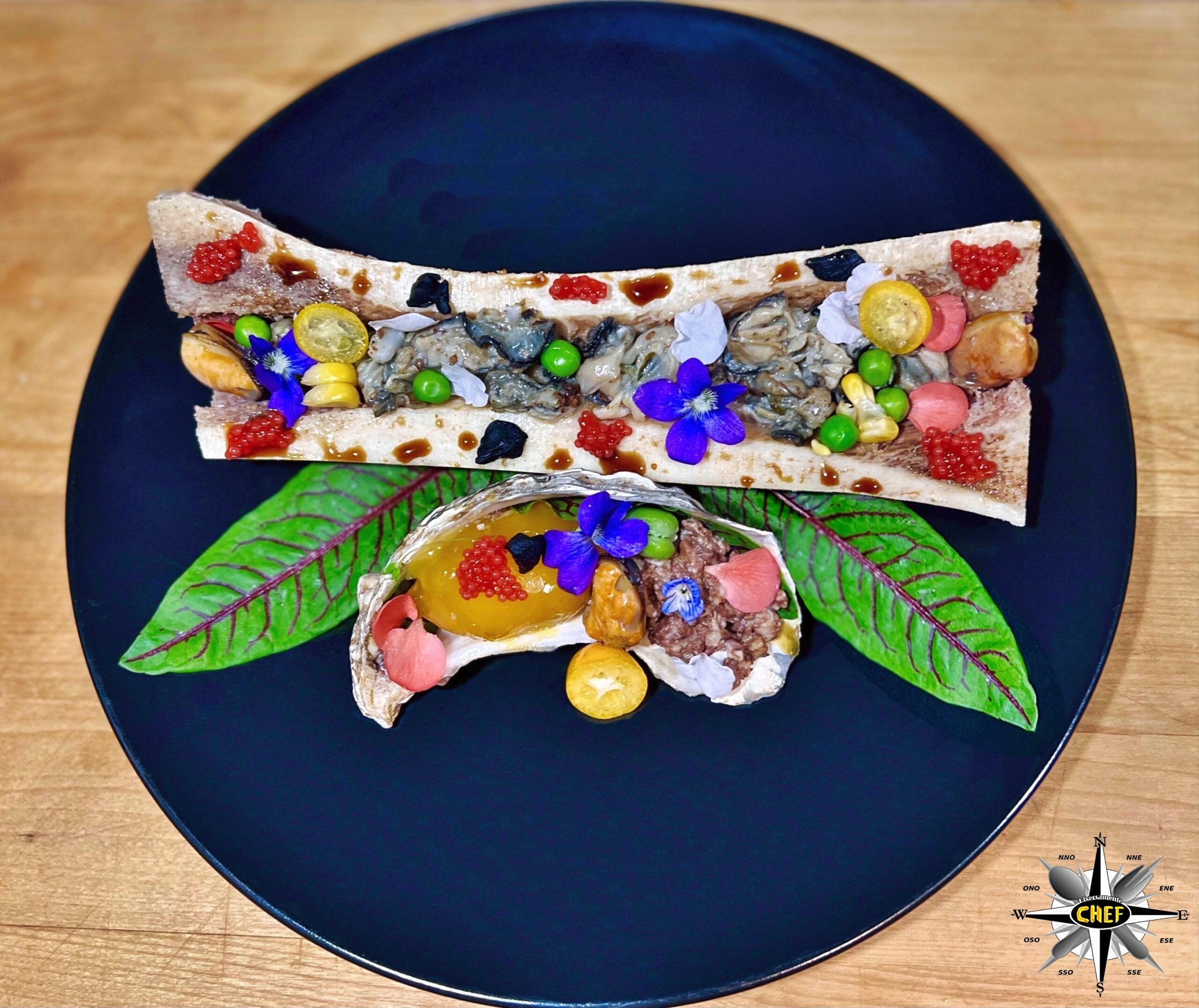 Deporre le ostriche tagliuzzate nell’incavo dell’osso, concentrate nella parte centrale, deponendo due cozze alle estremità e gli altri elementi decorativi (kumquat, piselli, mais, capelin, salsa teriyaki e aglio nero) tra le ostriche e lungo i bordi dello ossa.