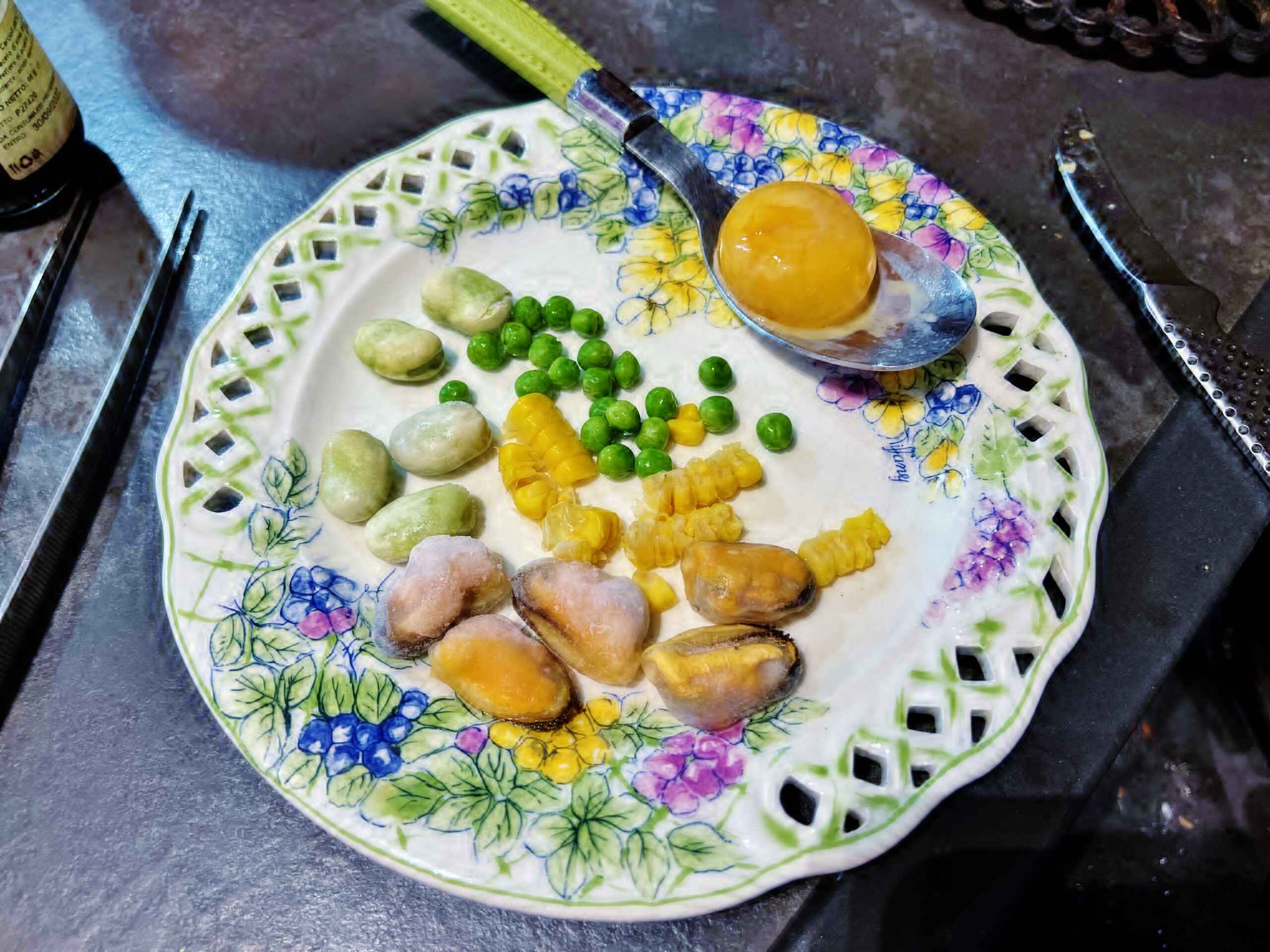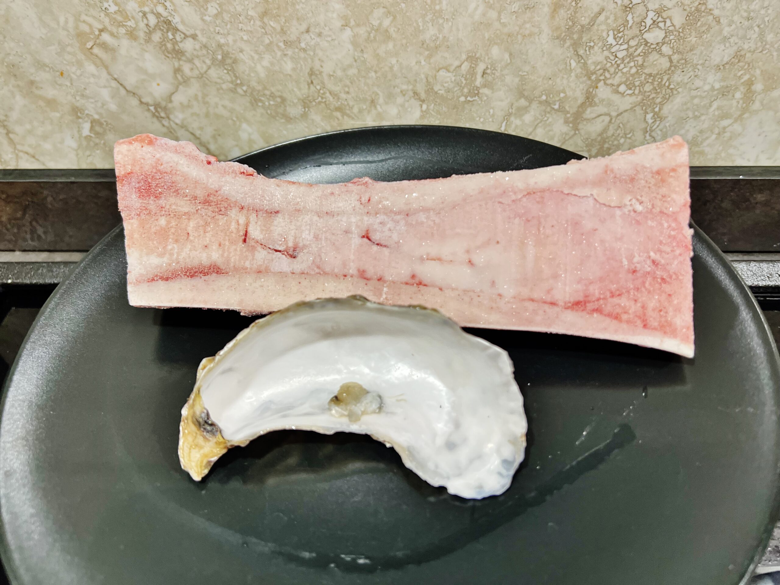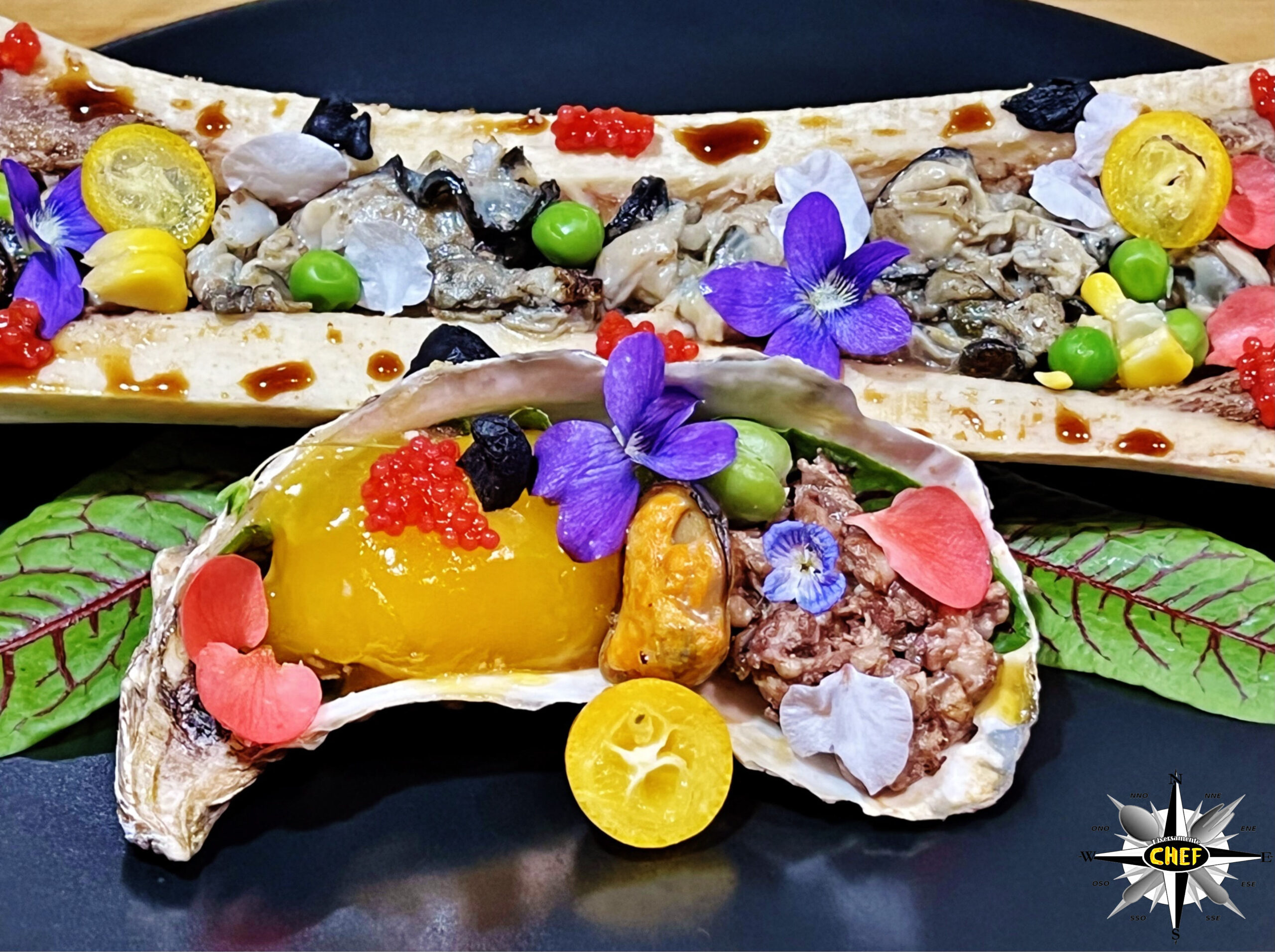 Deporre le ostriche tagliuzzate nell’incavo dell’osso, concentrate nella parte centrale, deponendo due cozze alle estremità e gli altri elementi decorativi (kumquat, piselli, mais, capelin, salsa teriyaki e aglio nero) tra le ostriche e lungo i bordi dello ossa.
