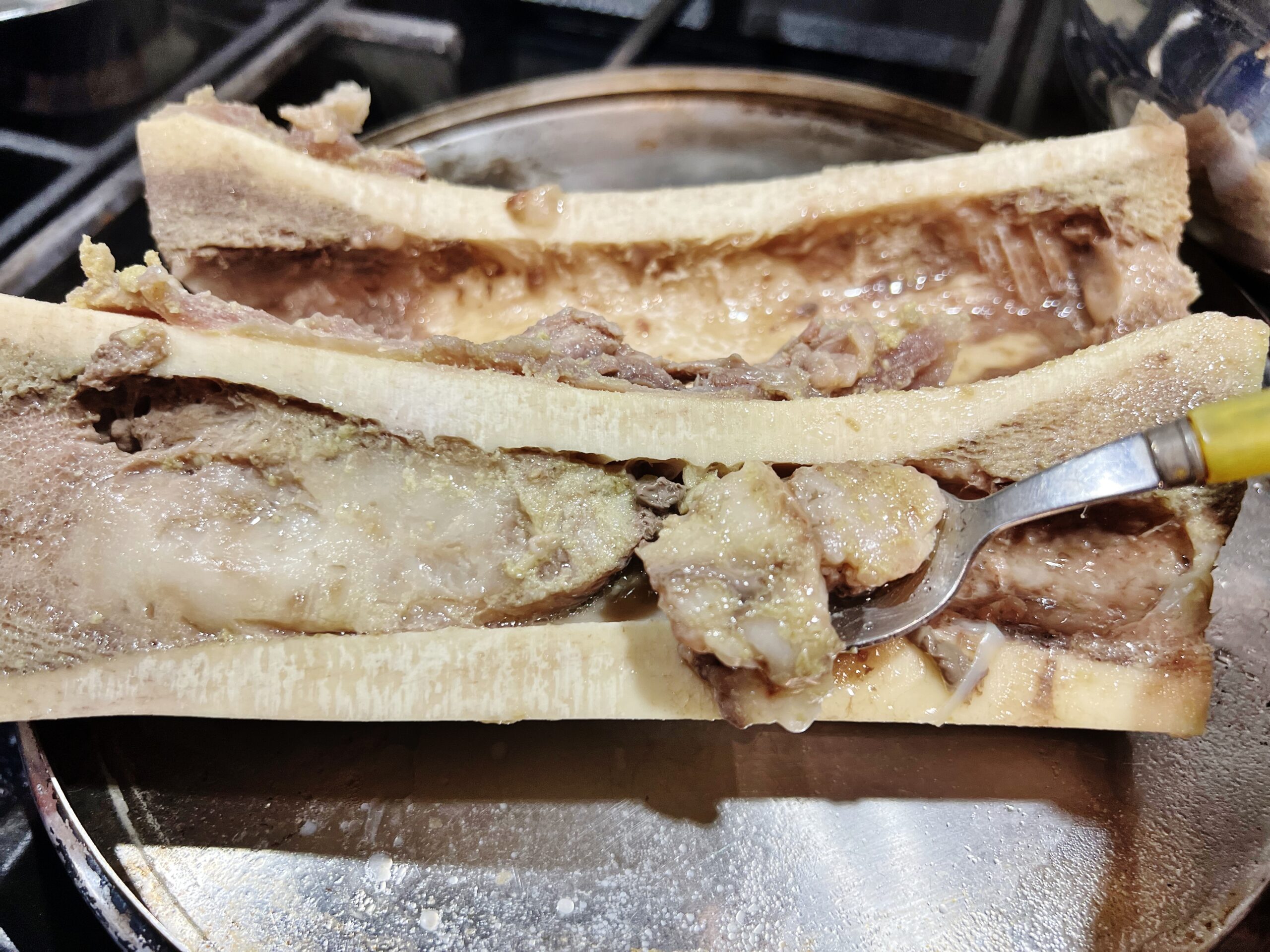 Togliere le ossa e con un cucchiaino estrarre accuratamente il midollo, trasferendo il contenuto in una boule di vetro.