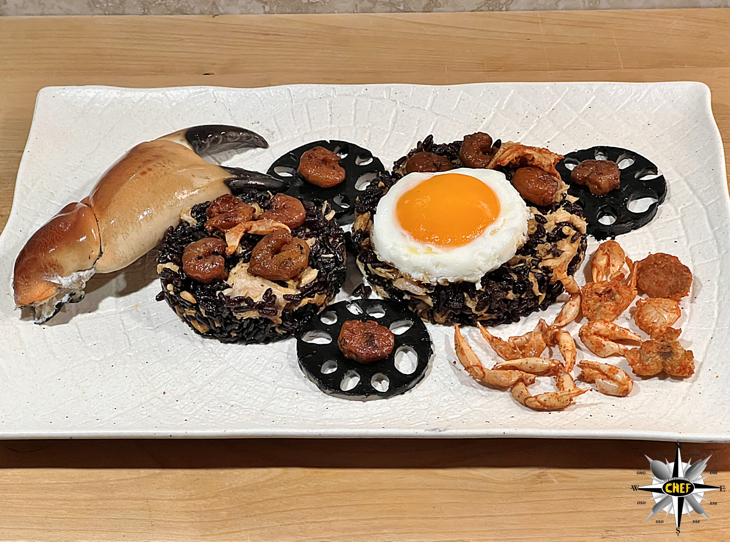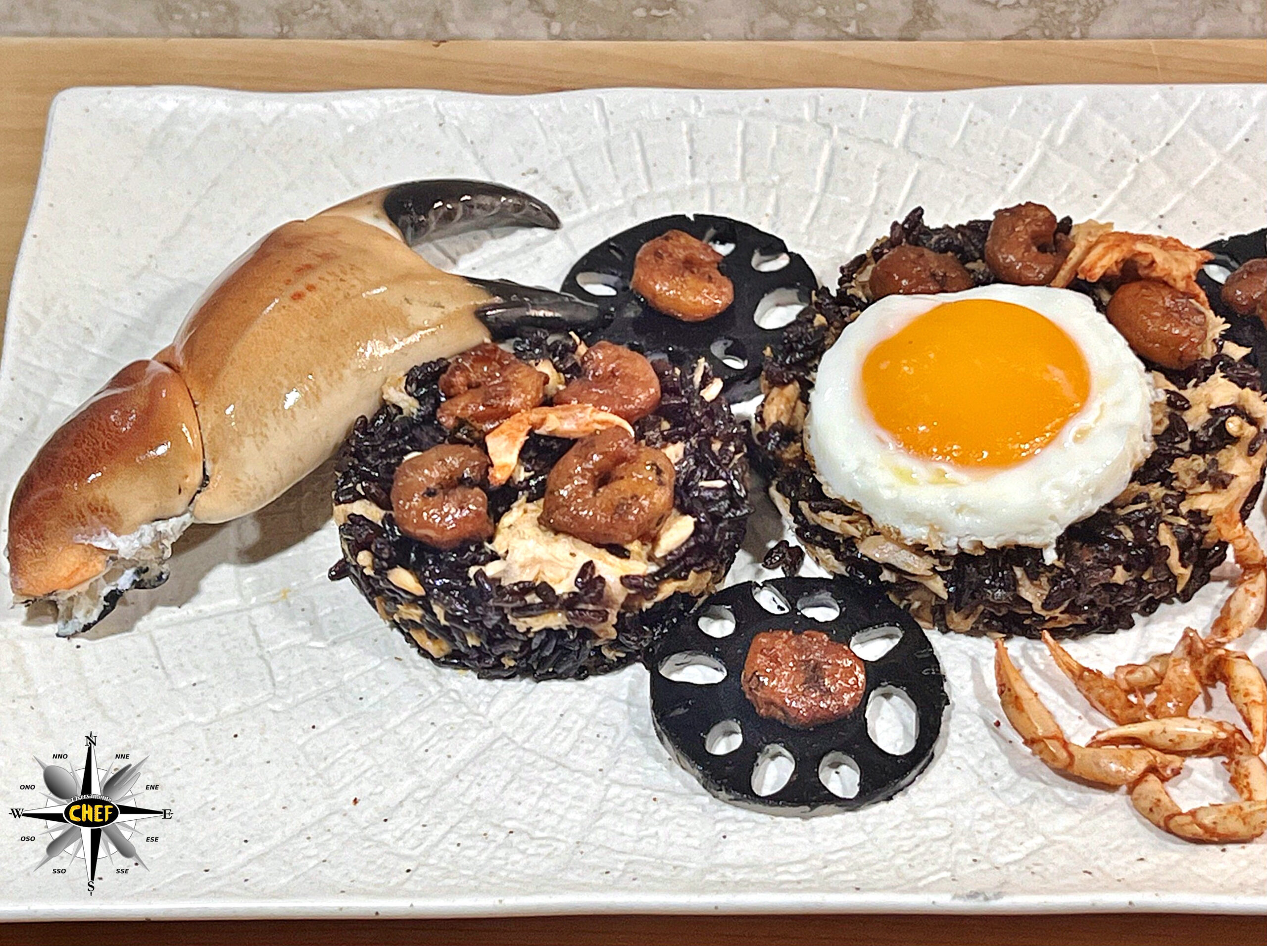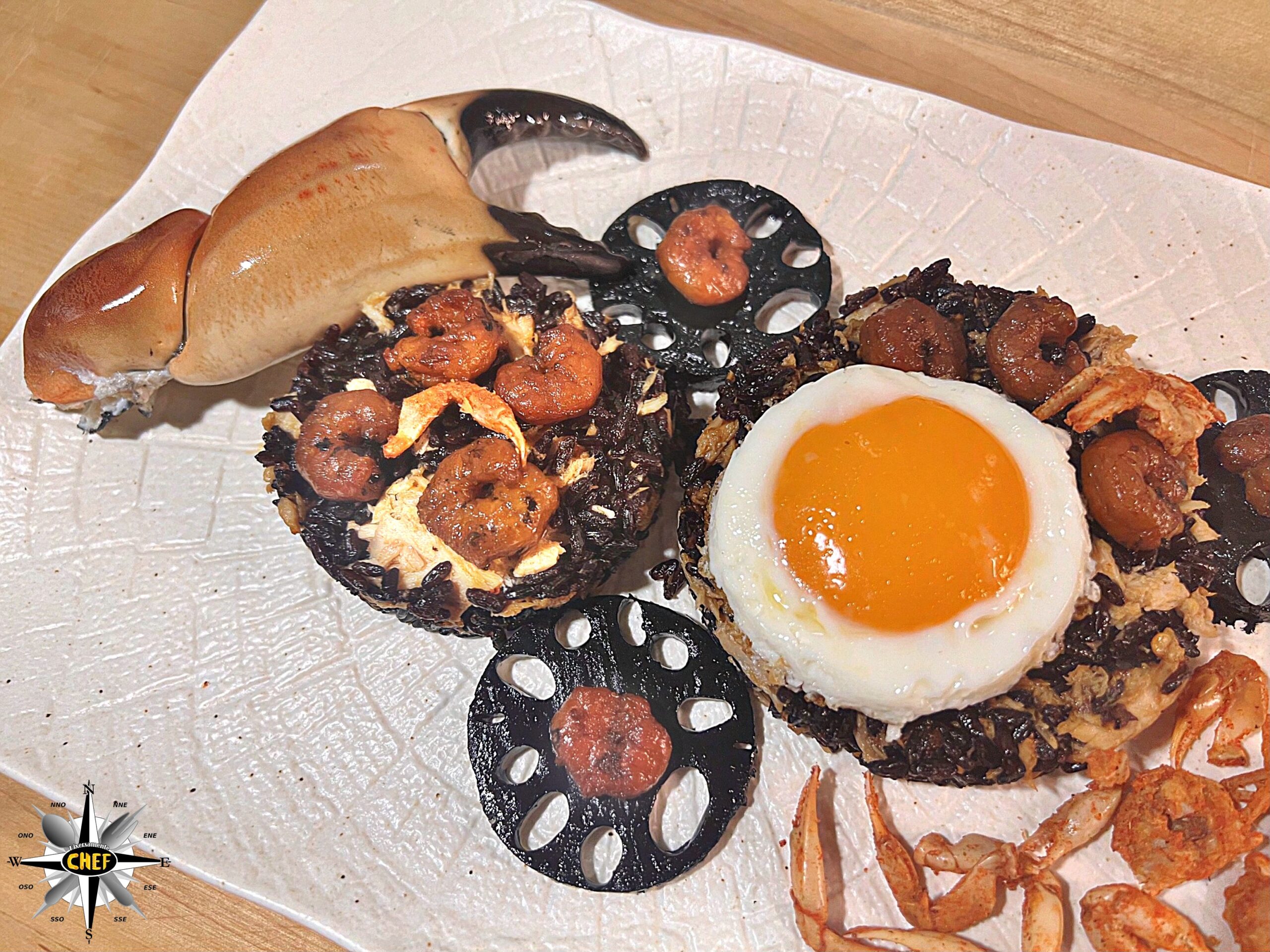 Inserire l’uovo fritto sul disco più grande, assieme ad alcuni gamberetti e una chela di mini granchio, come in quello di sinistra senza uovo.