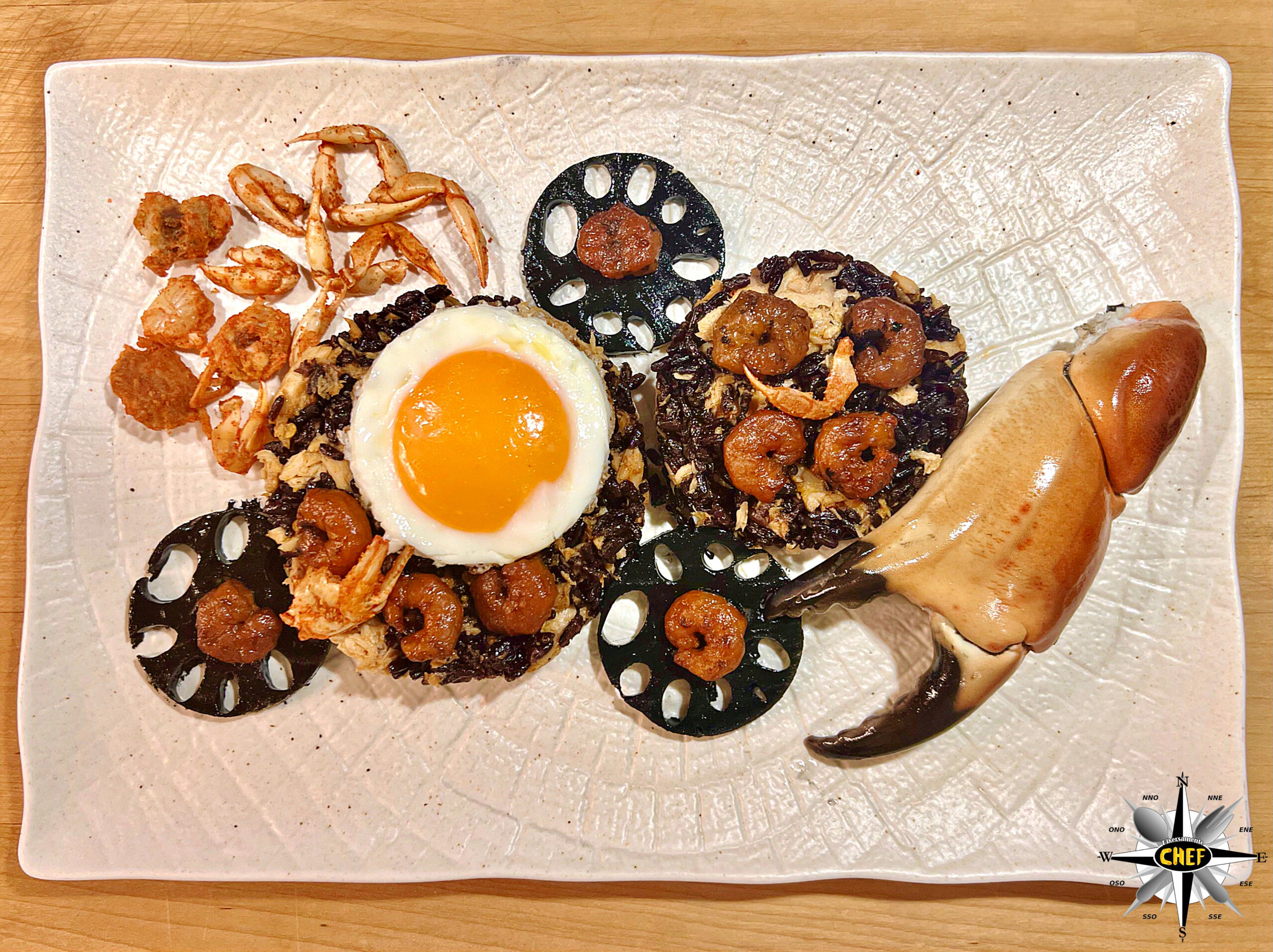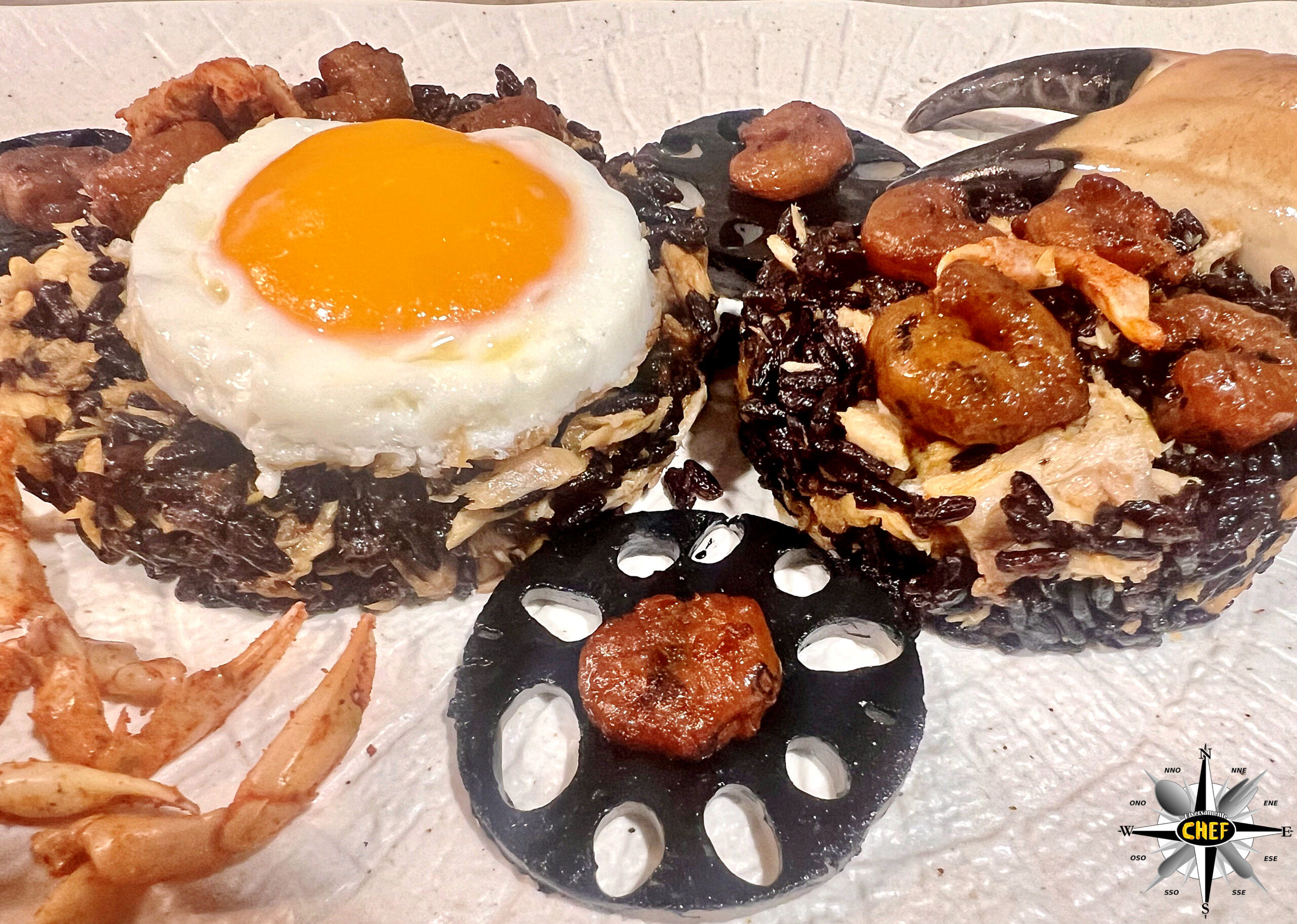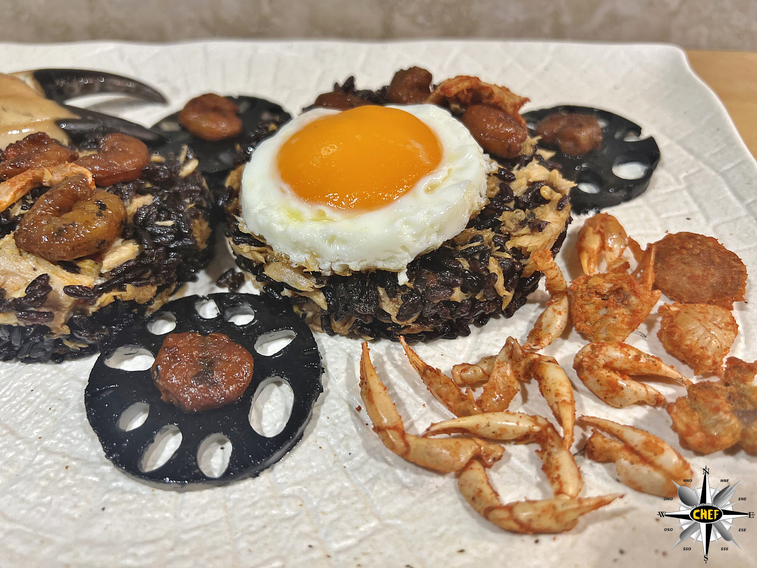 Per la nostra versione gourmet di “Nasi goreng: riso fritto indonesiano con craby krips, tonno e sambal terasi” abbiamo sostituito il classico riso bianco con del riso nero indonesiano (ketan hitam) e, oltre al Sambal terasi, aggiunto altri due condimenti tipici come la Bamboe spice mix e il Terasi udang.
