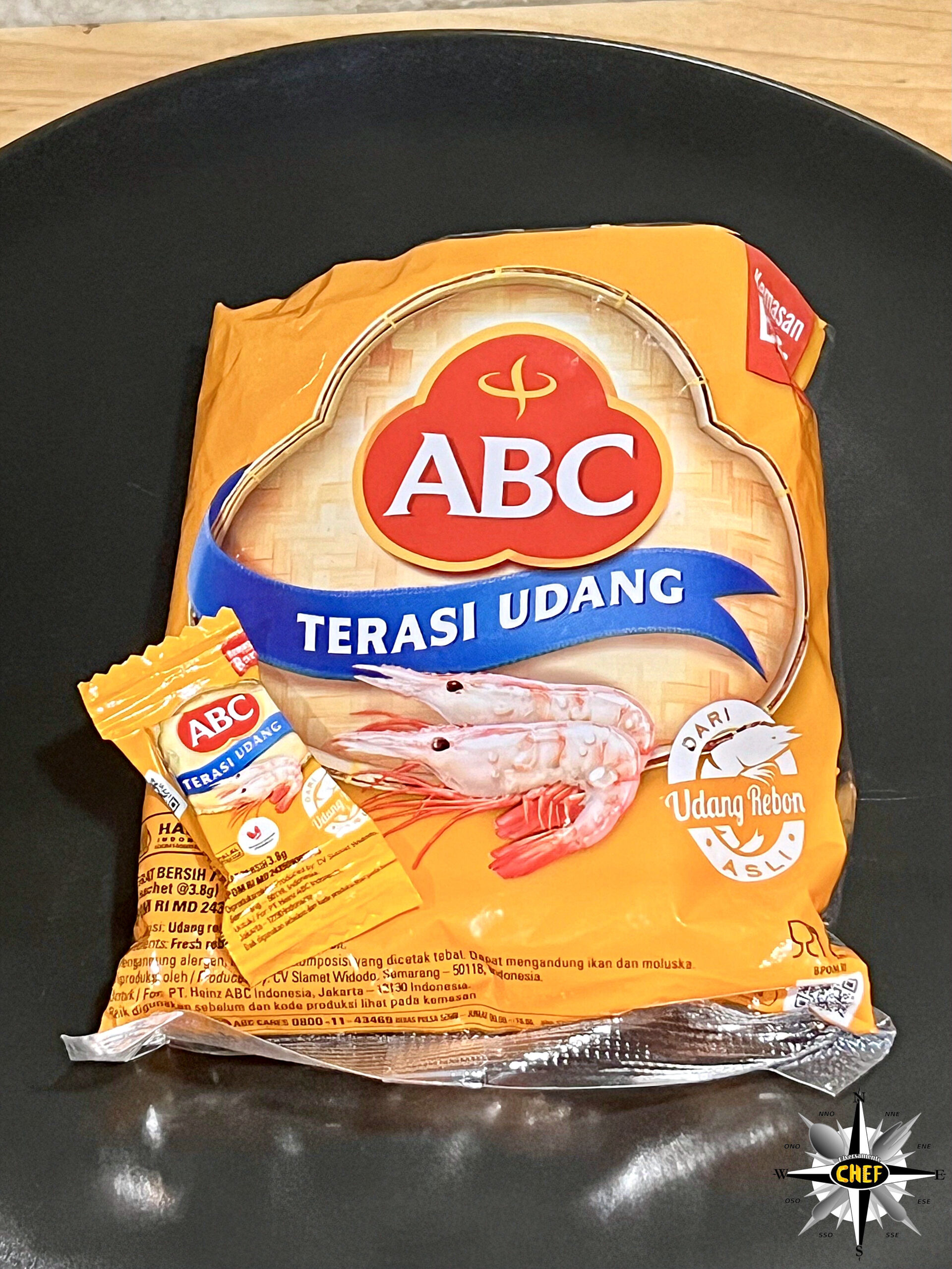 Iniziare quindi la cottura versando progressivamente acqua bollente assieme a due bustine di Terasi udang e, quando le tavolette a base di gamberetti sono completamente sciolte, aggiungere il Sambal terasi, una salsa molto diffusa in tutta l’Indonesia formata da una miscela piccante a base di spezie, peperoncino, aglio, scalogno, pasta di gamberetti, zenzero, zucchero di palma e succo di lime.