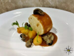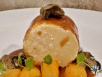 Adagiare sulla salsa la “forma” di parmigiano, posizionata verticalmente, i cubotti di zucca e le ostriche. Spennellare con la riduzione di vino cotto il bordo circolare del parmigiano, aggiungere un’ostrica sulla sommità e alcuni ciuffetti di germogli di piselli fresco, e i “63 mesi di Parmigiano con riduzione di vino cotto, ostriche e cubotti di zucca” sono pronti.