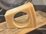 Tagliare il parmigiano con un coppapasta di medie dimensioni  (3/4 cm), prestando attenzione a preservare l’integrità dei bordi del cilindro ottenuto, la cui forma ricorda quella classica del parmigiano.