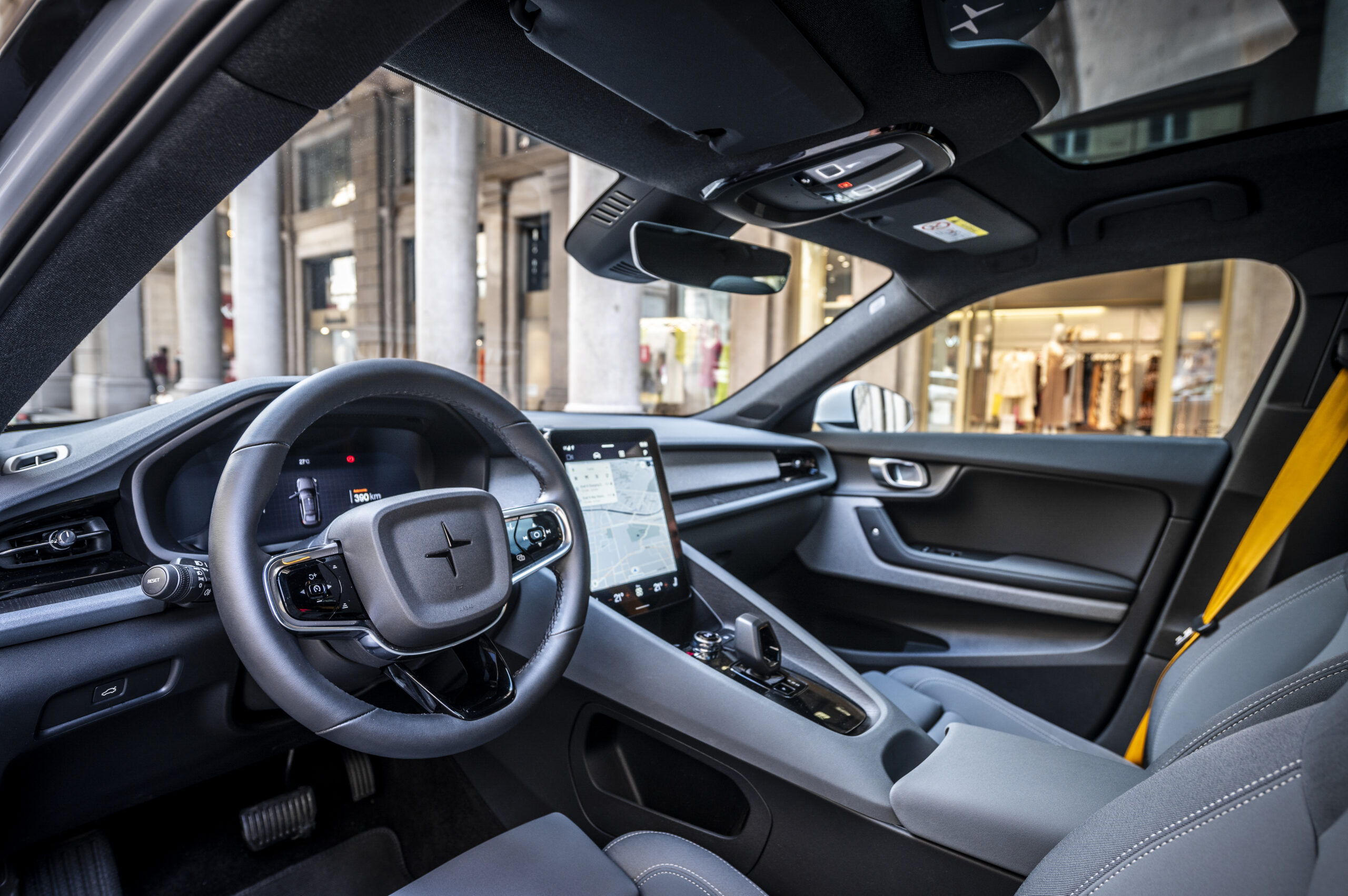 Gli interni trasmettono una sensazione di sobrietà e di alta qualità. Polestar è riuscita a renderla lussuosa senza dover rivestire tutto in pelle e carbonio. Il packaging, che utilizza materiali riciclati, è interamente ecocompatibile e rispettoso dell’ambiente. L’atmosfera a bordo è serena, inondata di luce naturale grazie ad un enorme tetto panoramico, mentre durante la guida serale, l’ambiente è illuminato con luci led soffusi perimetrali.