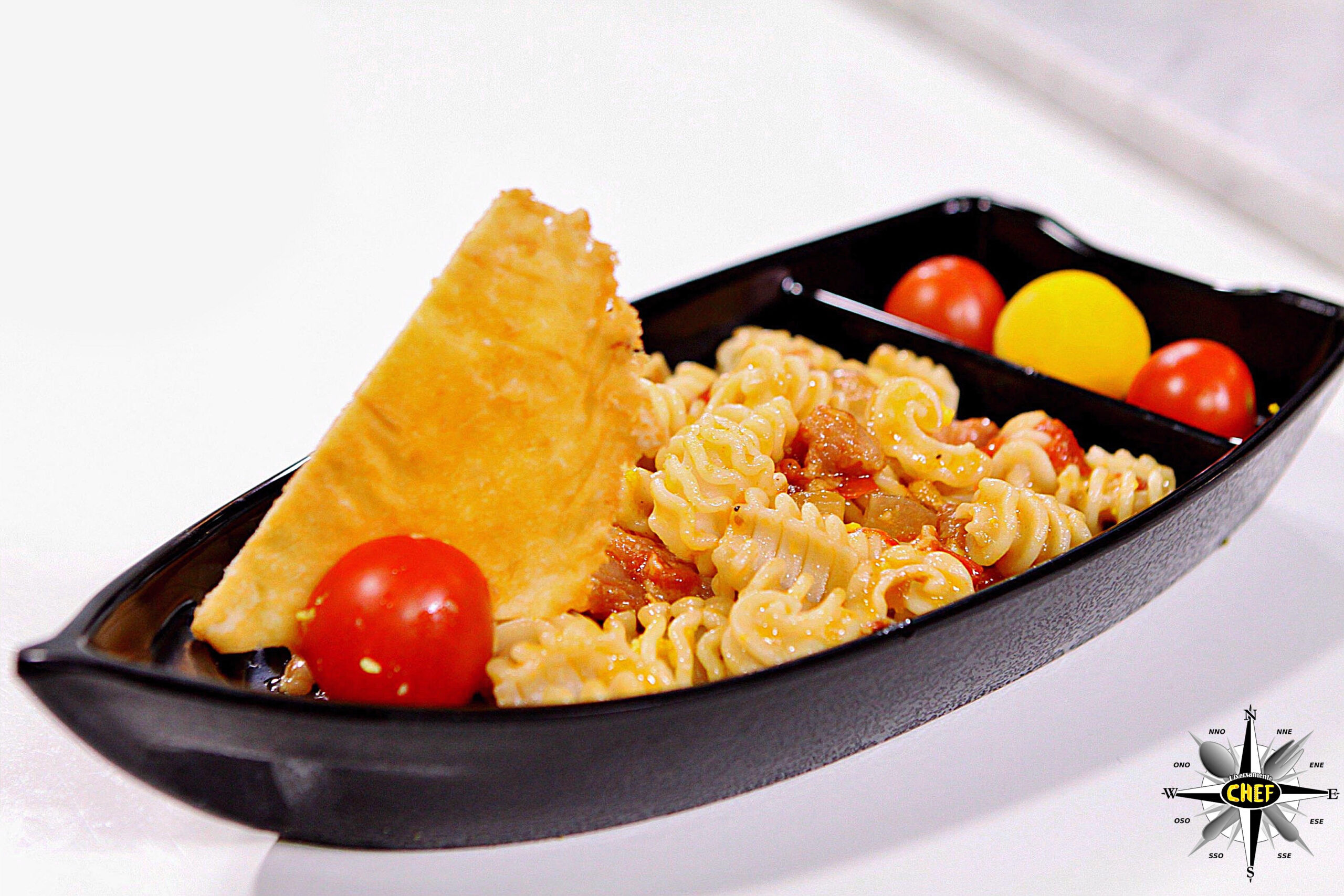 Riempire la parte anteriore della “barca” con i radiatori abbondantemente conditi, e posizionare la vela di parmigiano nell’angolo di prua, affiancato da un pomodorino.