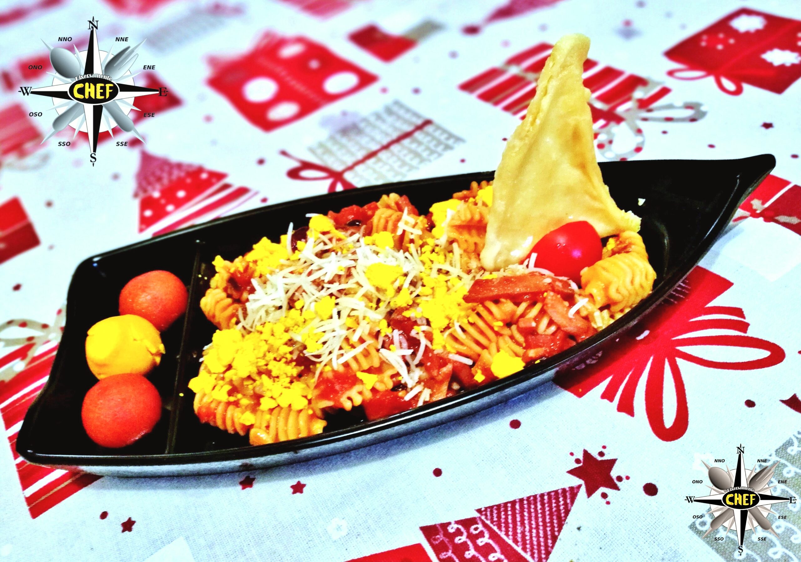 Per l’impiattamento dei “Radiatori alla carbotriciana con polvere di porcino” la scelta più adeguata non poteva che ricadere su un piatto a forma di barca, utilizzato normalmente per servire il sushi.